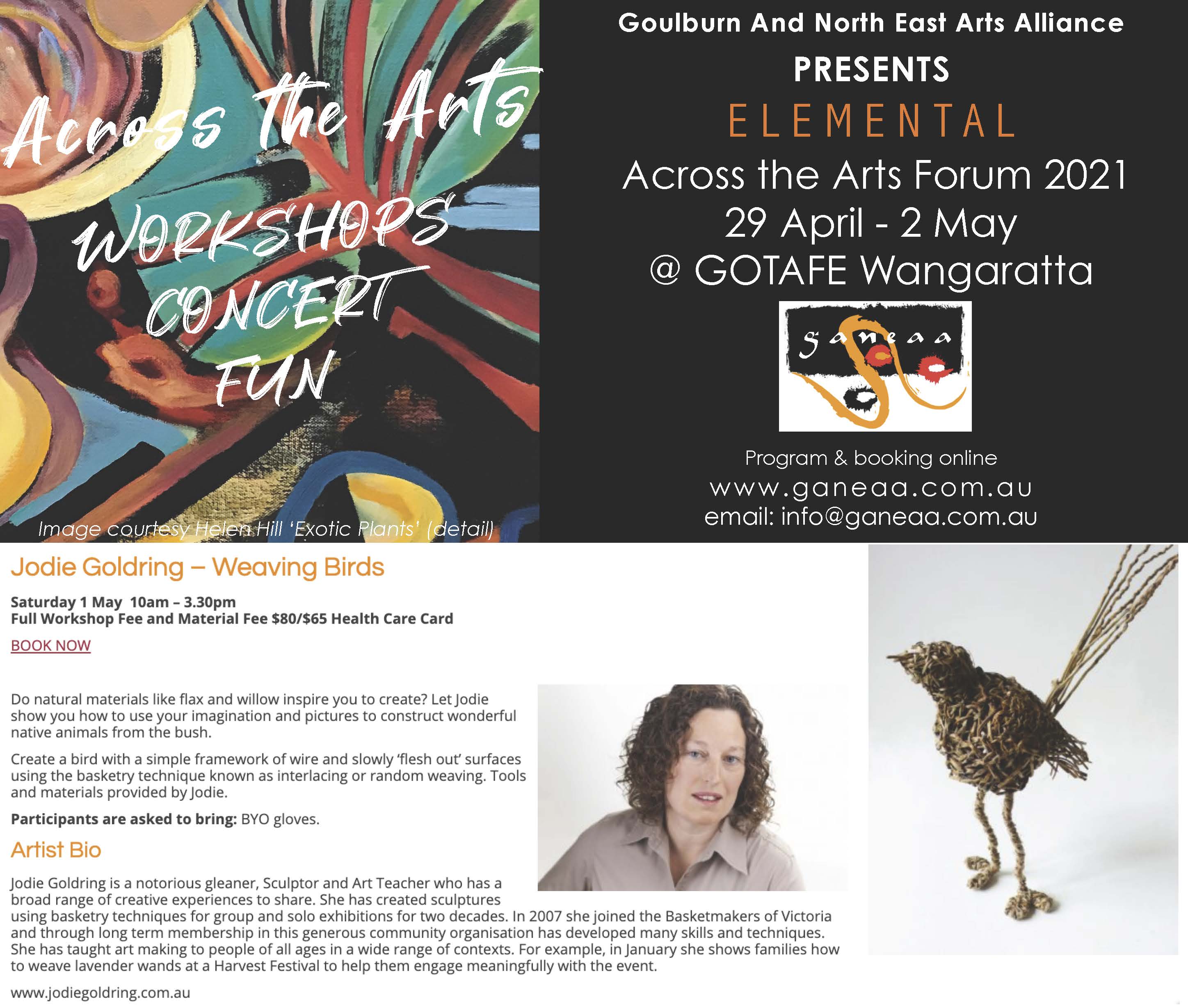 I am off to Wangaratta on Friday April 23 to help a group of weavers create a community artwork for Across the Arts. The community artwork is a pair of platypuses that will be woven the week leading up to and then displayed during the Arts Festival. On Saturday May 1 & Sunday May 2 I am facilitating all days workshops, helping participants weave smaller works (birds and platypuses) that they can take home. I also have fibre artworks in the exhibition called Elemental that is associated with the festival, held at Bainz Gallery in Wangaratta until May 2.