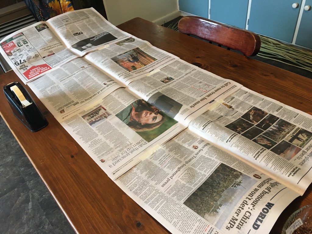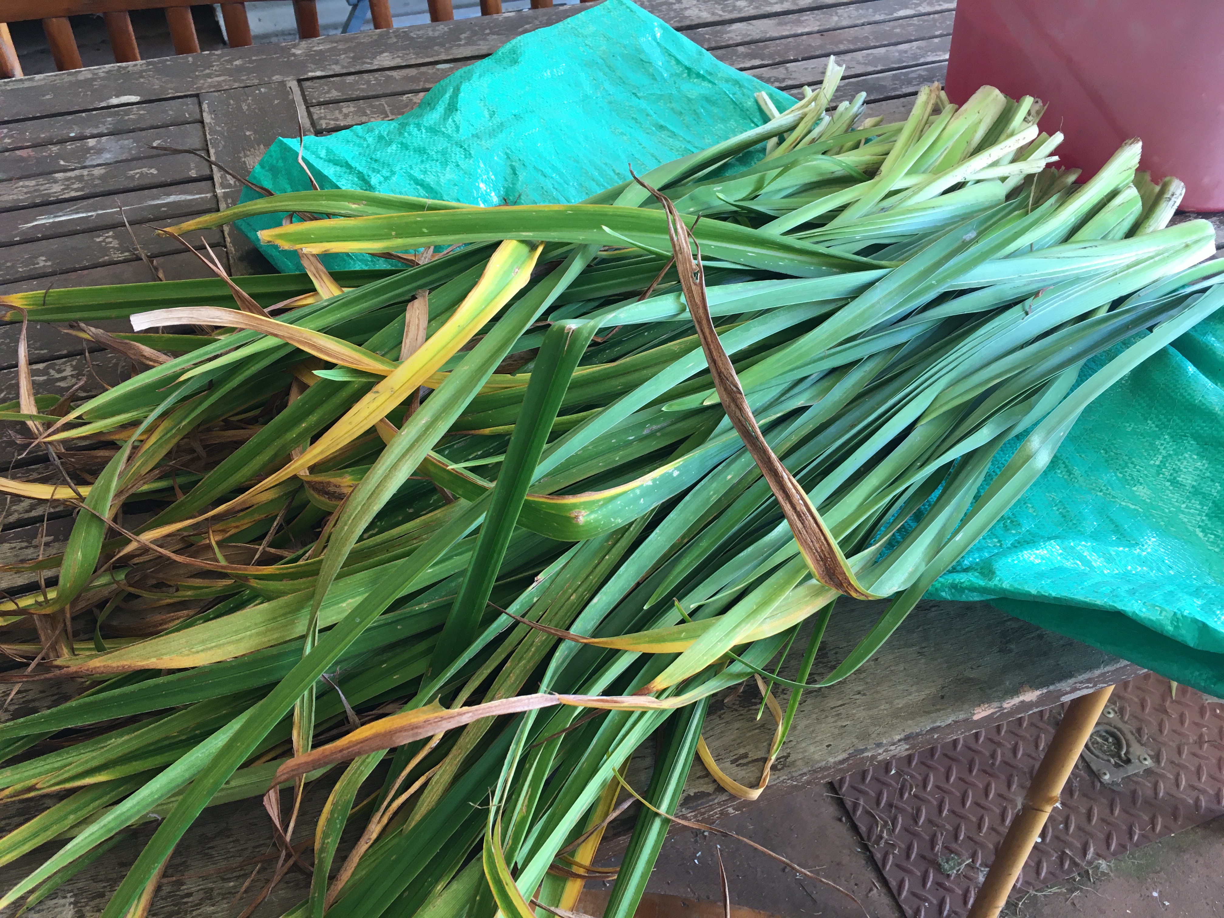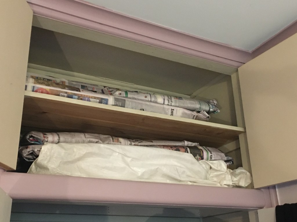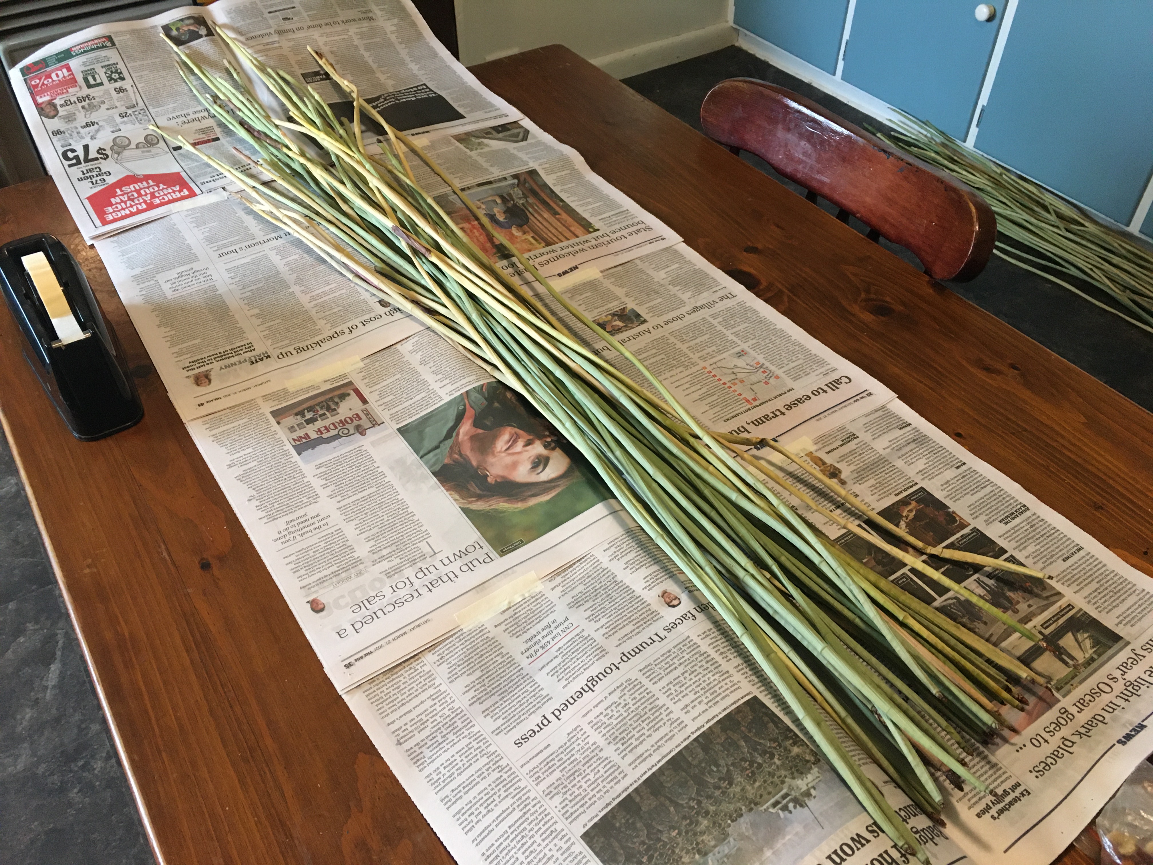 Over the last couple of months I have been storing large quantities of natural plant fibre that has been drying in my shed over summer. Some of it has been hanging from the rafters in bunches of 25 leaves. Other leaves have been laying on racks to dry (turned every few days so they dry evenly and don’t discolour). Once dry, I wrap the plant fibre up in newspaper bundles and store it indoors so that it does not go mouldy in the shed over winter. I am lucky to have a built in wardrobe that has a large cavity to store my basketry materials. It is a dark, dry place that is perfect for the task! I keep a list of whats in my collection, that is updated every time I remove or add fibre so that it is easy to locate when I need it!
