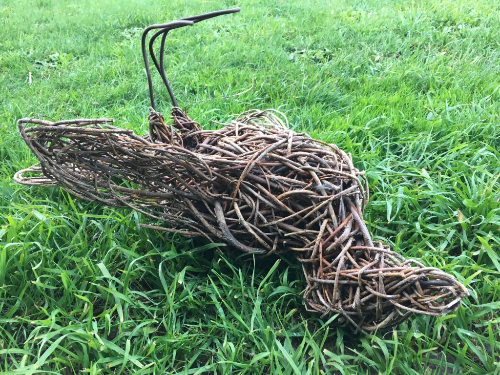 I collect natural plant material with the seasons. Winter is when I take the trailer out into the waterways of the Hepburn Shire and collect wild willow. It stands in buckets of water until I make a sculptural basket or take it to a basketry workshop for participants to weave with. This year I found a patch of golden willow that was a year or two old, with lovely long straight willow osiers that are perfect for weaving. On Saturday September 10, I am facilitating a “Weaving a Garden Fence” workshop when this willow will be used. We last renovated the wild willow decorative fence at the Creswick Neighbourhood Centre in Sep 2019. It lasted 3 years and you can see the effects of the weather on the willow bird, who has been relegated to the compost! I took the fence down and put the willow in the trailer, as you can see it is still in fairly good condition after 3 years of atmospheric wear and tear.