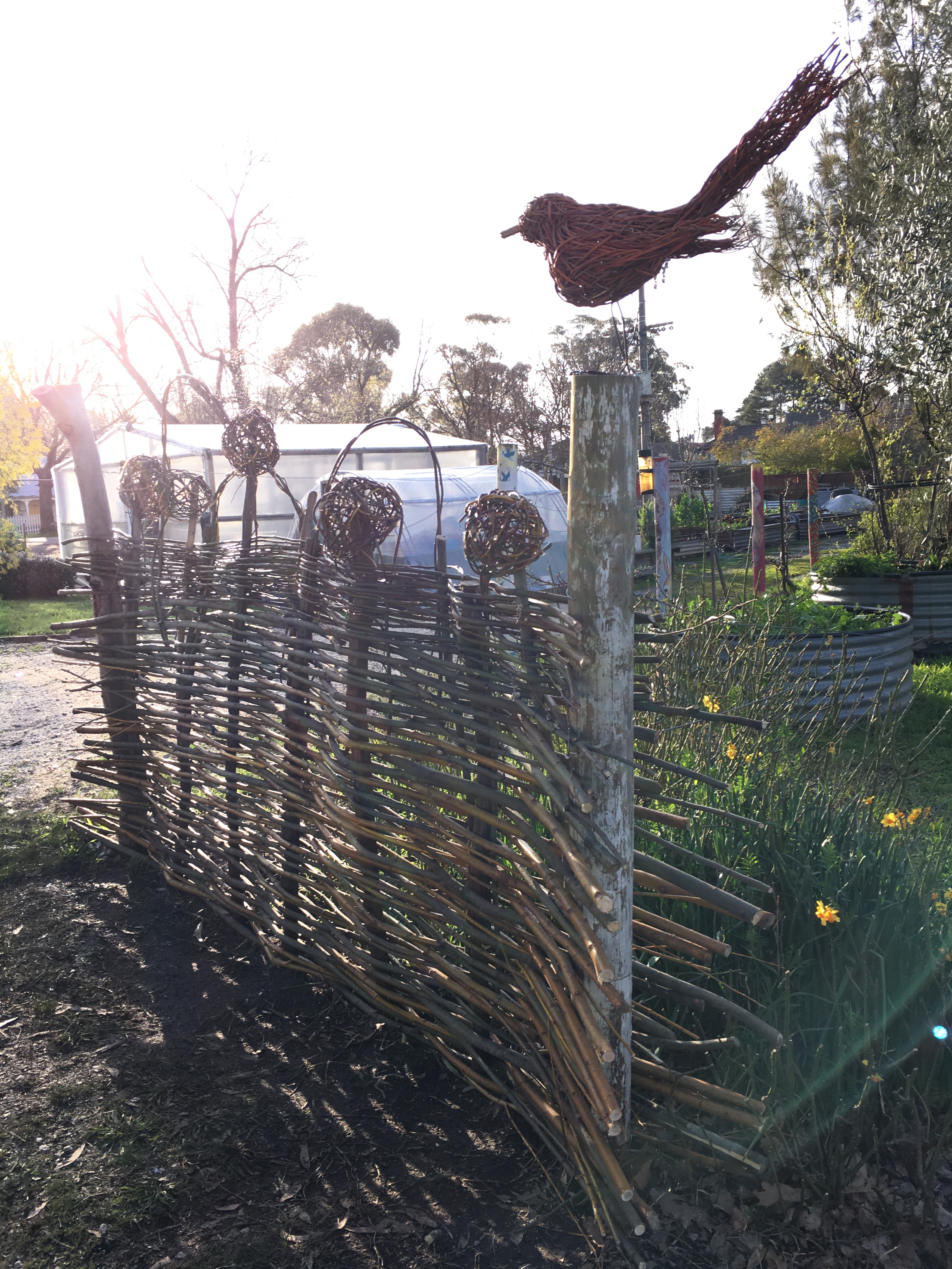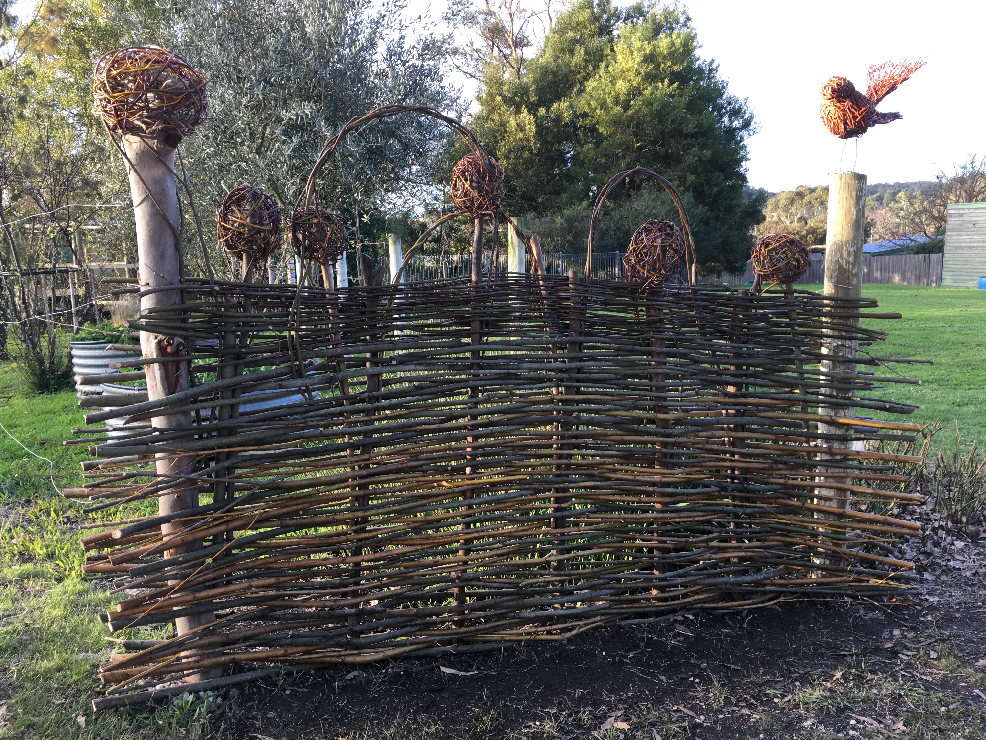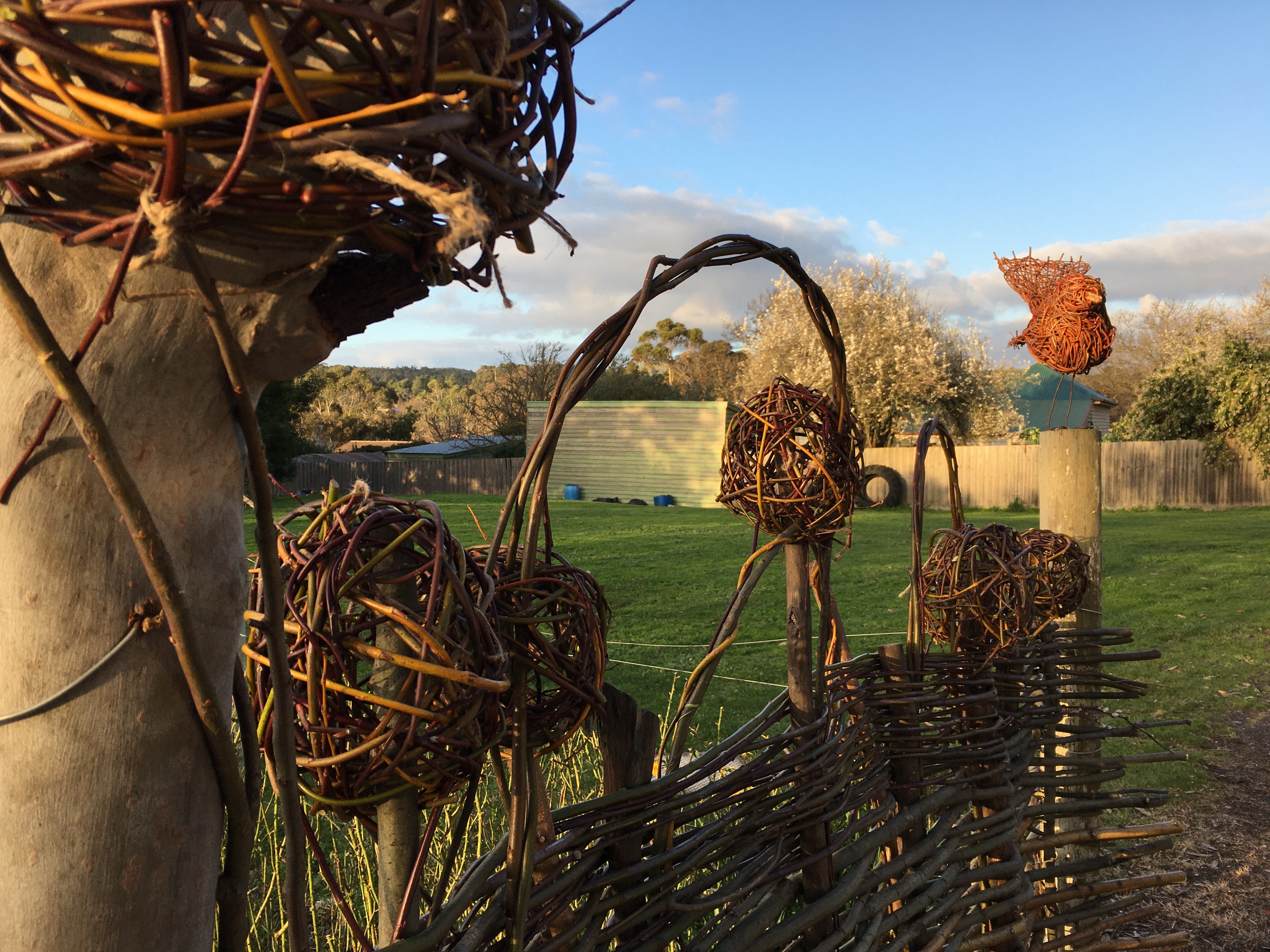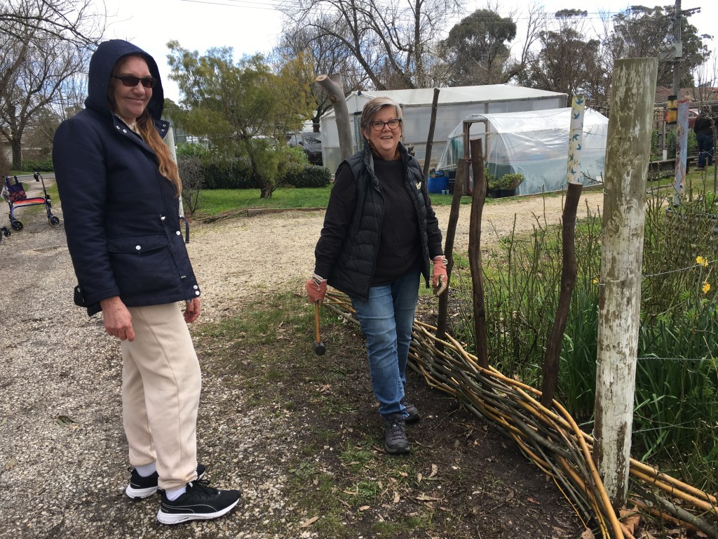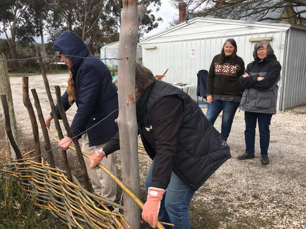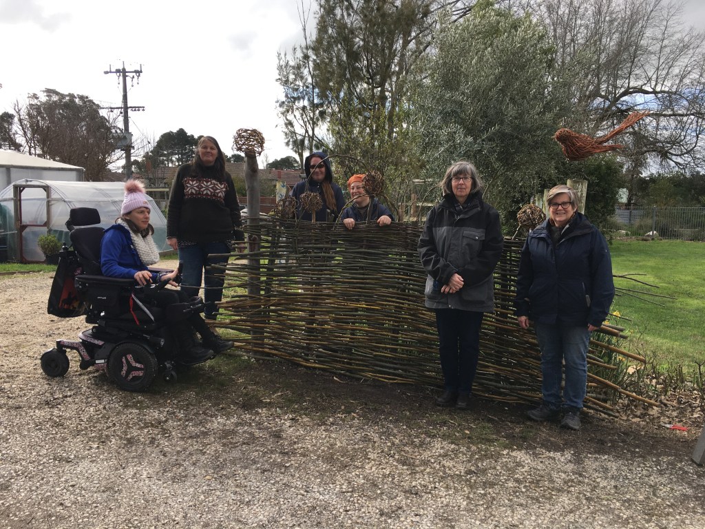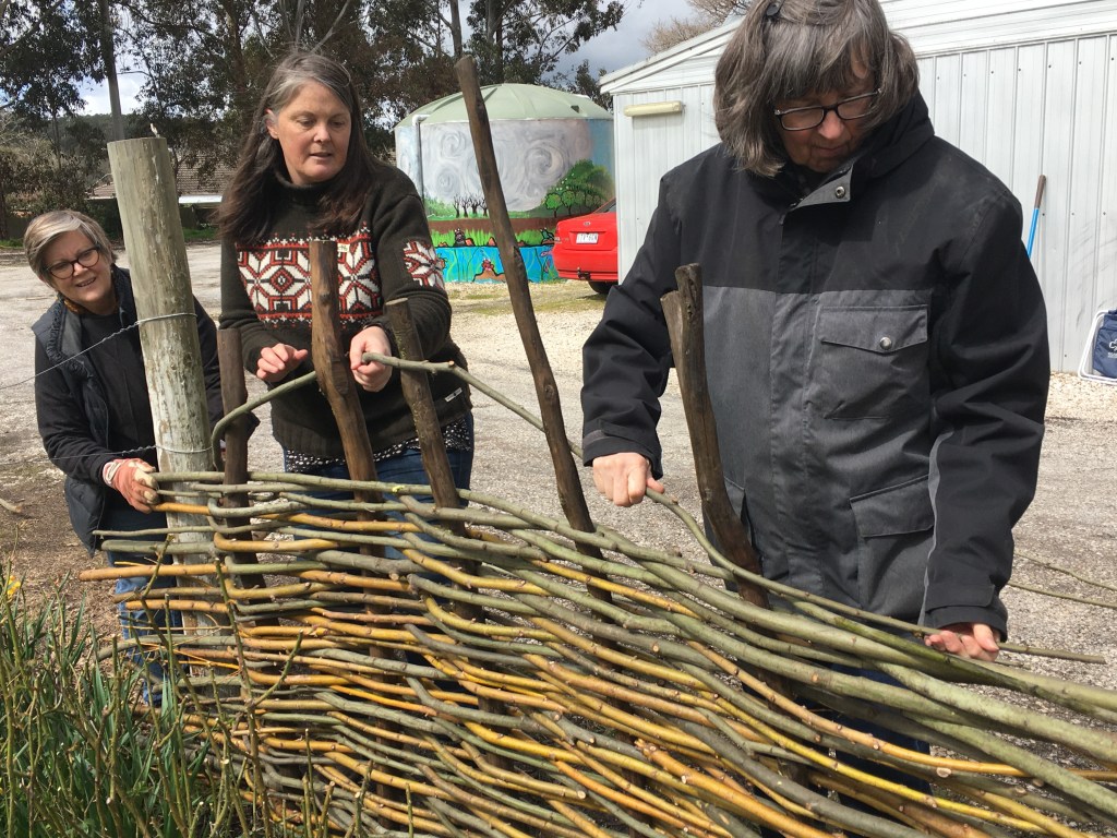 It was so enjoyable to spend an early spring day outdoors (Saturday September 10) to weave a large garden fence and smaller garden borders. There was a small group of us who were keen to get our hands dirty playing with willow at the Creswick Neighbourhood Centre. We were very lucky that the weather stayed dry, and the sun even made an appearance! Check out these photos of the progress throughout the day. Next Spring, I am thinking of running a “Decorative Willow Birds for the Garden” workshop.