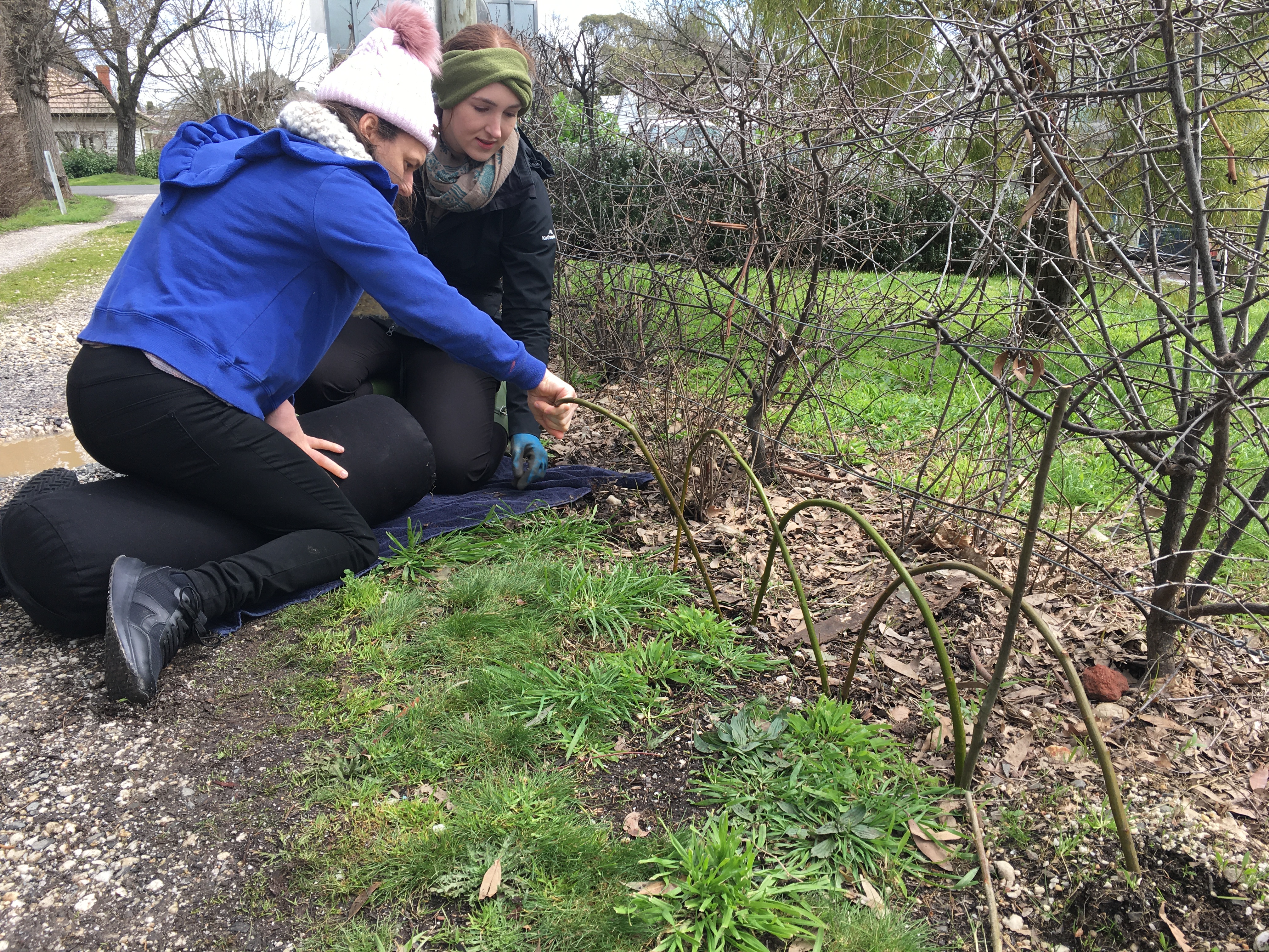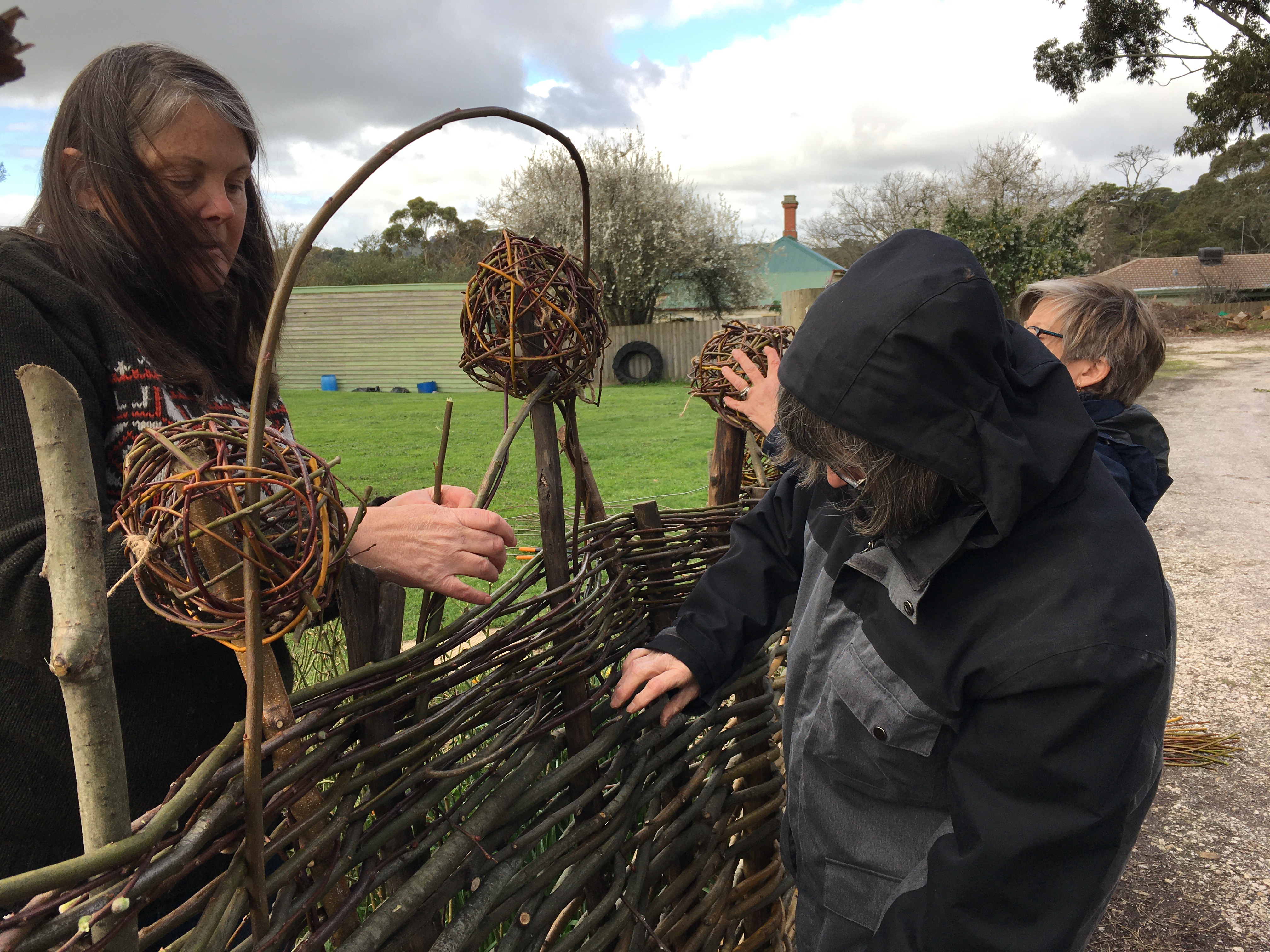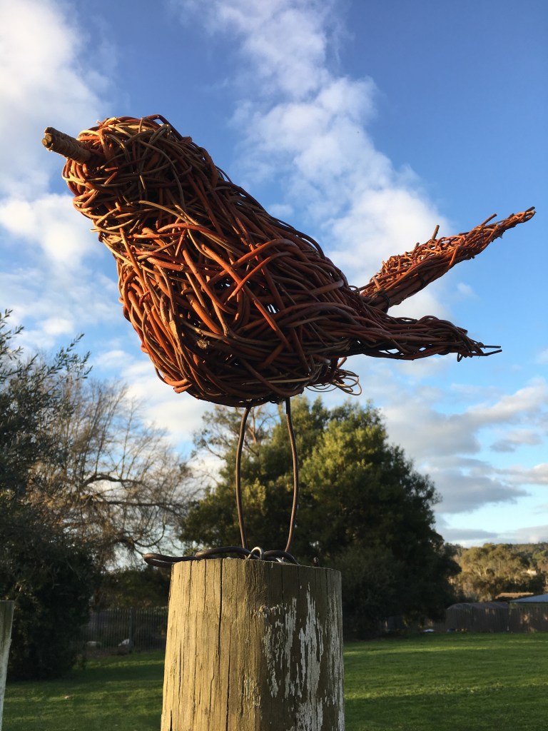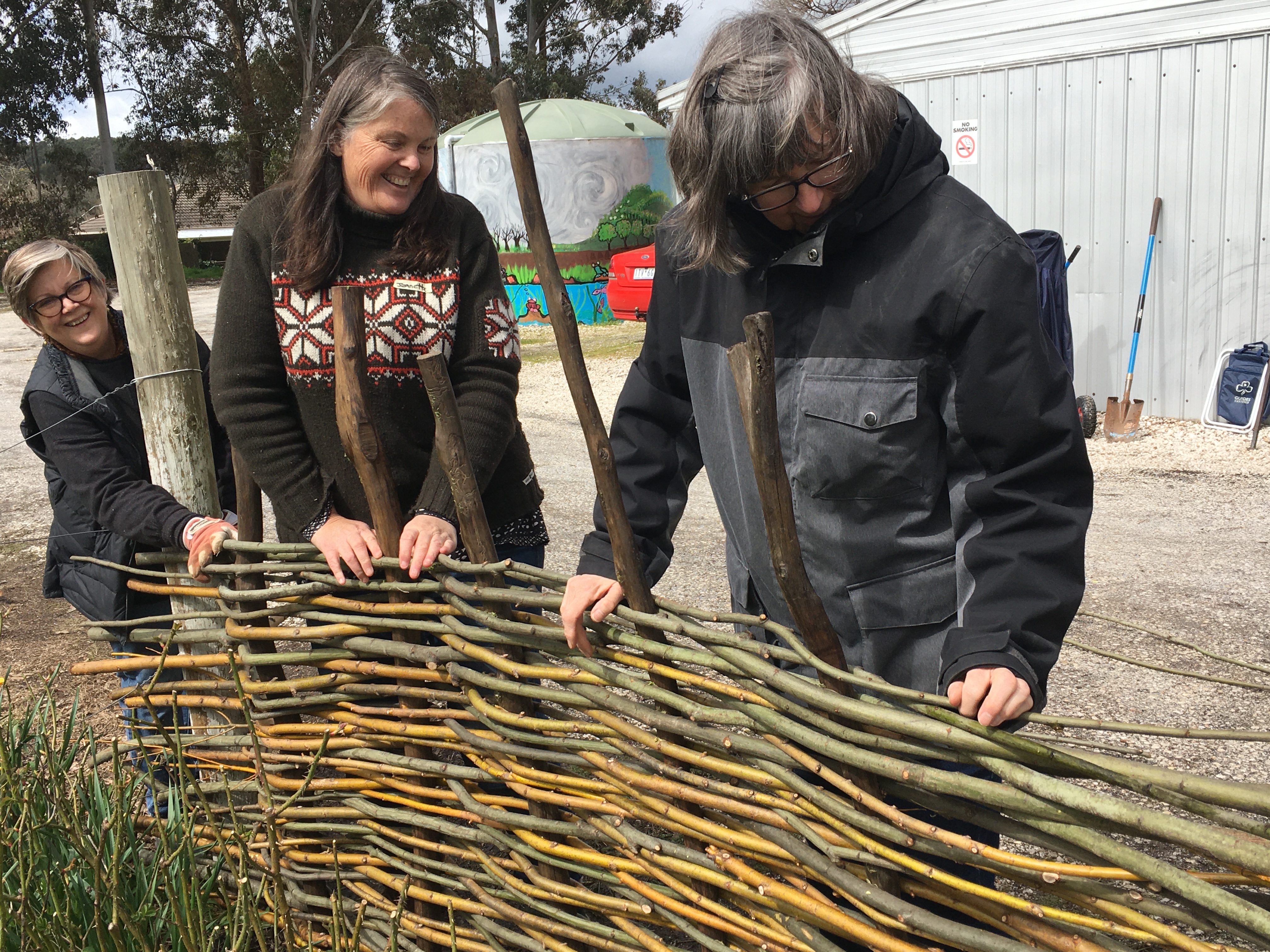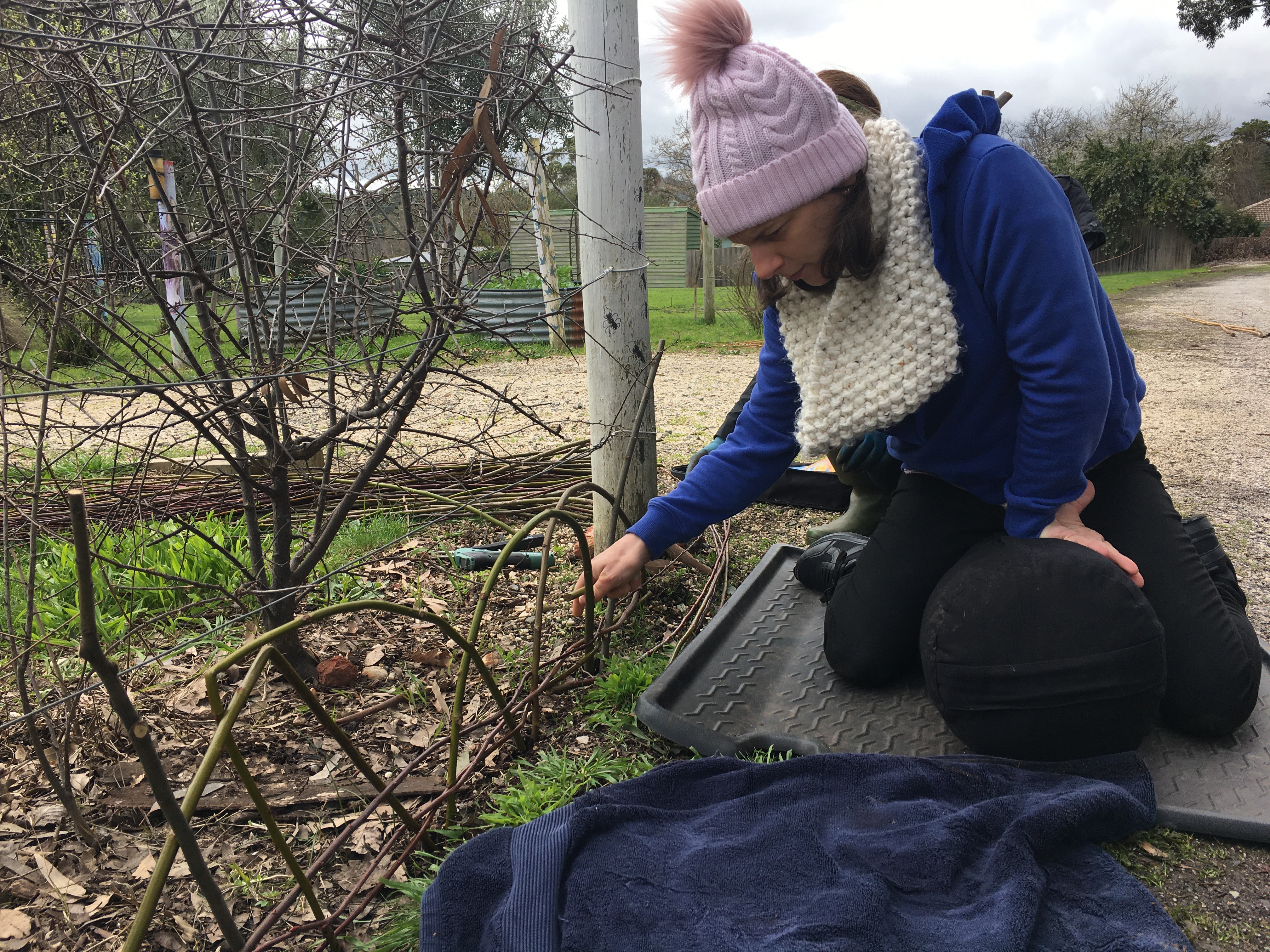 It was so enjoyable to spend an early spring day outdoors (Saturday September 10) to weave a large garden fence and smaller garden borders. There was a small group of us who were keen to get our hands dirty playing with willow at the Creswick Neighbourhood Centre. We were very lucky that the weather stayed dry, and the sun even made an appearance! Check out these photos of the progress throughout the day. Next Spring, I am thinking of running a “Decorative Willow Birds for the Garden” workshop.