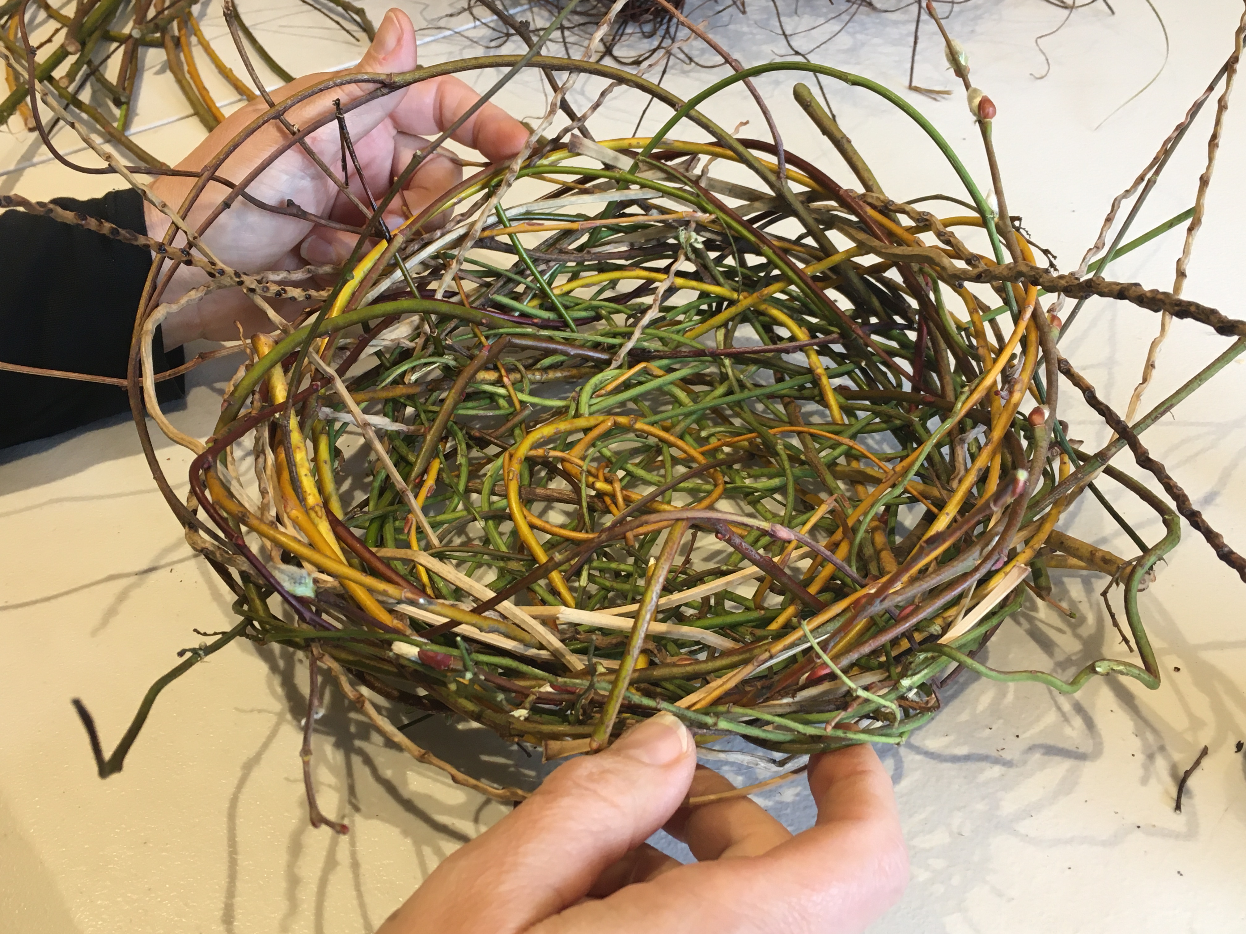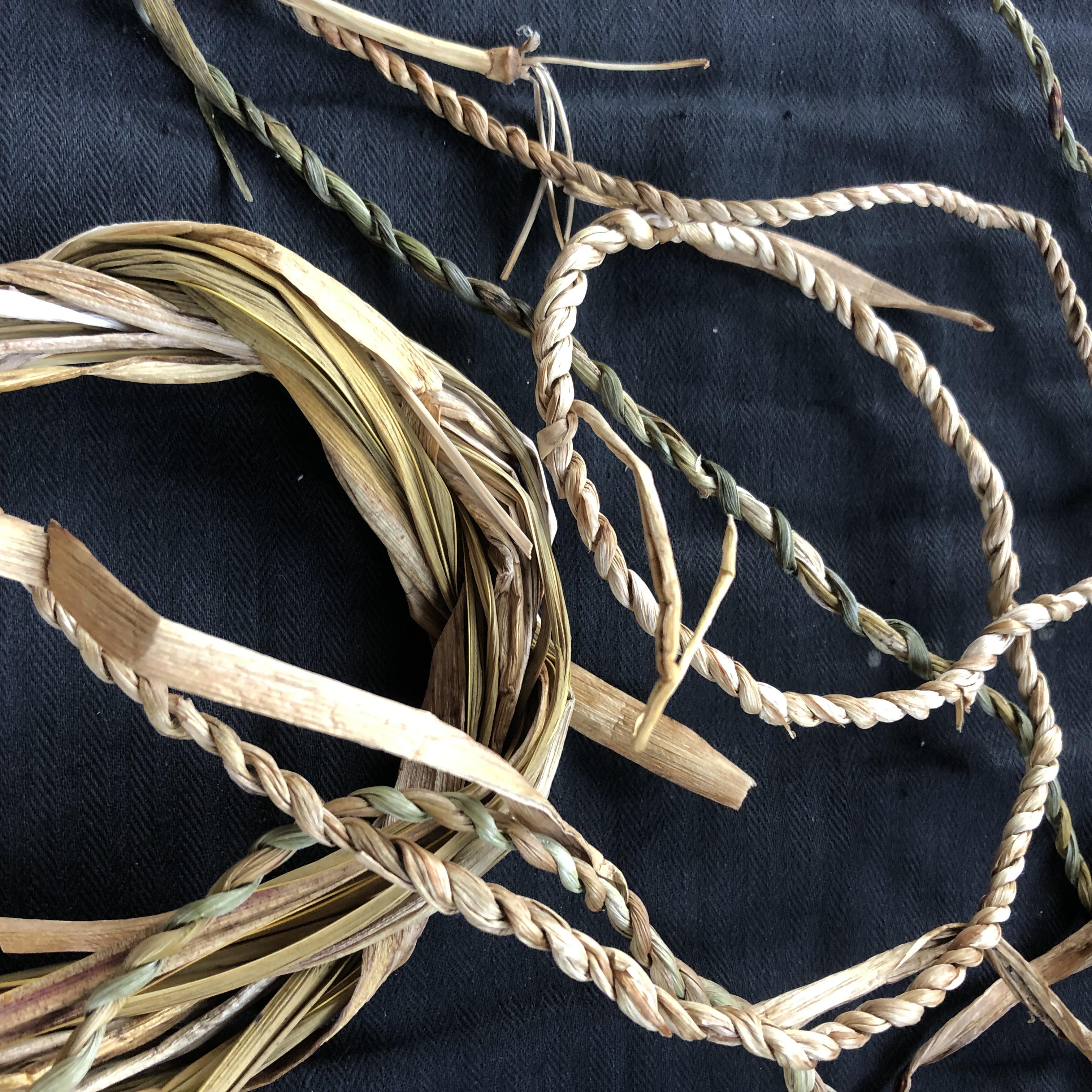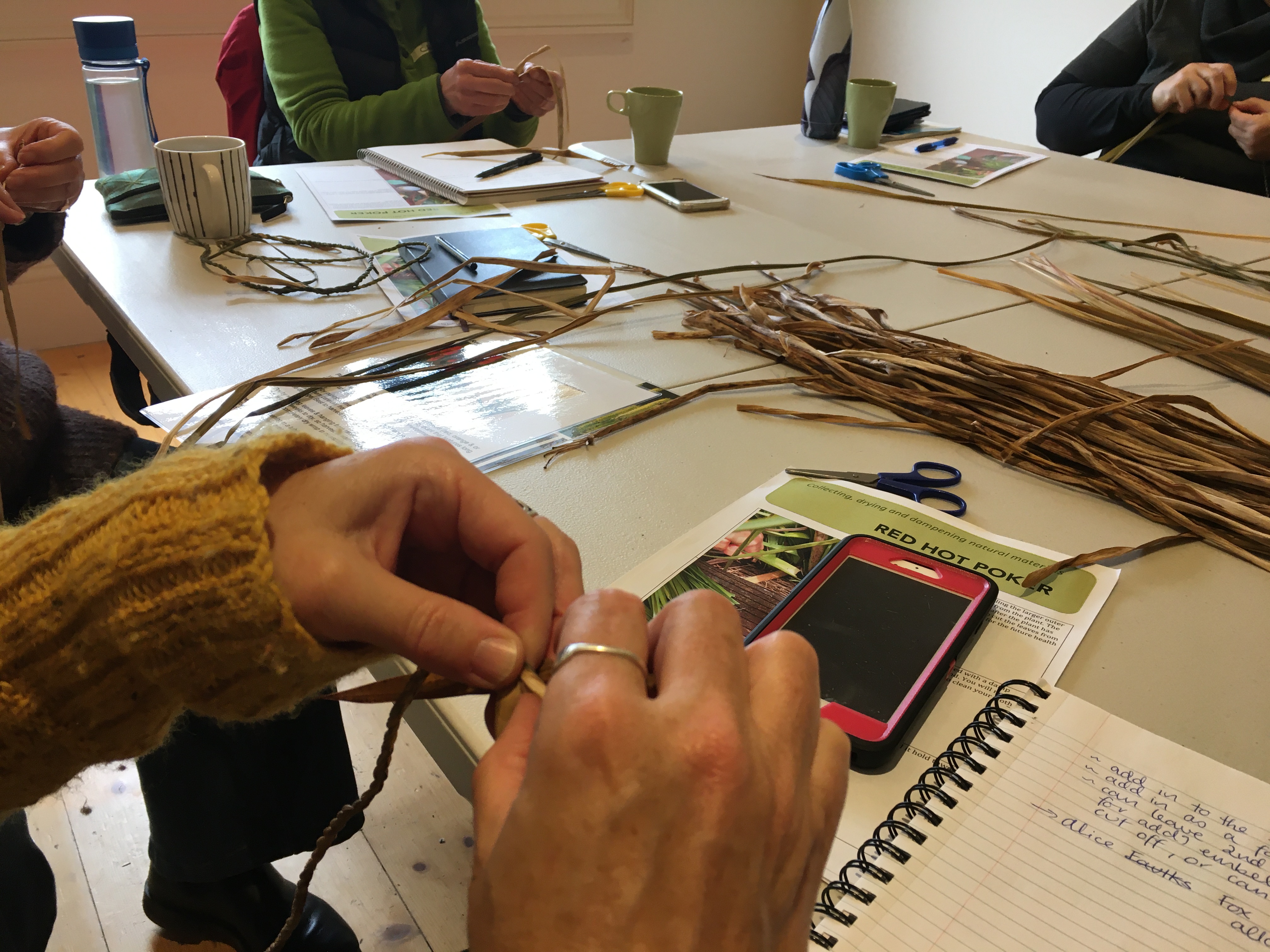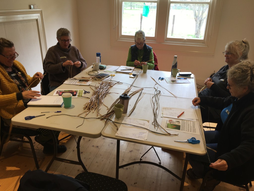 On Sunday (Sep 18), I was at the Newstead Arts Hub with a small group who explored plants that can be used in basketry. I started the day by showing my baskets and talking about the plant fibres that were used to make each one and more importantly why they were used. We then went for a walk around Newstead and viewed relevant plants growing in local gardens. When the rained started, we made our way back to the Hub for a cuppa and string making demonstration. String making is a great way to get a feel for the inherent character of plant fibre. I provided dampened jonquil, red hot poker and chasmanthe leaves for the group to make string, so that comparisons could be made. After lunch I showed how to prepare, dry, store and rehydrate plant fibre for basketry. Towards the end of the day the group used happy wanderer (hardenbergia) to random weave a nest that was then lined with softer materials to finish. I have wanted to run this workshop for a long time as many beginner basketmakers express lack of confidence collecting natural plant fibre.
