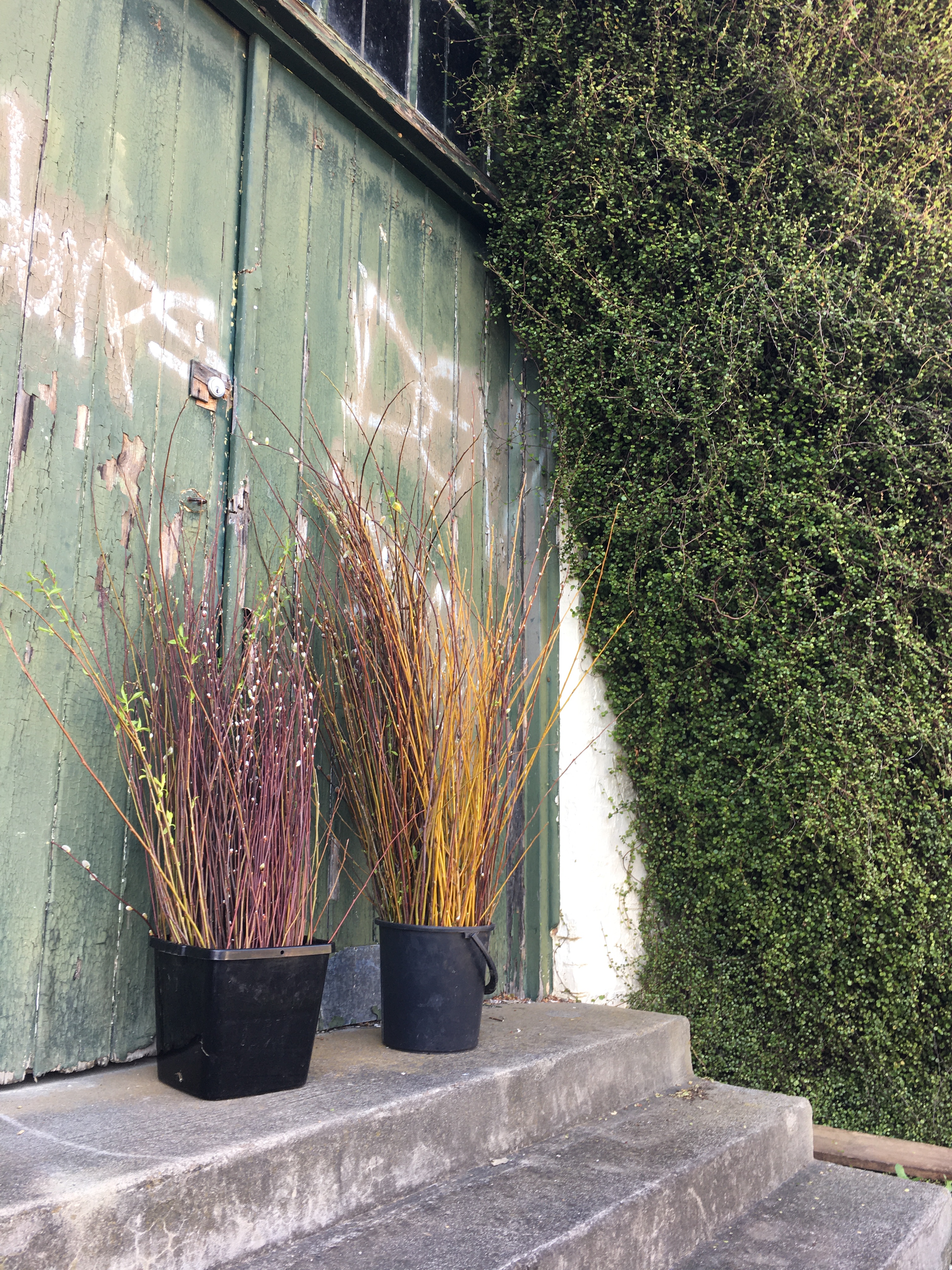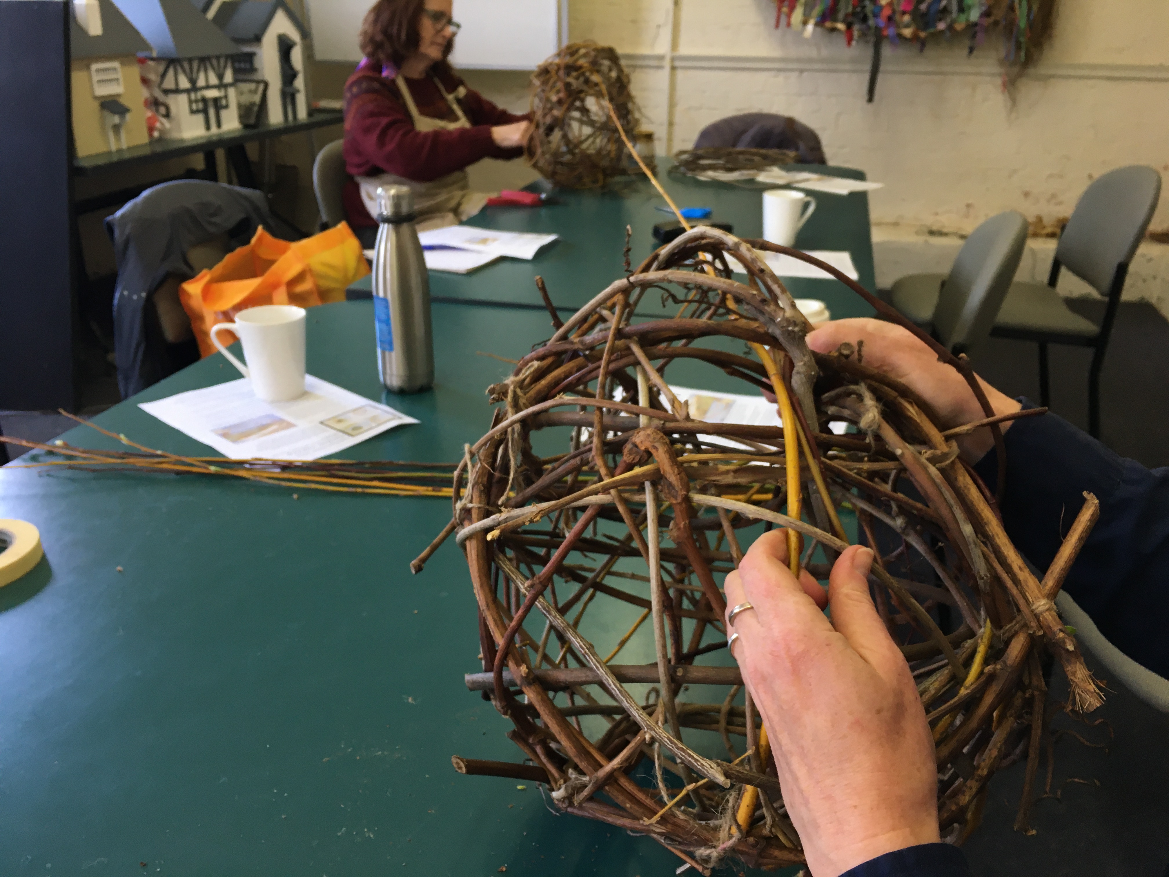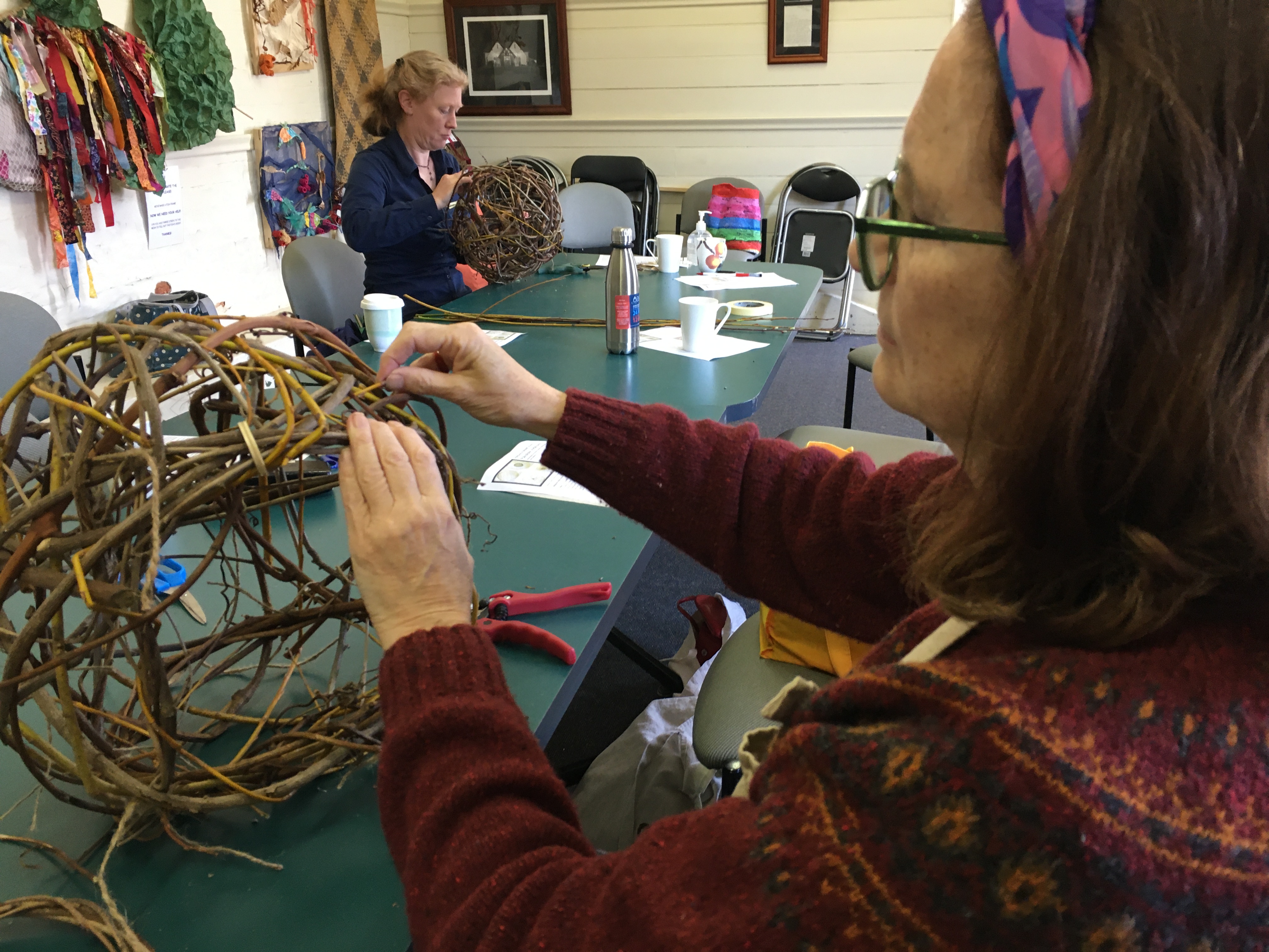 The materials that were available were dried and rehydrated hoops of wisteria, grape and willow to start the structure. Green fibre (recently harvested), was then added to create the intricate surfaces. I bought wild willow from the waterways of the Hepburn Shire and happy wanderer (hardenbergia) to work with. The willow was collected while dormant (deciduous so no leaves) and kept in water until the workshop. The happy wanderer was picked after flowering and stripped of its leaves, this laborious process is well worth the effort as it is a premium random weaving material. Once this green fibre in the basket has dried (in 6-8 weeks) and shrunk during this process more fibre can be added to fill the gaps.