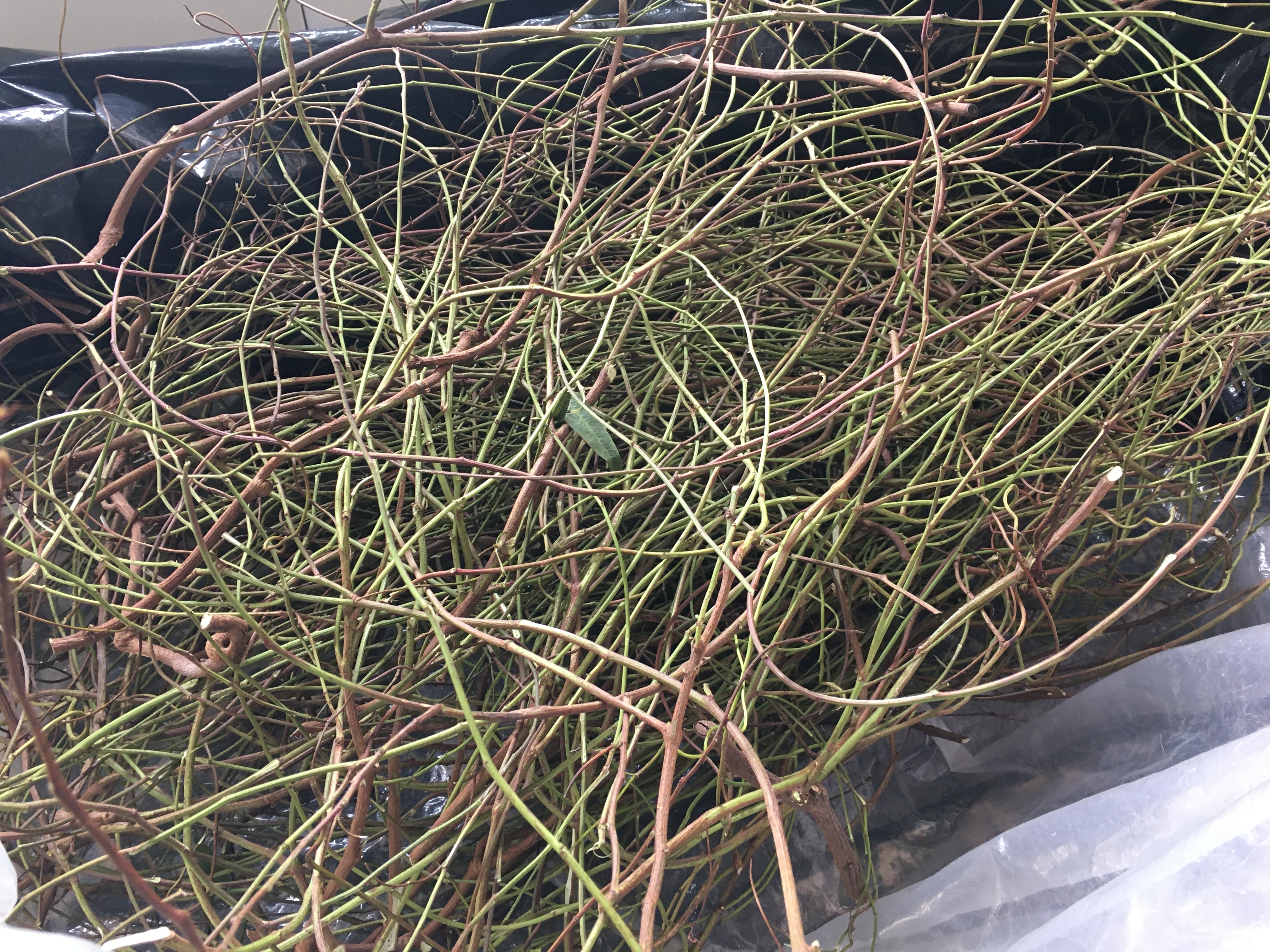The evergreen vine hardenbergia (or happy wanderer) has finished flowering and is ready to prune. It is worth the time and effort it takes to strip the leaves off this sprawling vine as it is a premium random weaving material.