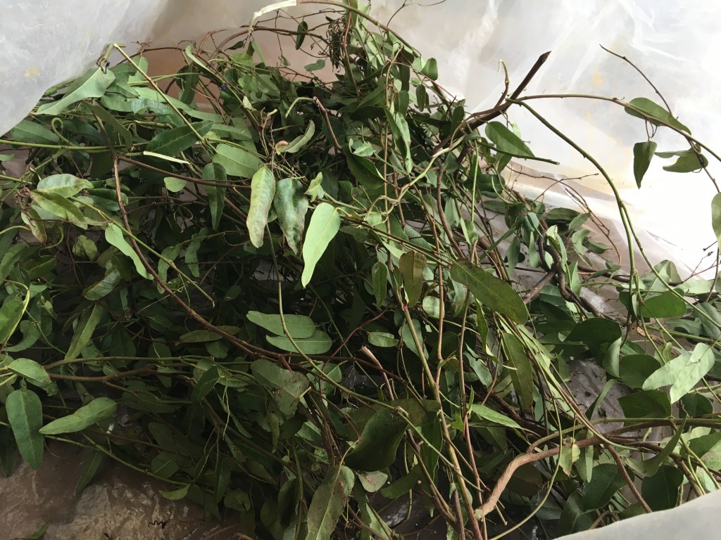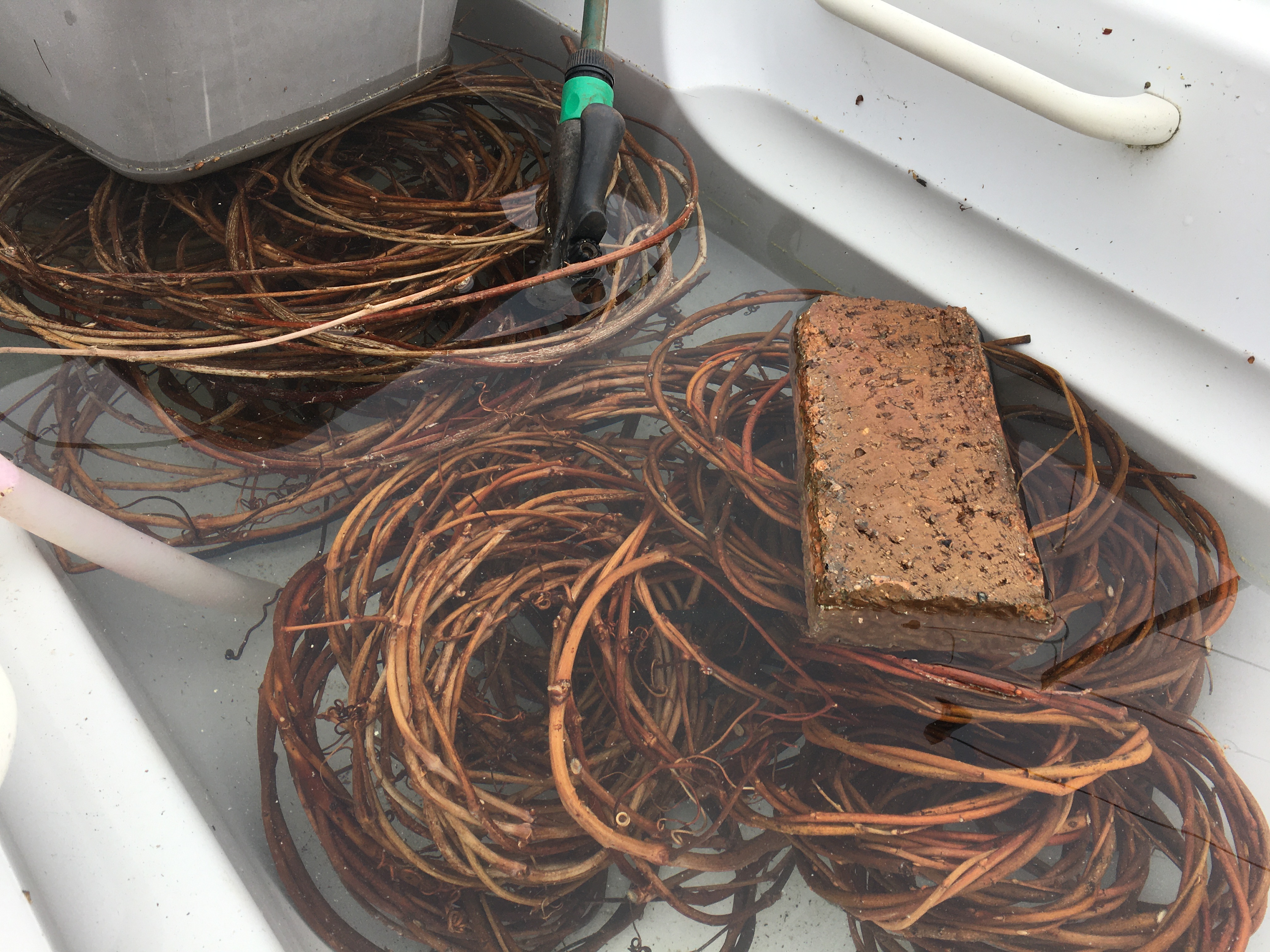 Wayward lengths of wisteria can be collected now (before the leaves shoot) or can be rehydrated from material collected in winter (when many prune their wisteria). I soak mine in an outside bath for a couple of days before the workshop. Checking it once in a while to make sure it doesn’t soak long enough for the bark to discolour. I have found a couple of wild wisteria plants and collect the trailing lengths along the ground at this time. They can be used green, that saves work as I don’t have to dry and rehydrate the material!