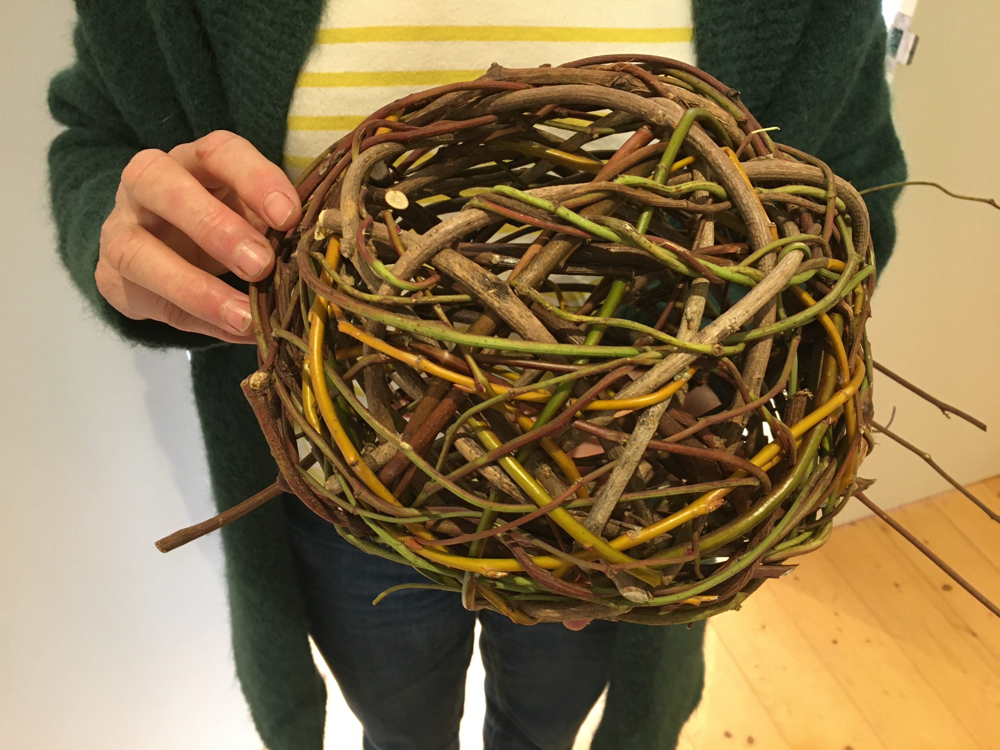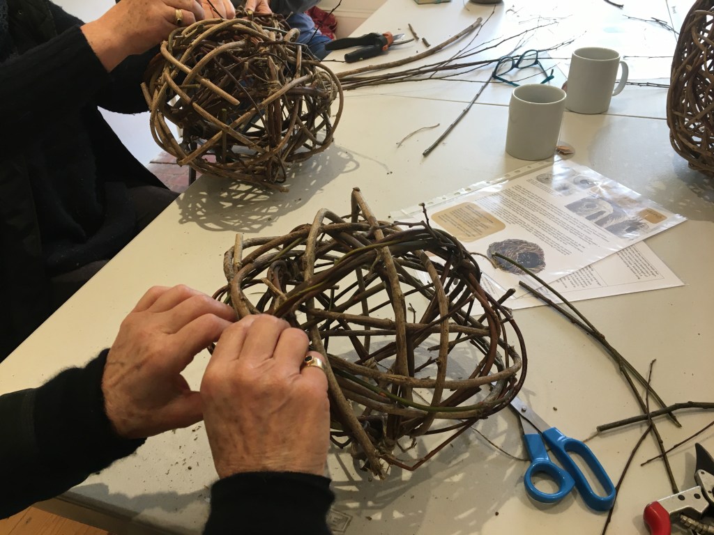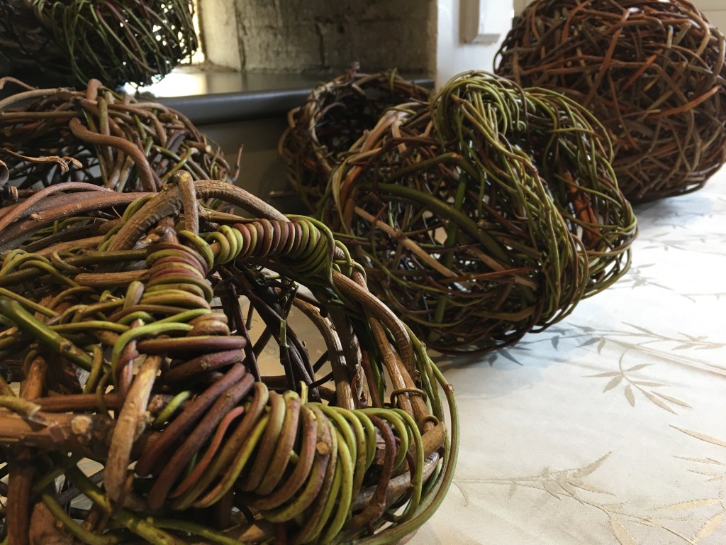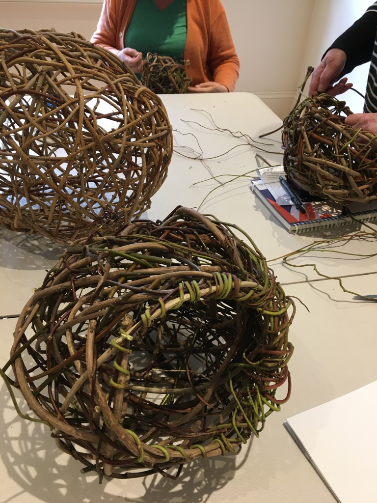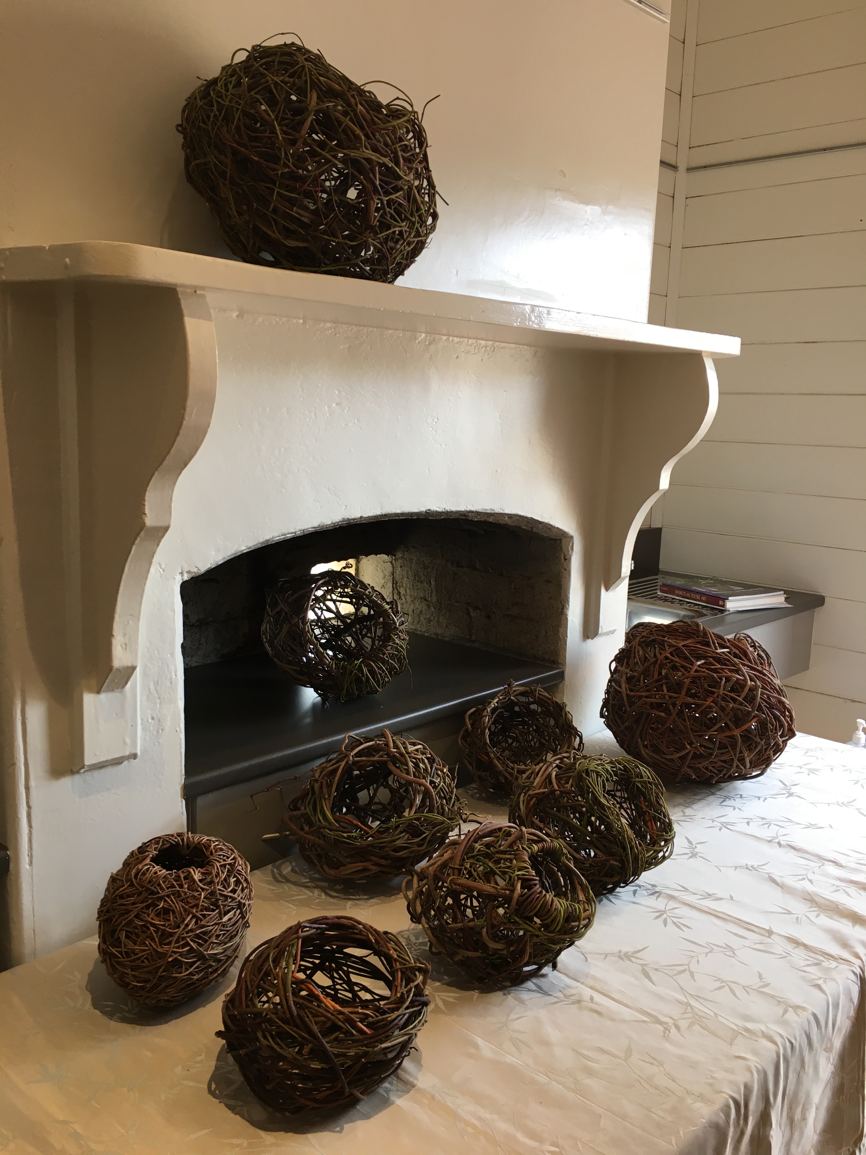 I facilitated a second random weaving workshop at the Newstead Arts Hub last Saturday October 29. The first workshop in July was so popular we had enough people on the wait list to run a second workshop. Not even rescheduling due to flooding deterred them! The participants started by tying together rehydrated grapevine and willow wreaths to create a spherical form. They then consolidated the structural integrity of the baskets by weaving in wisteria and willow lengths. Finally surfaces were embellished with happy wanderer (hardenbergia) that helped create flowing lines on the surface of the baskets. Another great day at the Newstead Arts Hub with women who had travelled from all over the region to learn this basketry technique.