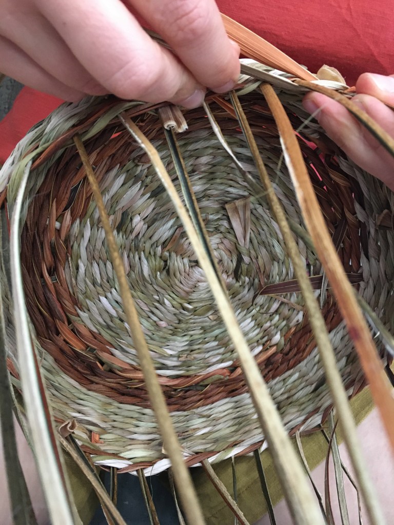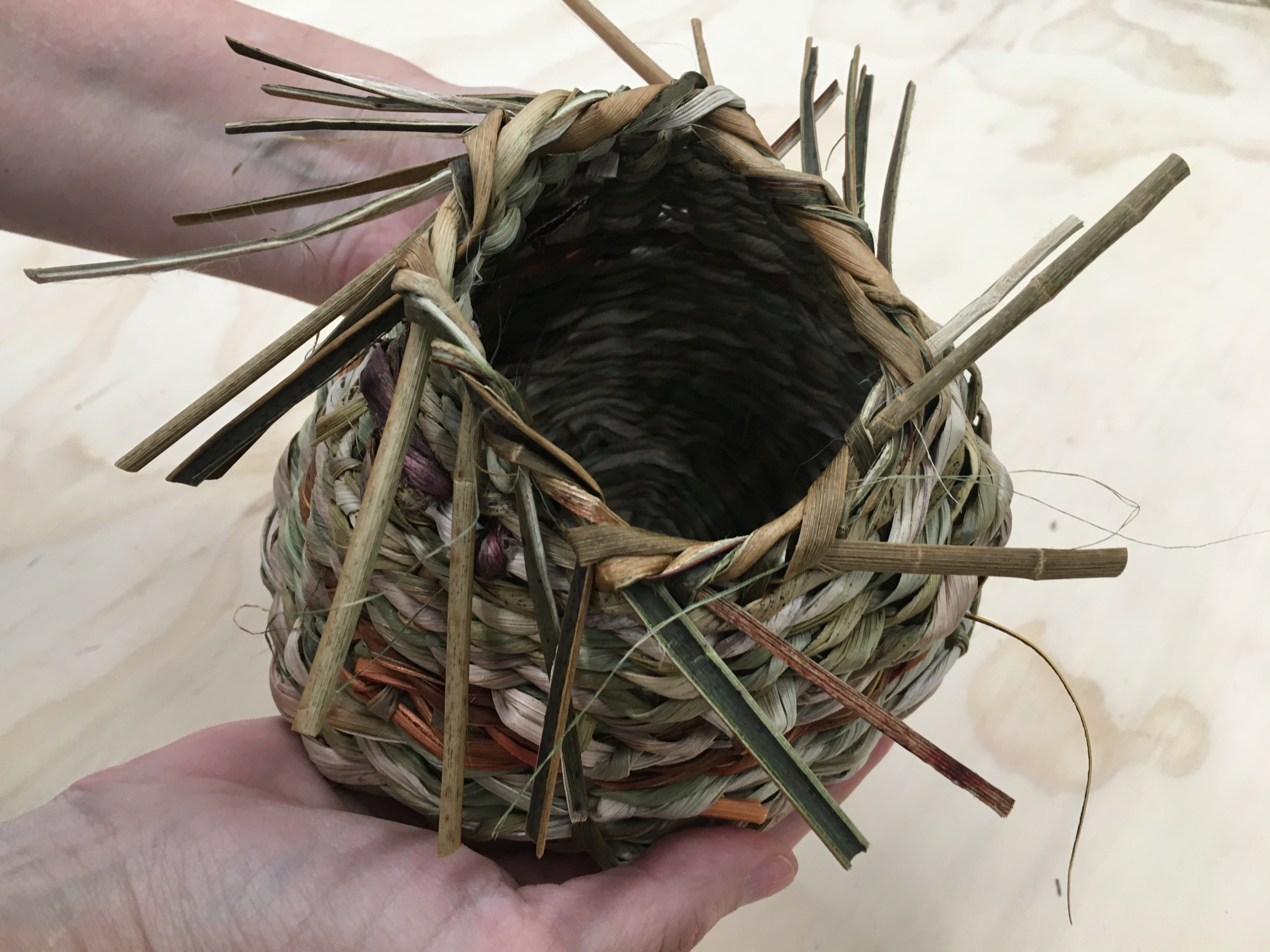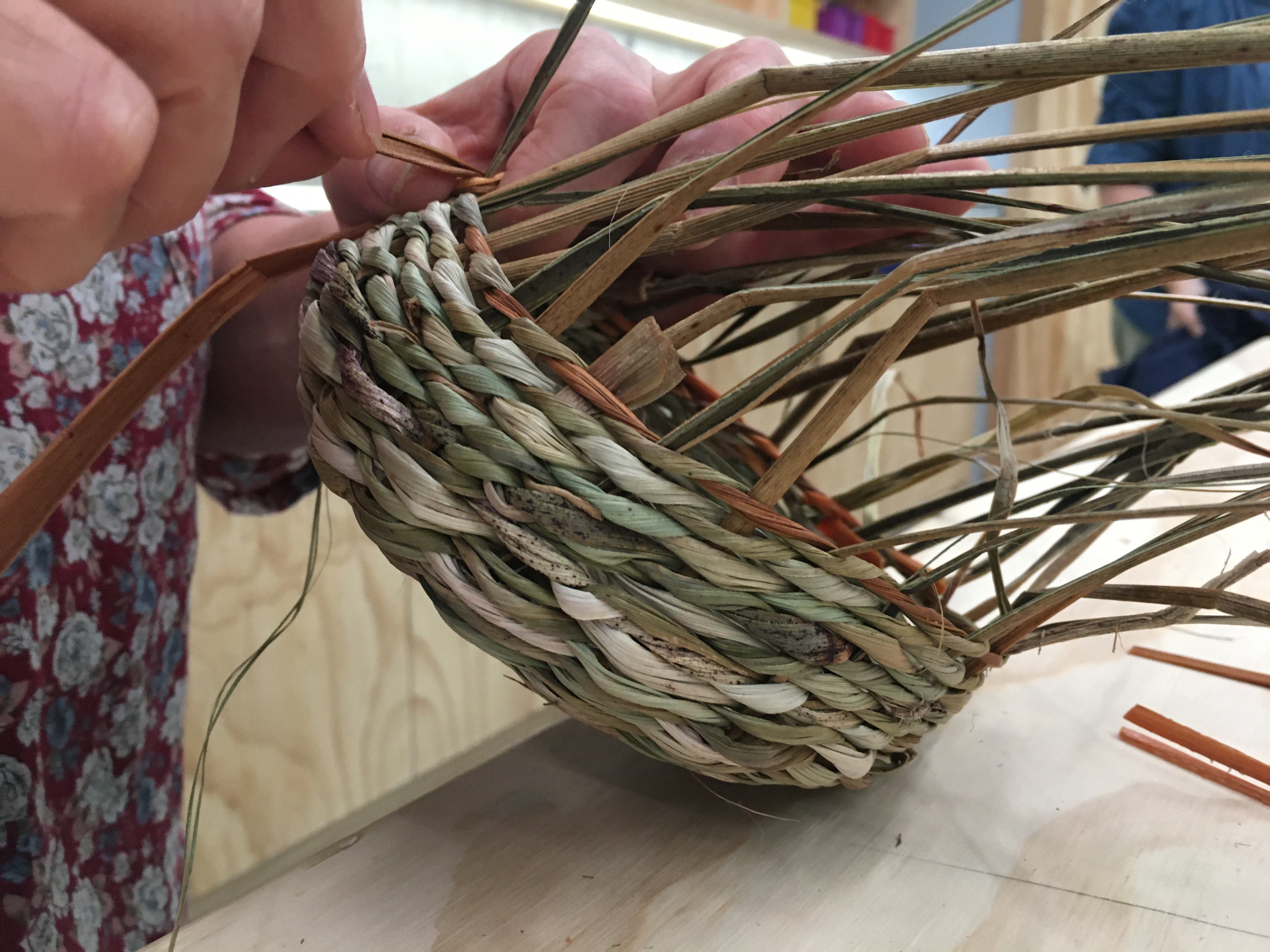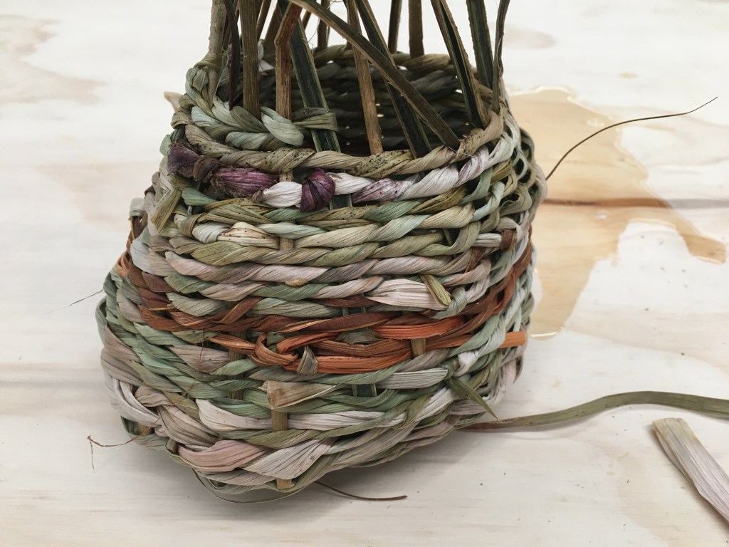 Yesterday I was at the Rare Trades Centre in Ballarat teaching a group to weave twined baskets. Twining is the twisting of 2 soft and flexible weavers around several more rigid and stationary stakes. The participants used split flax for the stakes and red hot poker for the weavers. The addition of Watsonia created lovely red bands of weaving. For those who would like to collect Watsonia for their baskets, the time to do so is now! Or soon! I went to Daylesford (in Victoria) on Thursday and collected a bunch of leaves that had recently dried on the plant to a red colour. If picked green leaves will dry to a brown gold. If left too long they will deteriorate and weather to a grey colour.