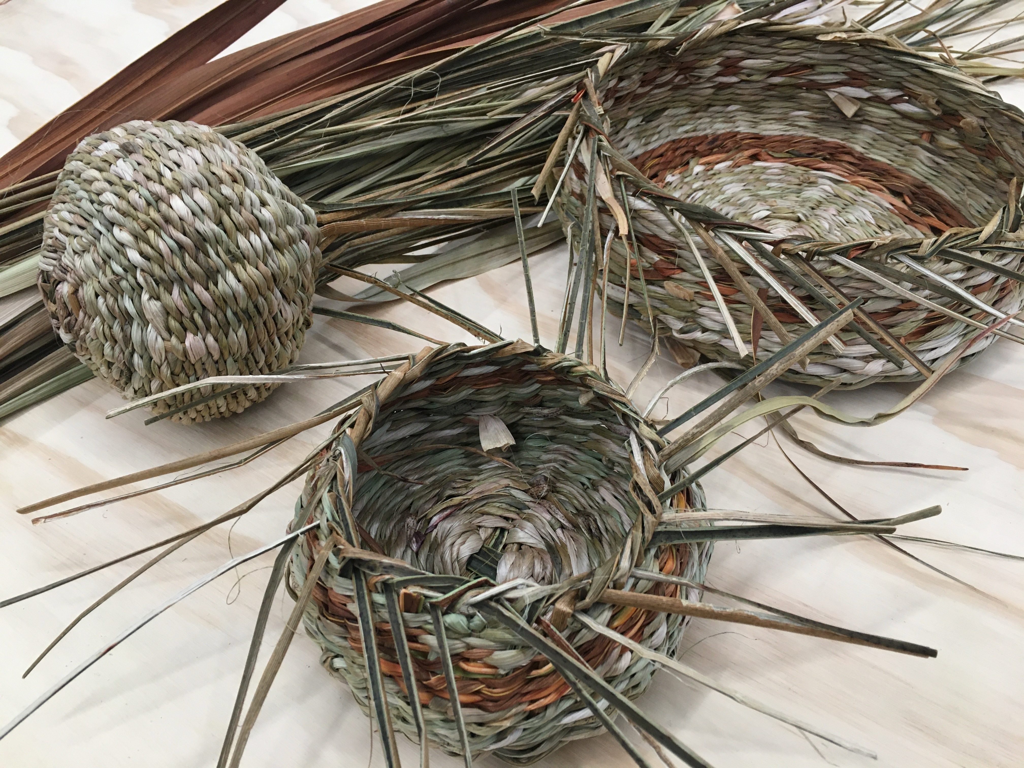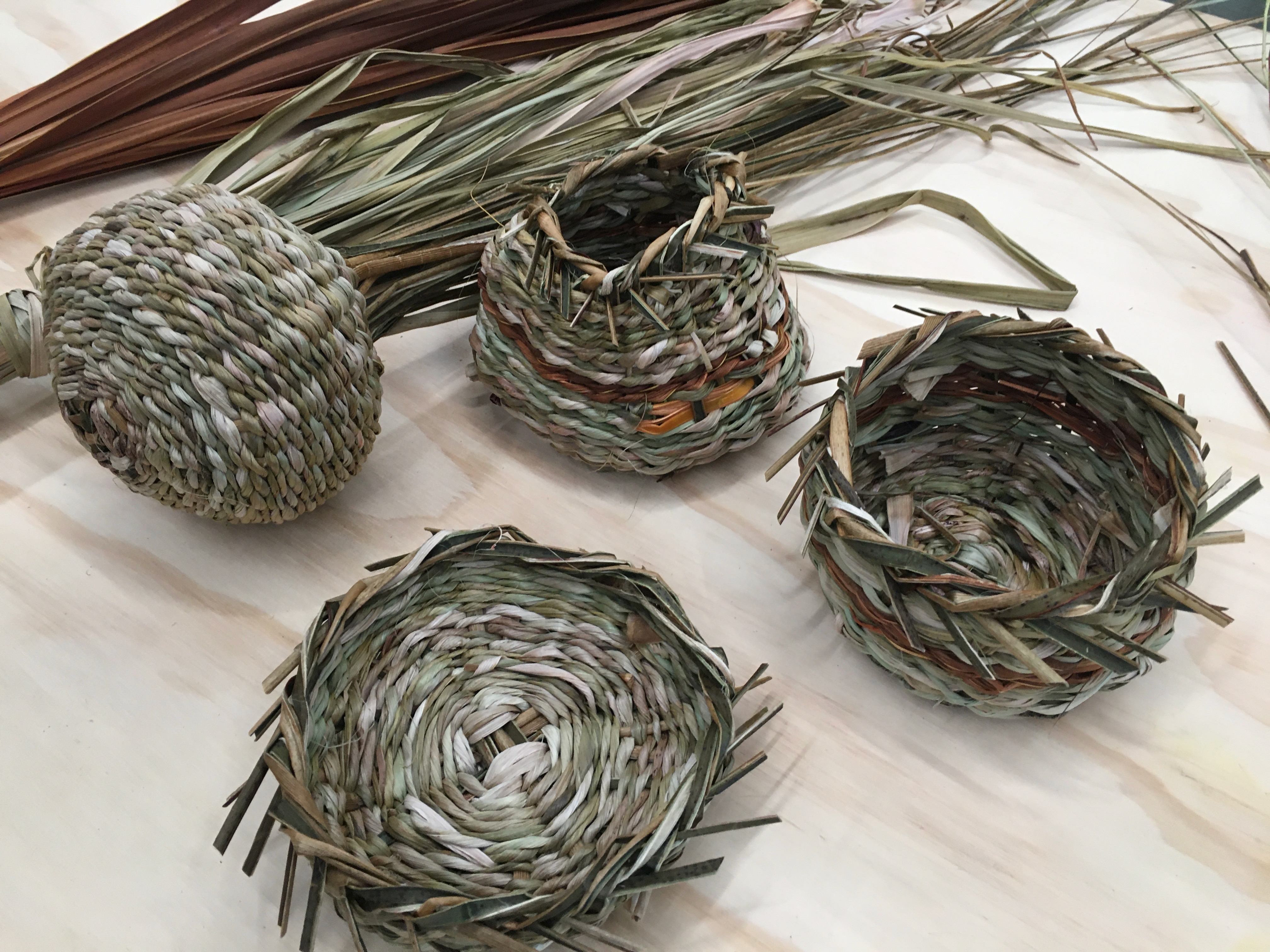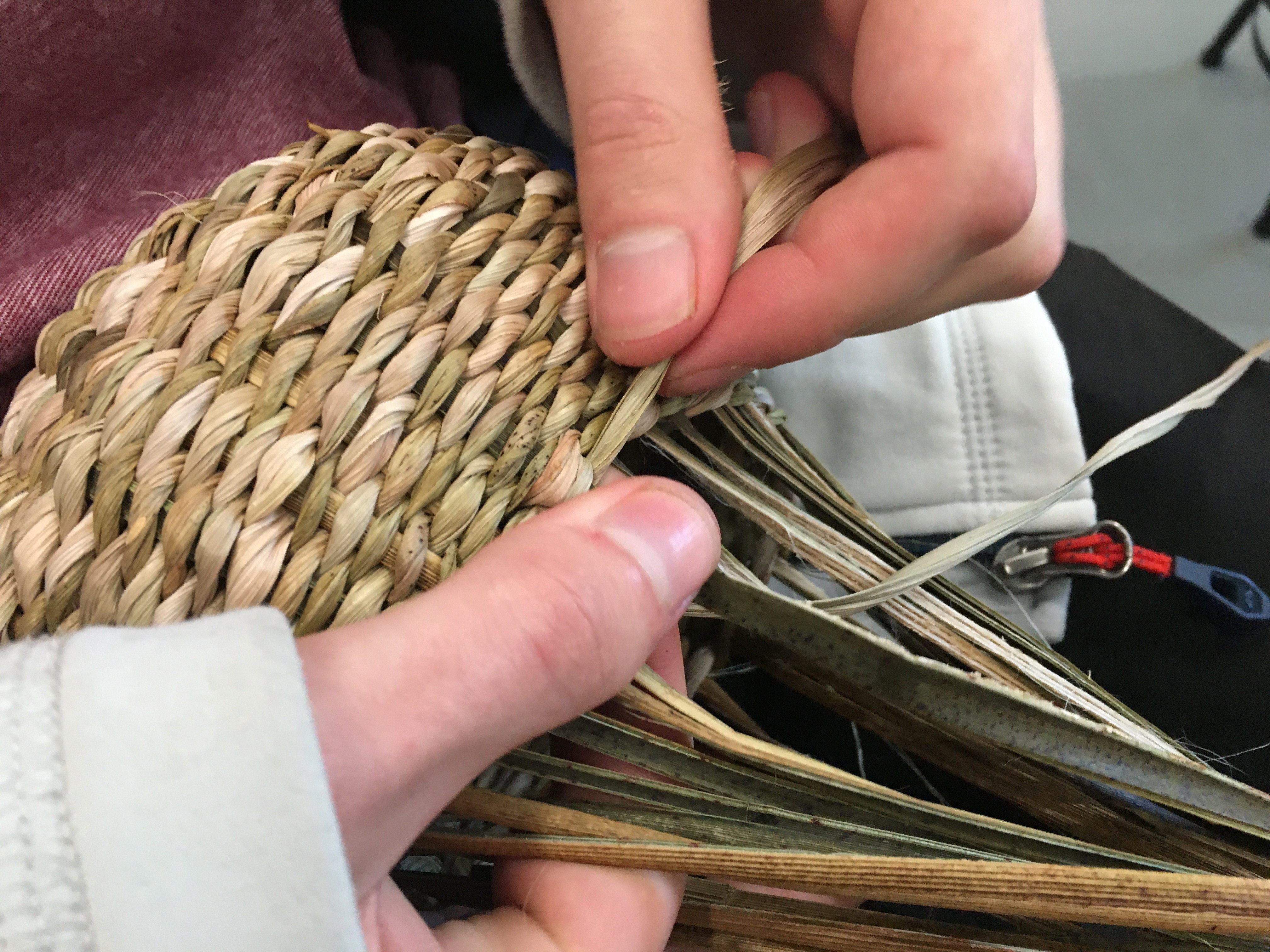 Yesterday I was at the Rare Trades Centre in Ballarat teaching a group to weave twined baskets. Twining is the twisting of 2 soft and flexible weavers around several more rigid and stationary stakes. The participants used split flax for the stakes and red hot poker for the weavers. The addition of Watsonia created lovely red bands of weaving. For those who would like to collect Watsonia for their baskets, the time to do so is now! Or soon! I went to Daylesford (in Victoria) on Thursday and collected a bunch of leaves that had recently dried on the plant to a red colour. If picked green leaves will dry to a brown gold. If left too long they will deteriorate and weather to a grey colour.