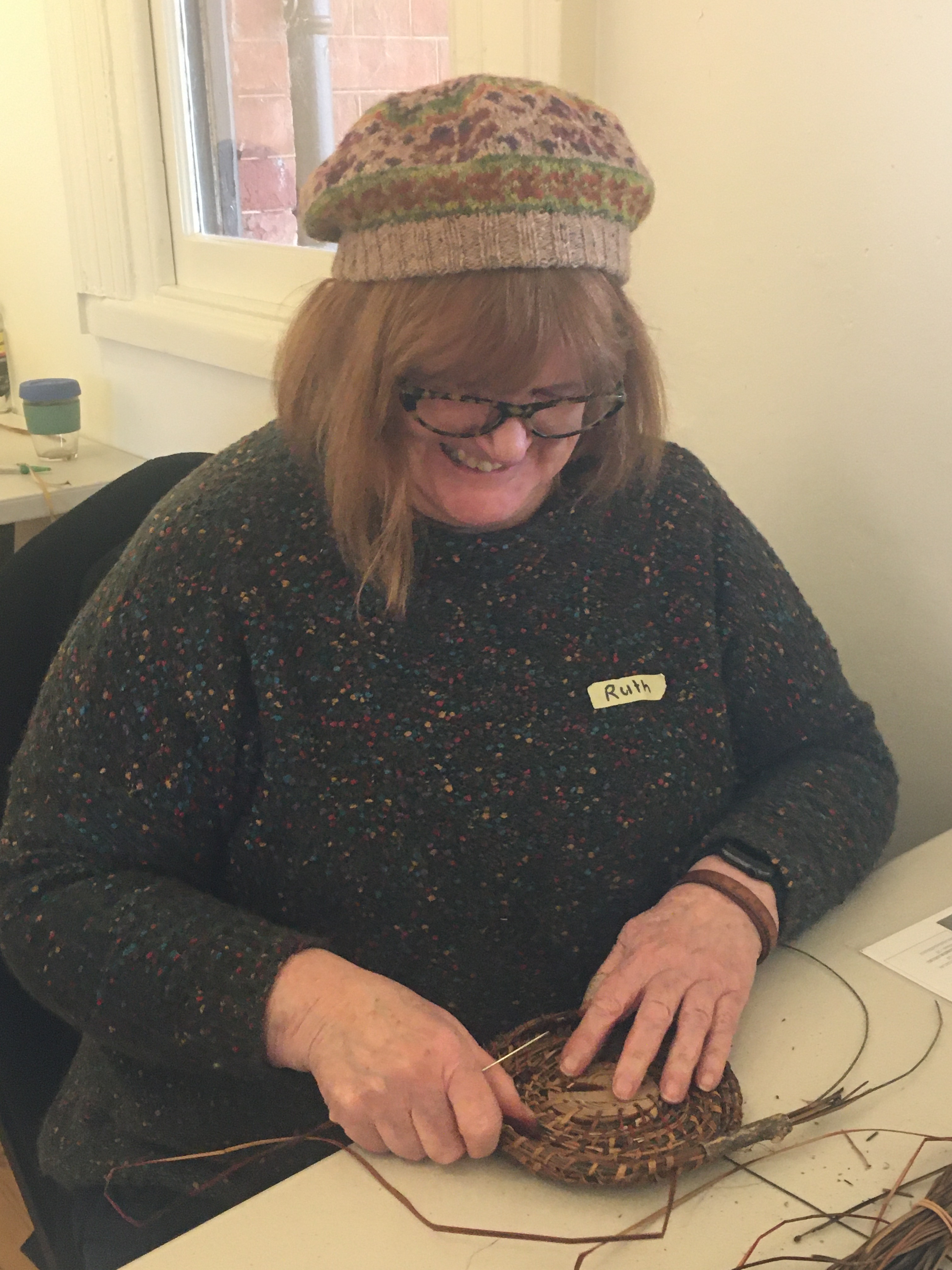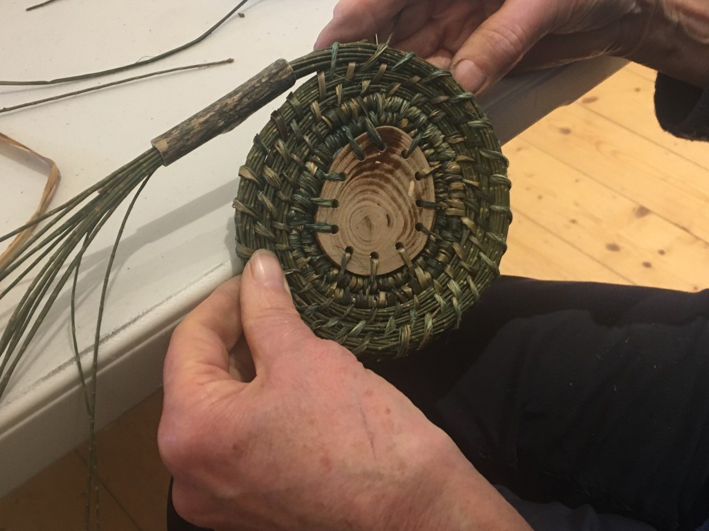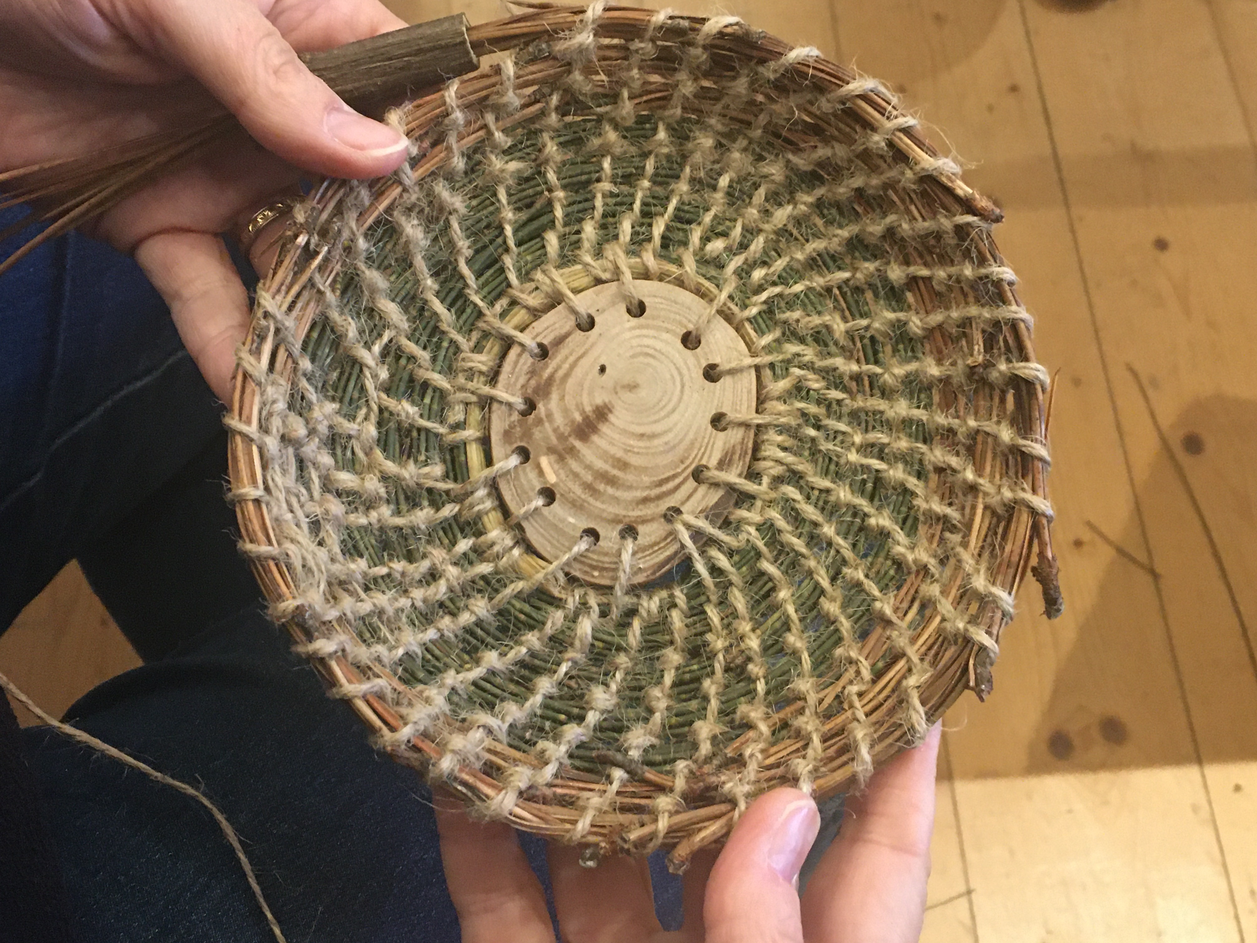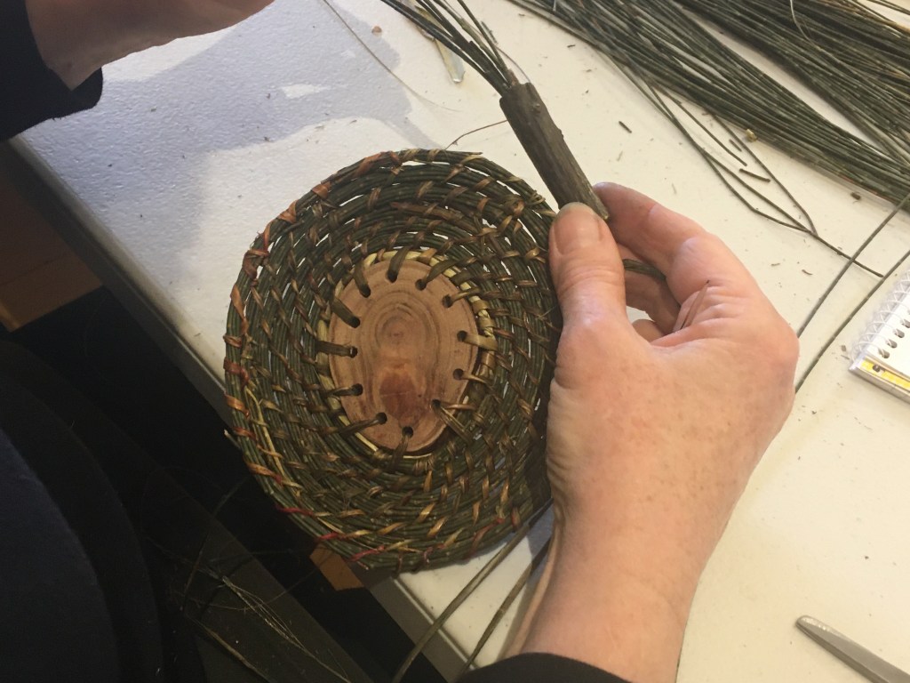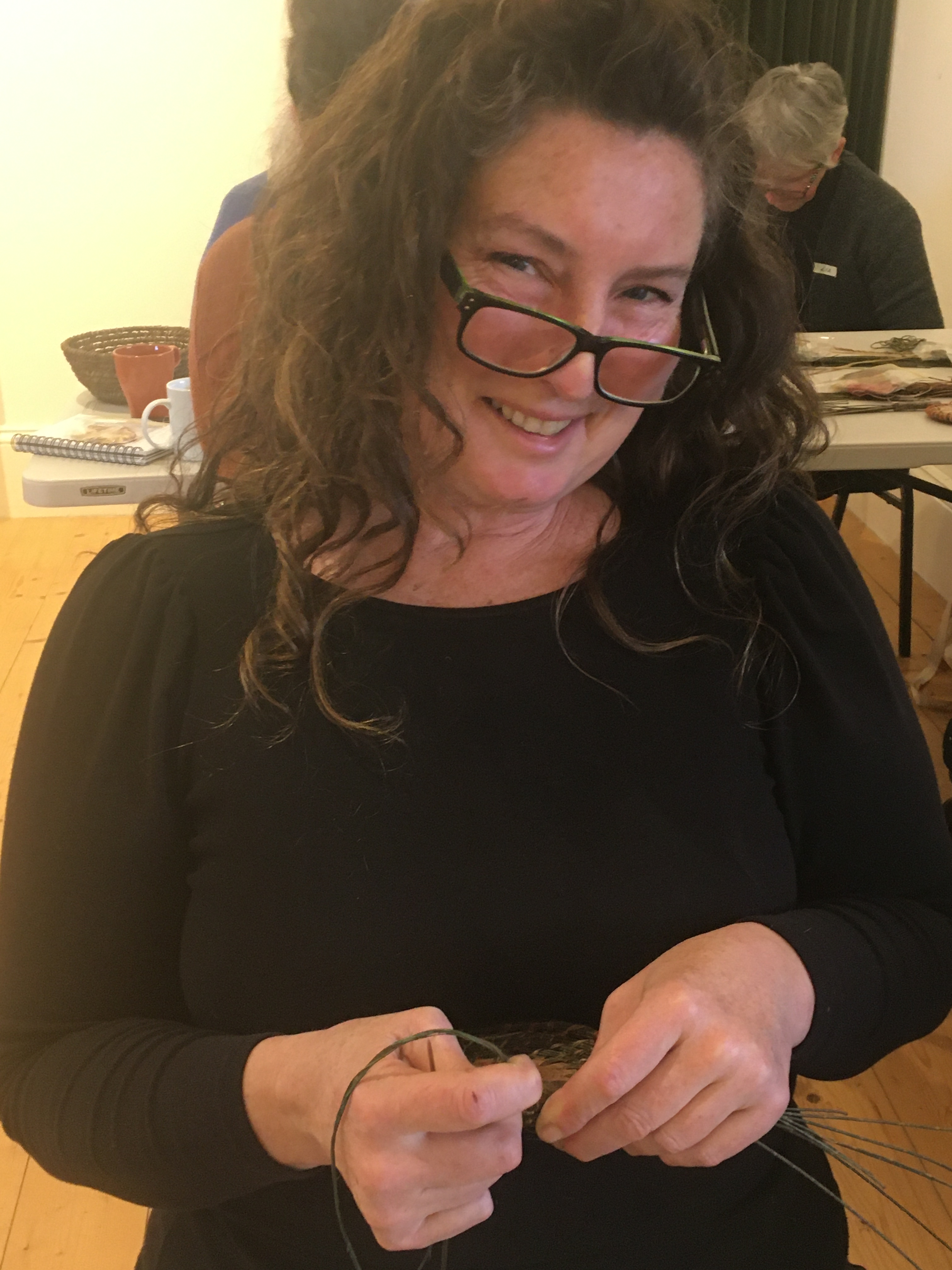 What better way to keep the winter blues away? Yesterday a group were brimming with winter cheer at the Newstead Arts Hub while learning to coil a basket. Some used split flax and others used waxed and painted string to coil she-oak and pine needle baskets. The result were beautiful baskets with diverse texture, form and colouration. Coiling is a time consuming technique, a labour of love so most baskets were not completed in the one day workshop. I demonstrated how to finish, so that participants were provided with the skills to finish their baskets at home.