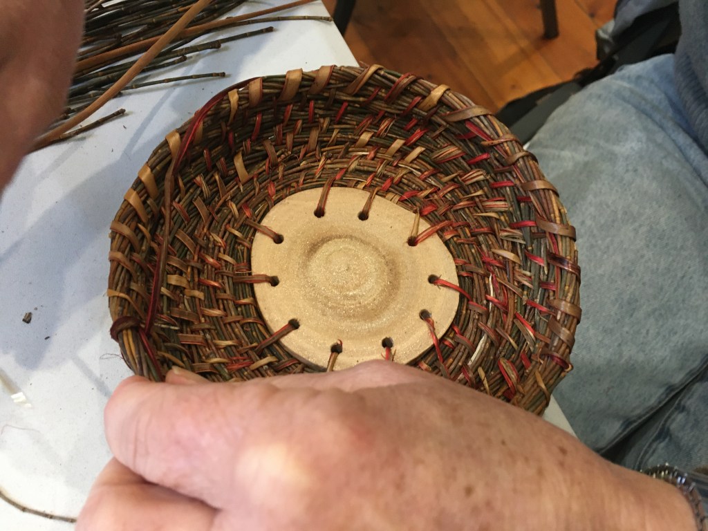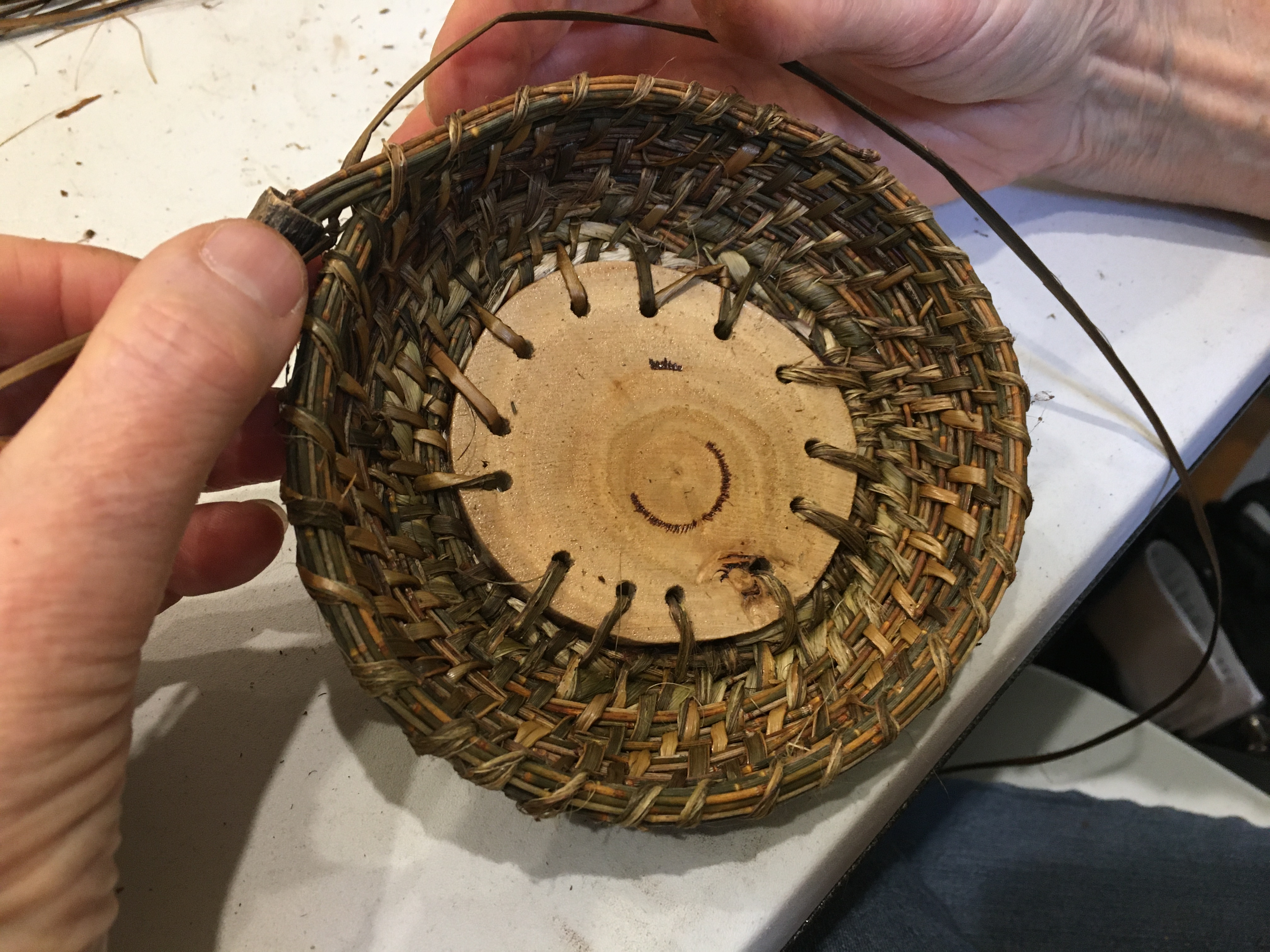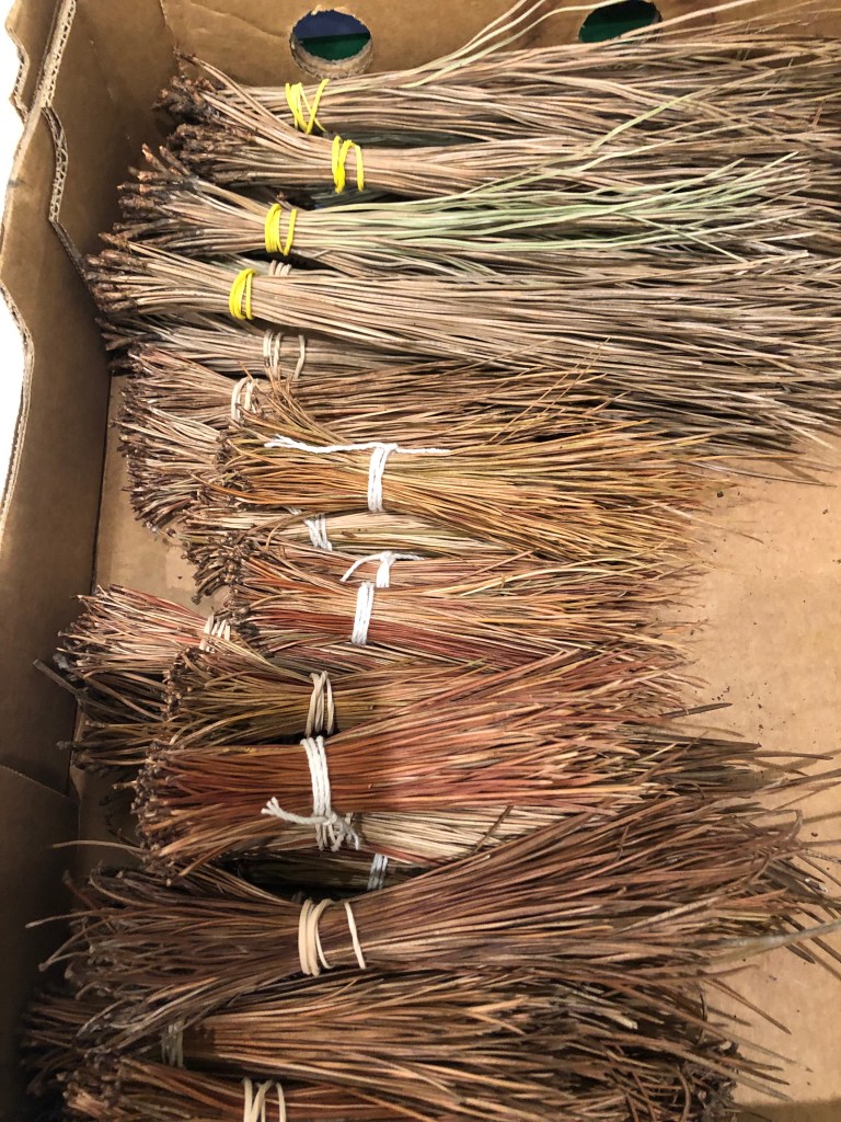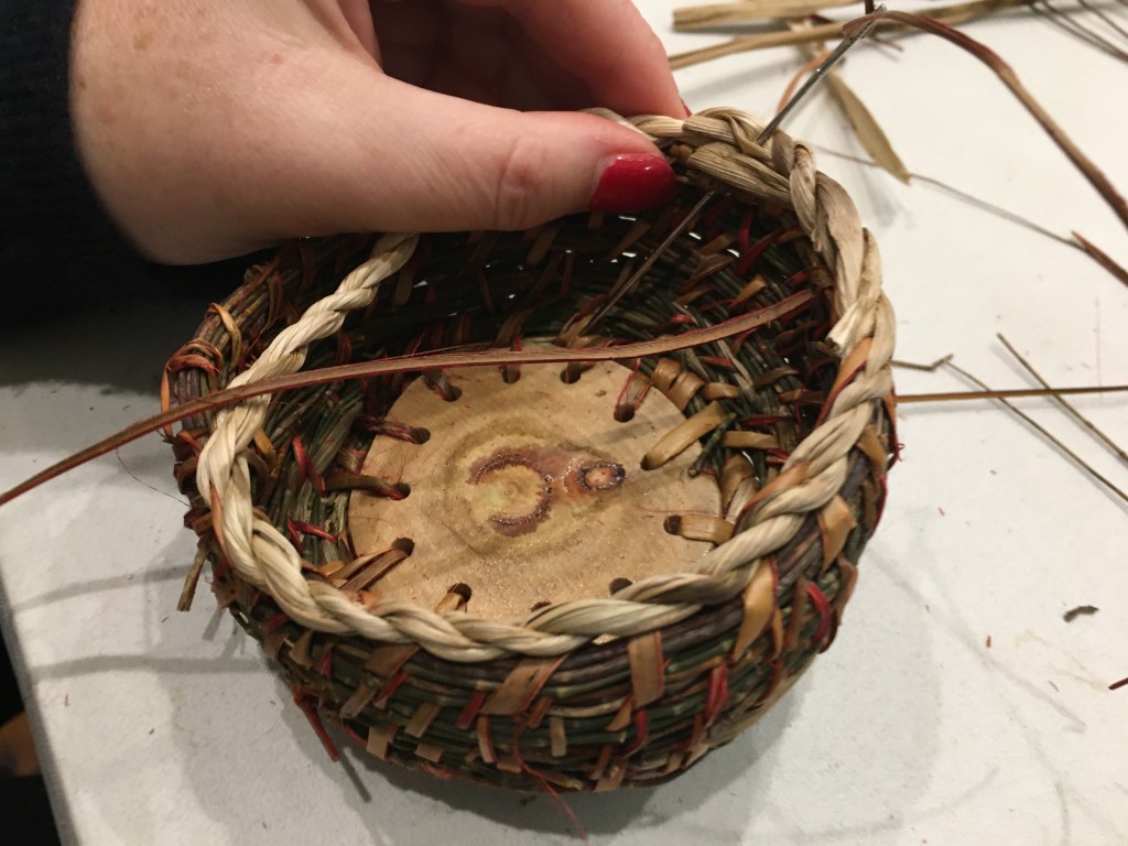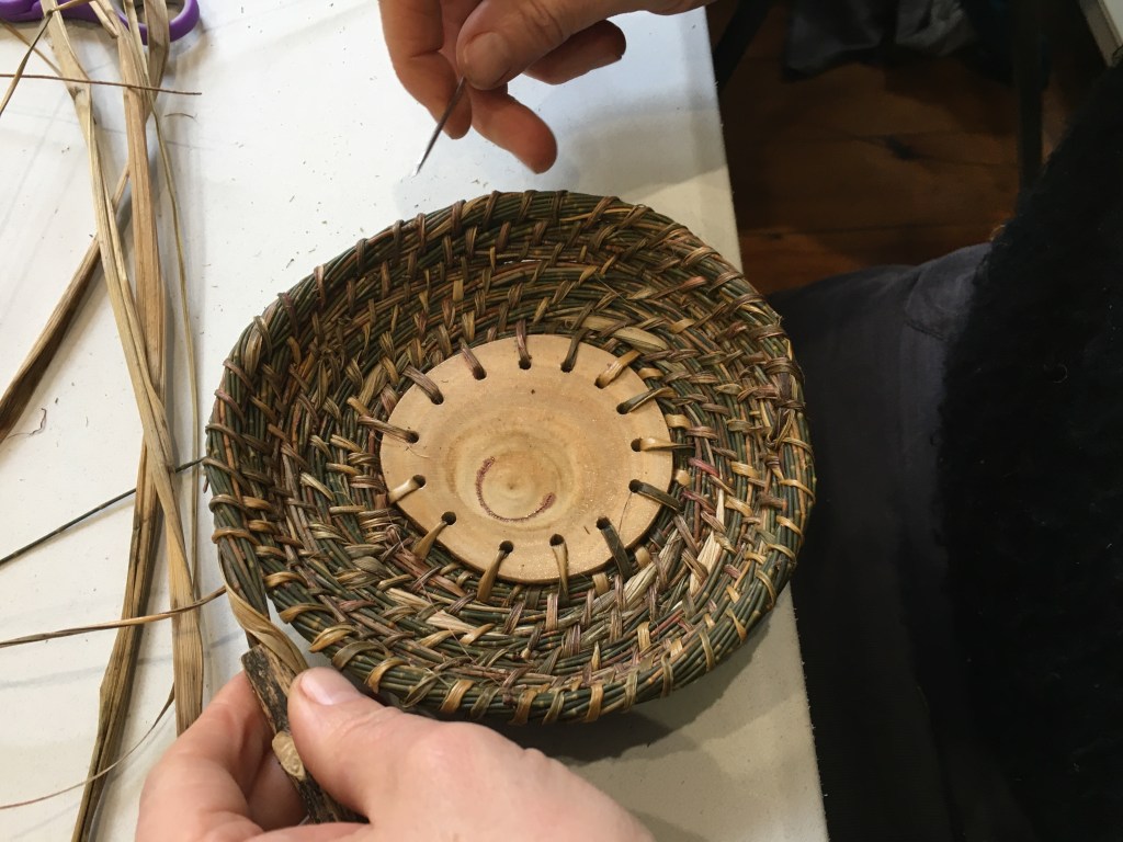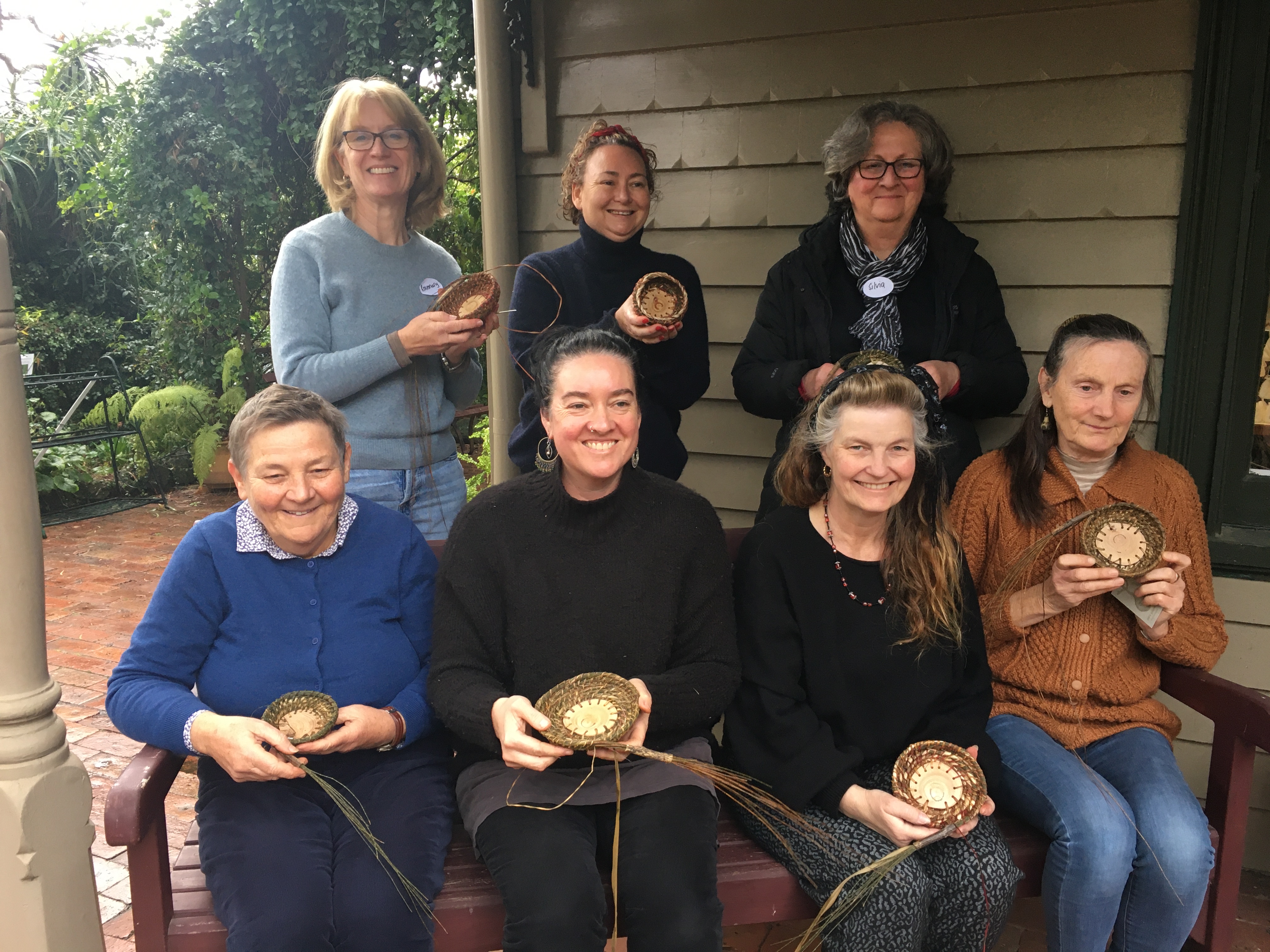 The Plant Craft Cottage has incredible charm and character as it is the oldest building at the Botanical Gardens in Melbourne! I facilitated a coiled basketry workshop on Saturday August 12 for the custodians and caretakers of the cottage, the Friends of Royal Botanical Gardens Melbourne. Participants used she-oak and pine needles for the core and dyed or natural split flax to wrap and stitch the basket. I like to provide a wooden base as beginners can get into the rhythm of weaving quickly and familiarity with the materials and the spiral stitch as the starting point.