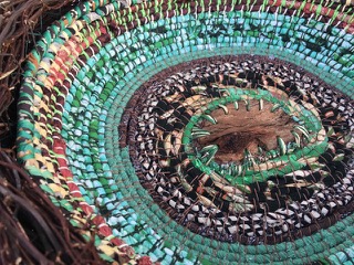 The workshop will focus on making and developing a range of techniques, starting with rusting fabrics and cordage. This will lead to making a coiled basket using a range of recycled patterned fabrics that will be provided. Participants will be shown how to create a complex and unique colour scheme, when coiling a basket. A circular wooden base will be provided, and wide strips of fabric will be used, so that baskets are coiled in a day or so. This is an adaption to the basketry technique of coiling which can be very time consuming.