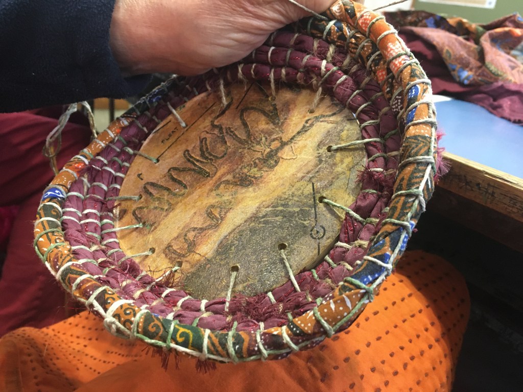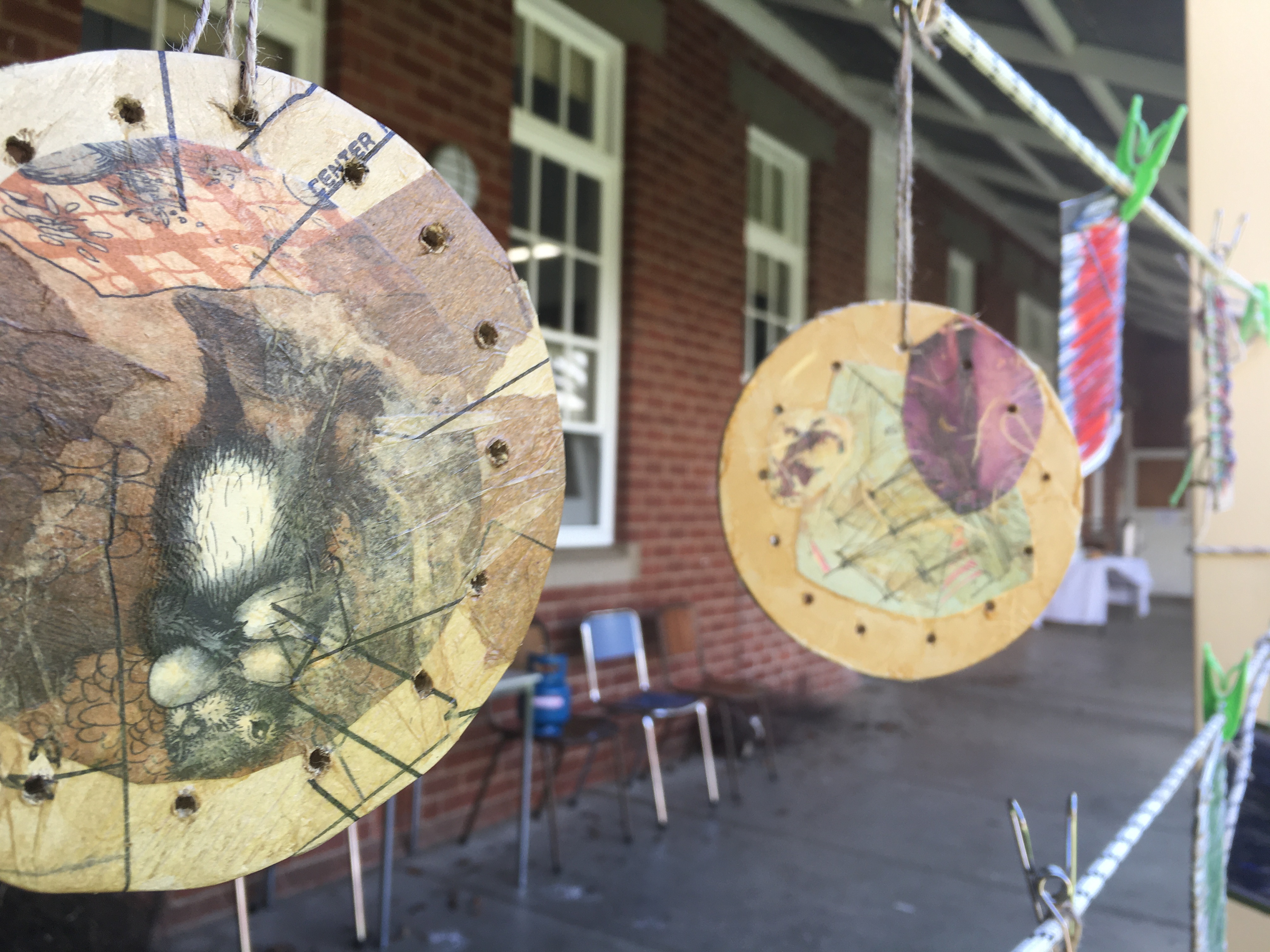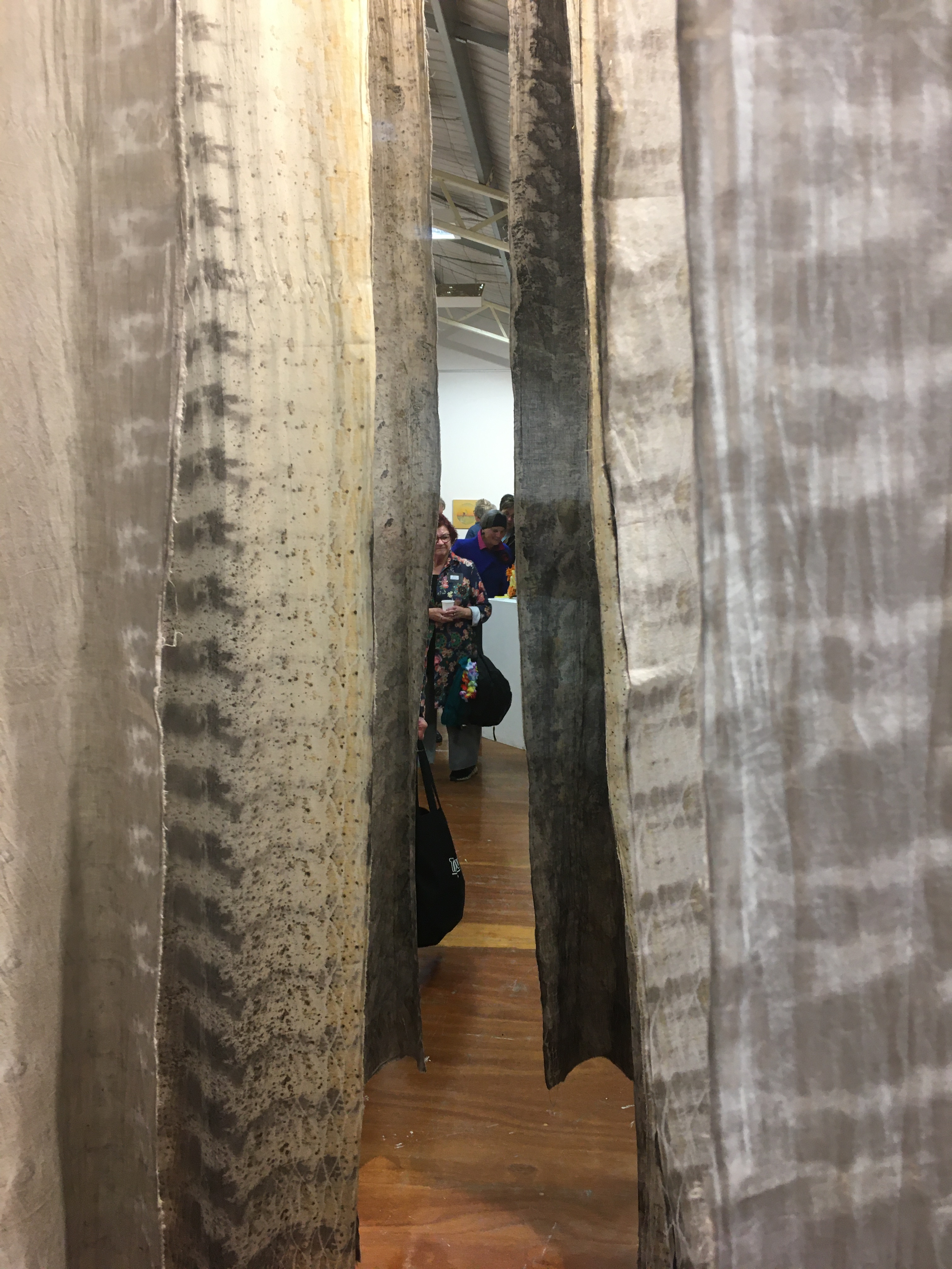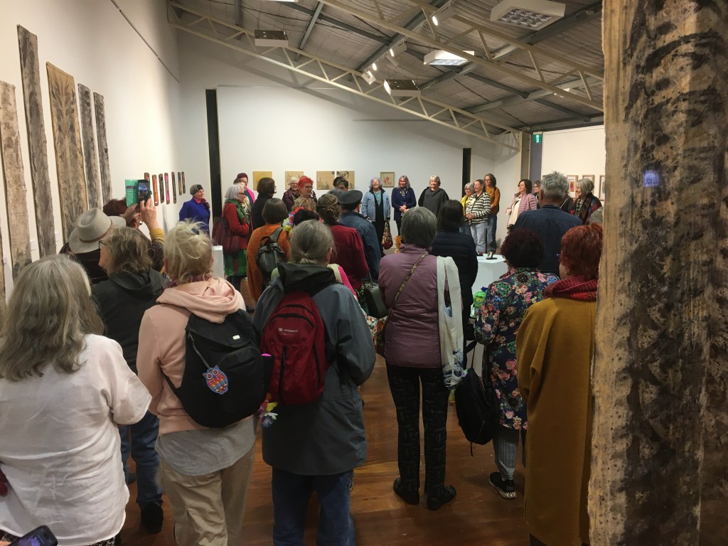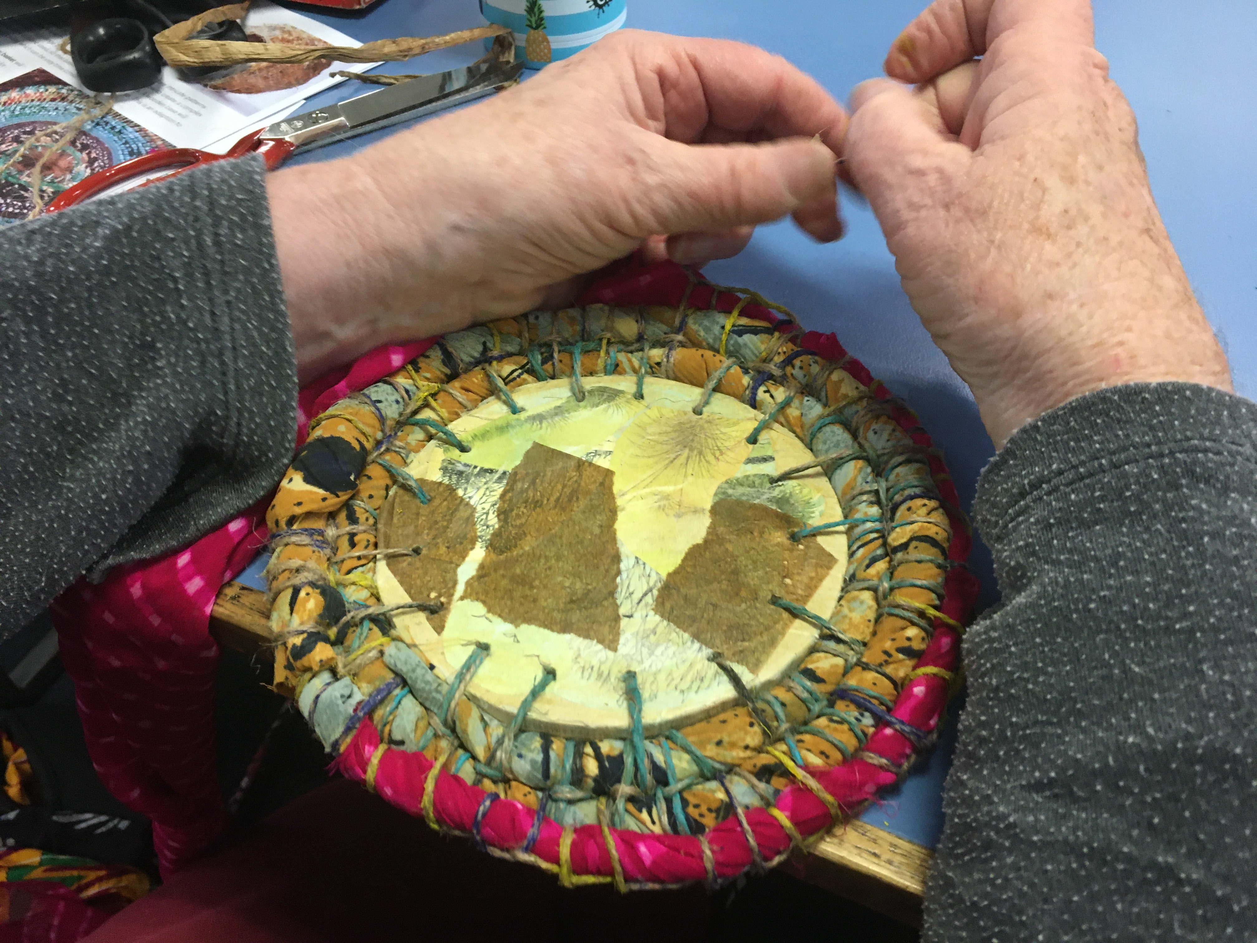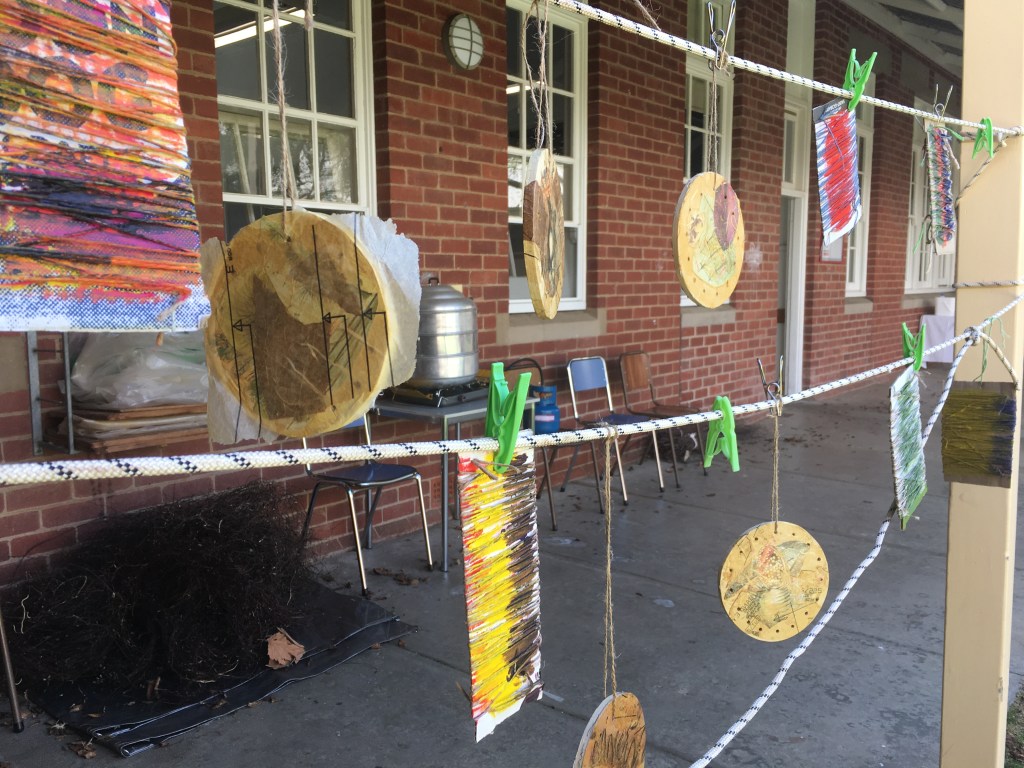 An action packed day in the studio at the Tafta Geelong Fibre Forum. We collaged wooden discs, waxed and painted string and started coiled baskets. We loaded an old steamer with threads and fabric wrapped around rusty things and steamed them with a vinegar solution to aid rusting. There were some fabulous Artist Talks by Ro Bruhn, Dijanne Cevaal, Nicola Brown and Meredith Woolnough. The day finished with the opening of an exhibition called Precision and Chaos, works by Bronwyn Packwood and Larissa Murdock. Can’t wait until the morning and we can unpack the steamer to see the rust!