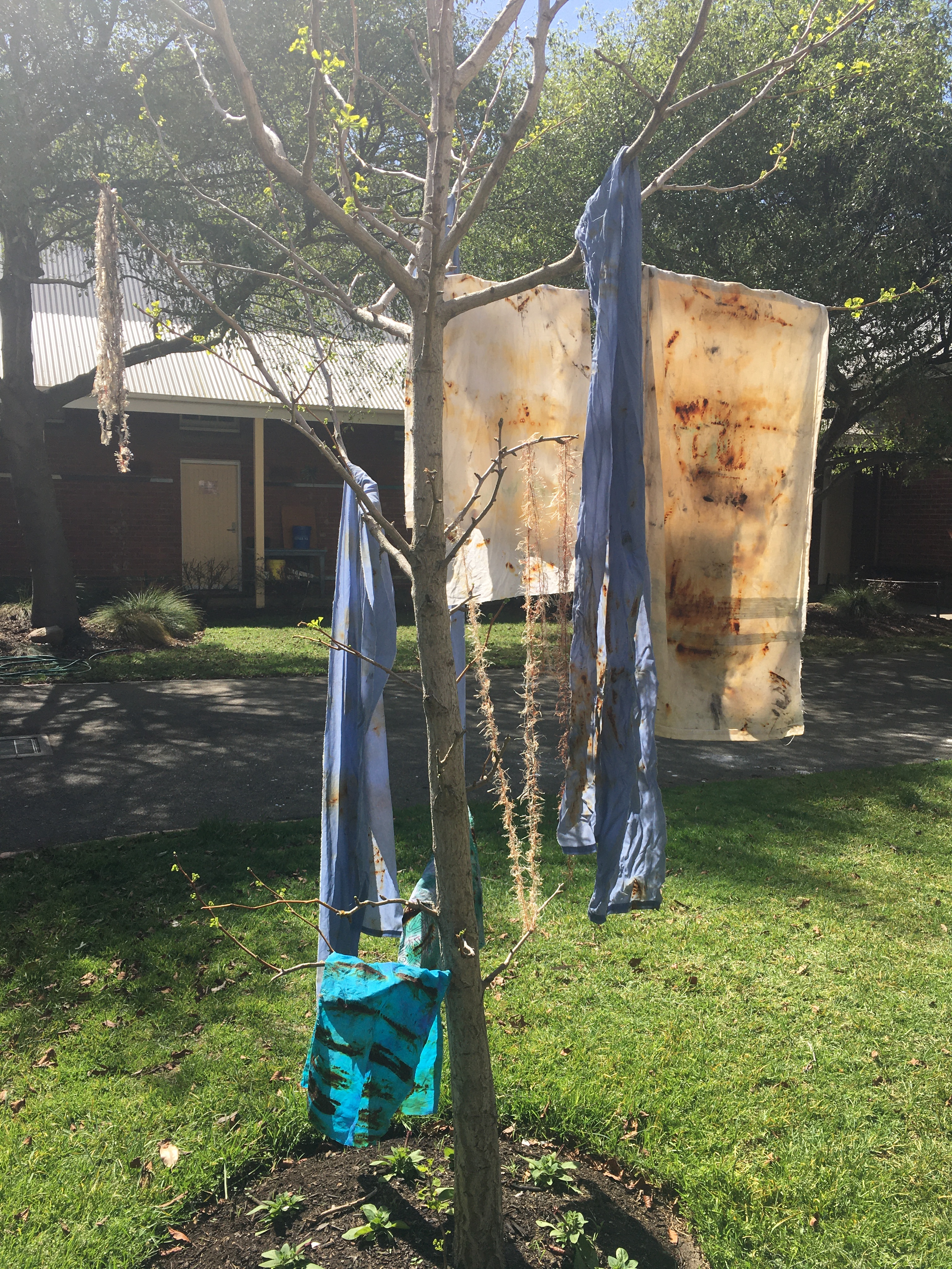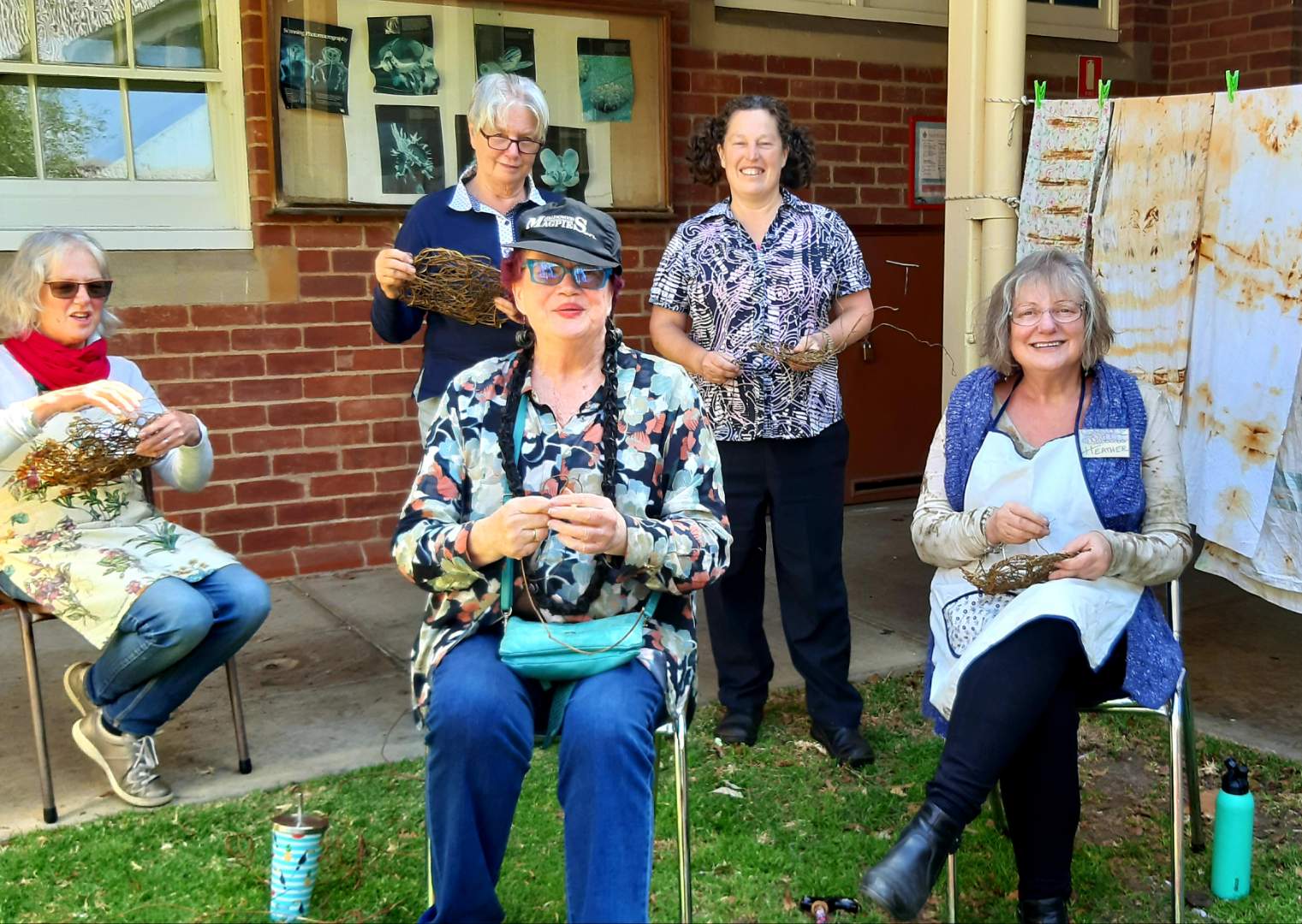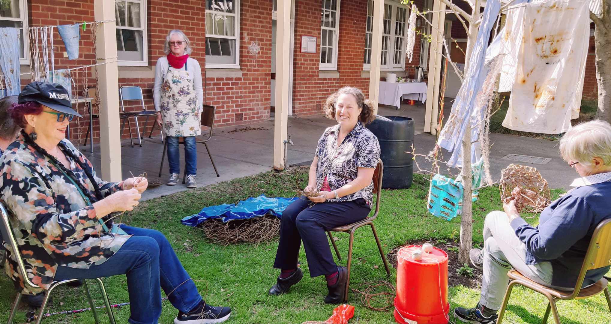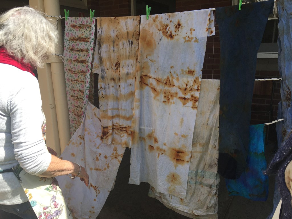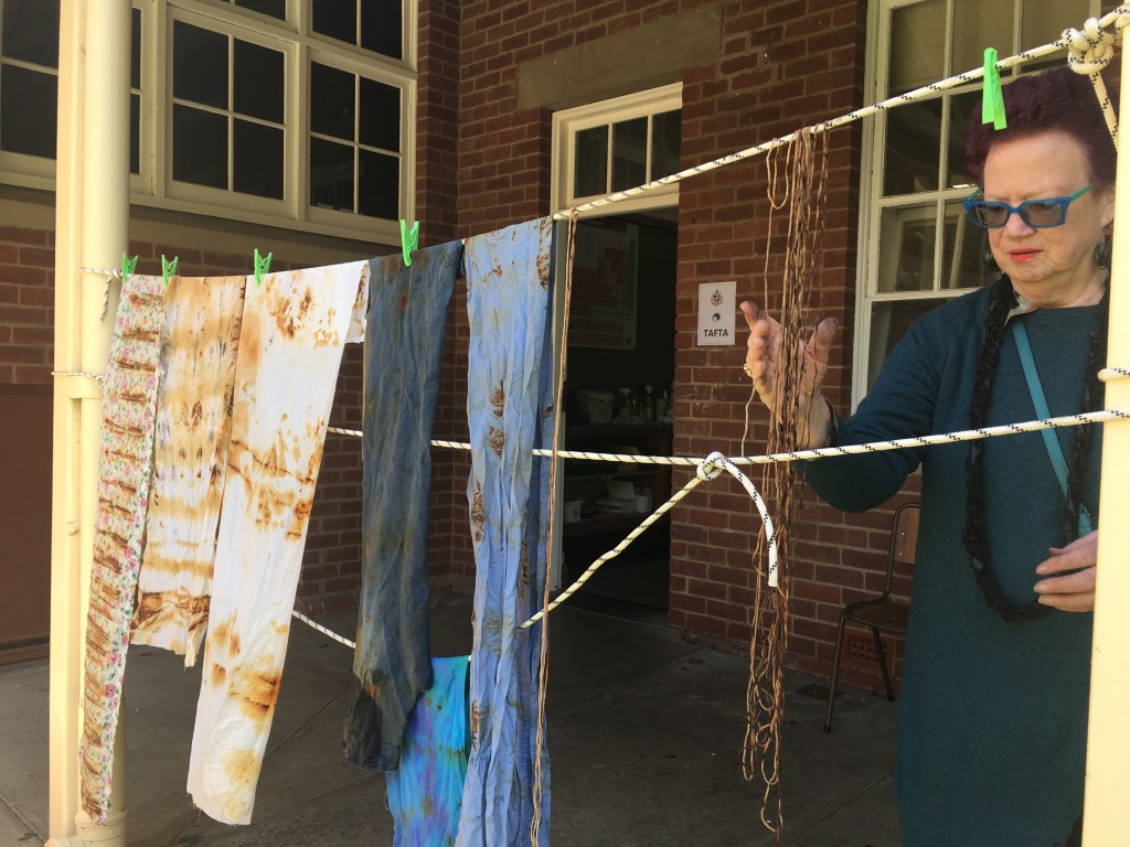 Today was a relaxing day when things flowed as in a dream. The fabric and threads were unpacked from the steamer. After soaking in a diluted bicarbonate solution to neutralise acid and stop the rusting process, they were washed with mild soapy water and hung up to dry. I then demonstrated an alternate coiling technique using arum lily. After lunch the group were mesmerised while random weaving hardenbergia (happy wanderer) for 2 hours straight. Passers by stopped to watch the weaving and have a look at the “Double Baskets”. At 3pm we stopped for a water break and to visit the studio of Dijanne Cevaal where her students were stitching ‘Traveller Blankets’. After the day of making I was one of 3 (as well as Dawn Edwards and Kim Thittichai) to give Artist Talks. The day ended with an Artist’s Market when 17 vendors presented their wares for sale. Lovely bespoke things from Japanese fabric to jewellery made of recycled plastic and the inner tube of bike tyres! A wonderful day!