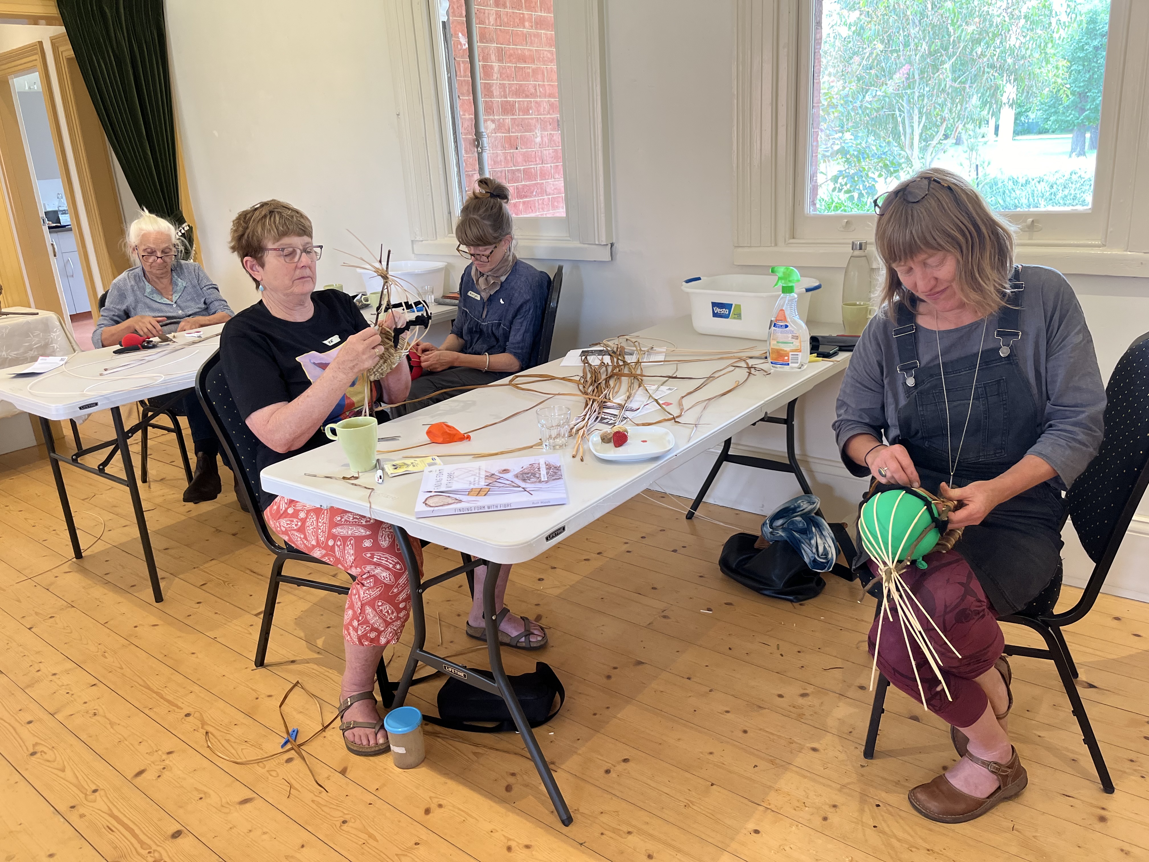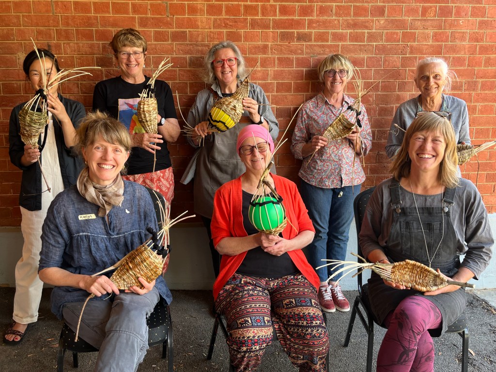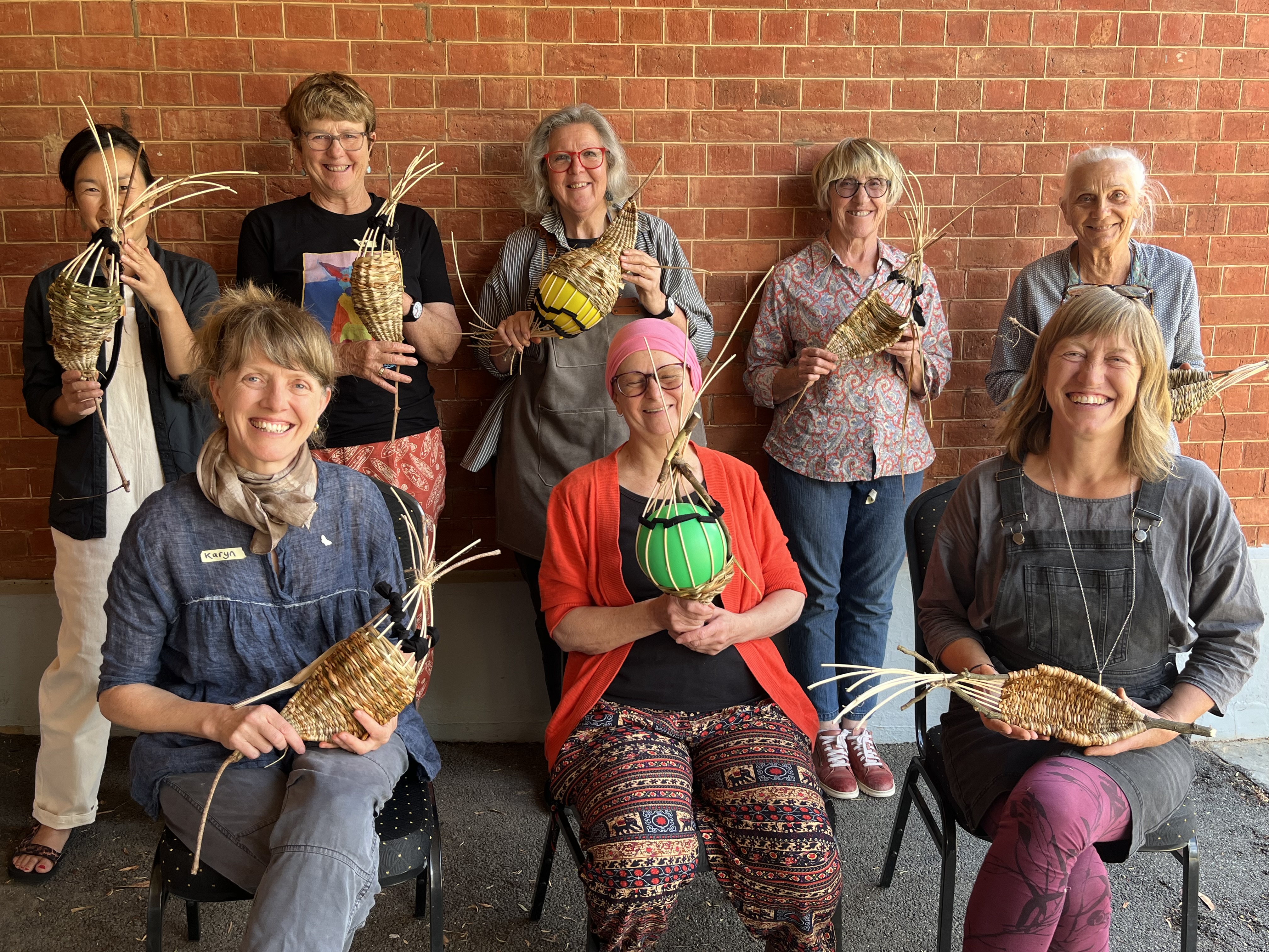 My first workshop of the year was held at Newstead Arts Hub yesterday, Sunday January 21. Great to see so many people keen to learn how to use natural materials such as red hot poker, day lily and Siberian iris to weave decorative boats. The technique used was ribbed construction, weavers were woven above and below the grapevine and cane framework to ‘flesh out’ the surface of the boat.
