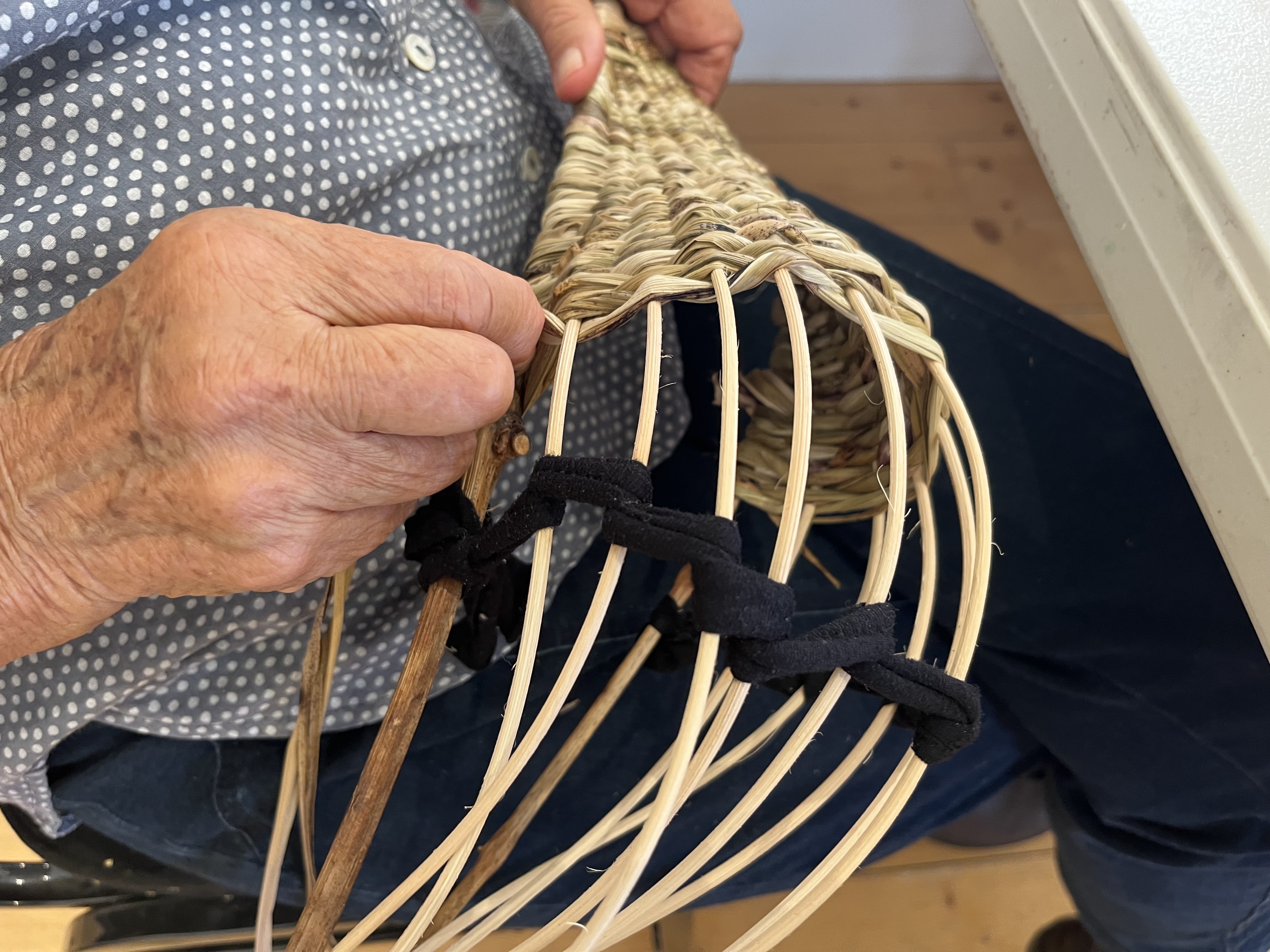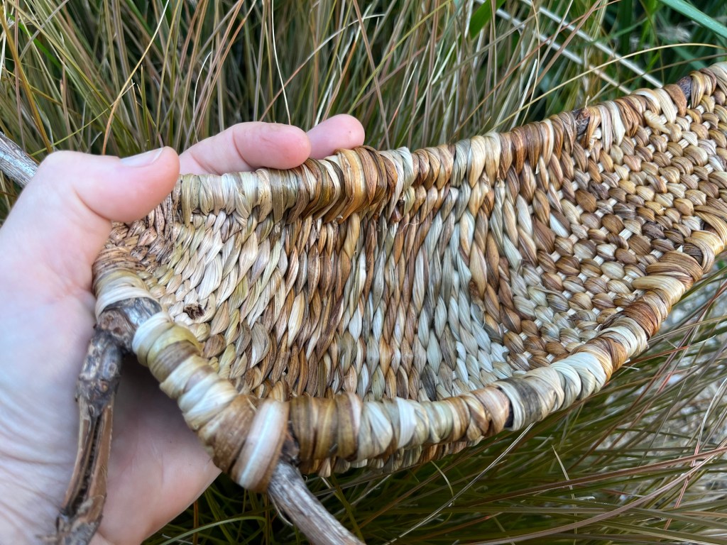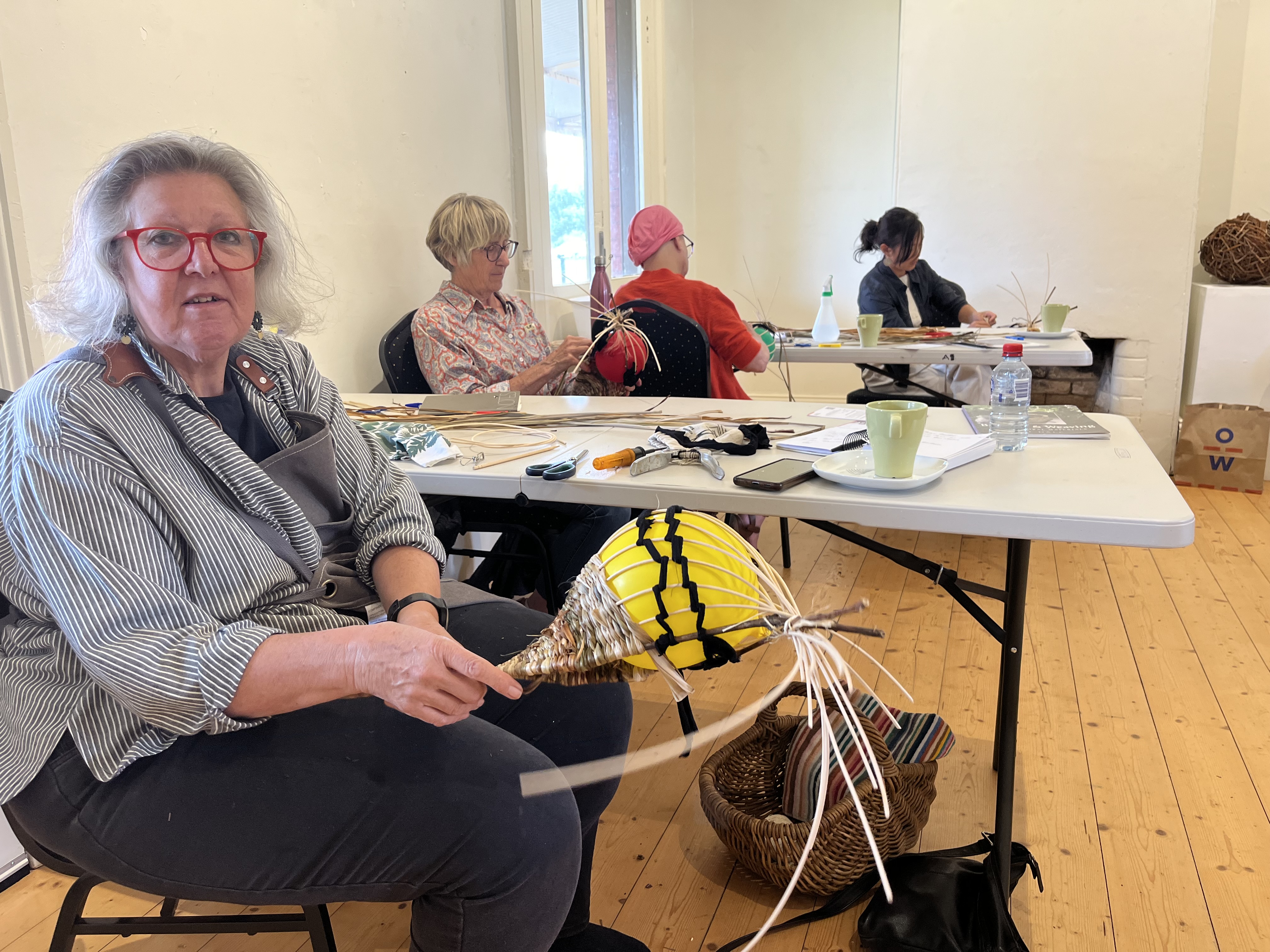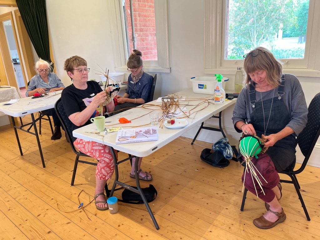 My first workshop of the year was held at Newstead Arts Hub yesterday, Sunday January 21. Great to see so many people keen to learn how to use natural materials such as red hot poker, day lily and Siberian iris to weave decorative boats. The technique used was ribbed construction, weavers were woven above and below the grapevine and cane framework to ‘flesh out’ the surface of the boat.