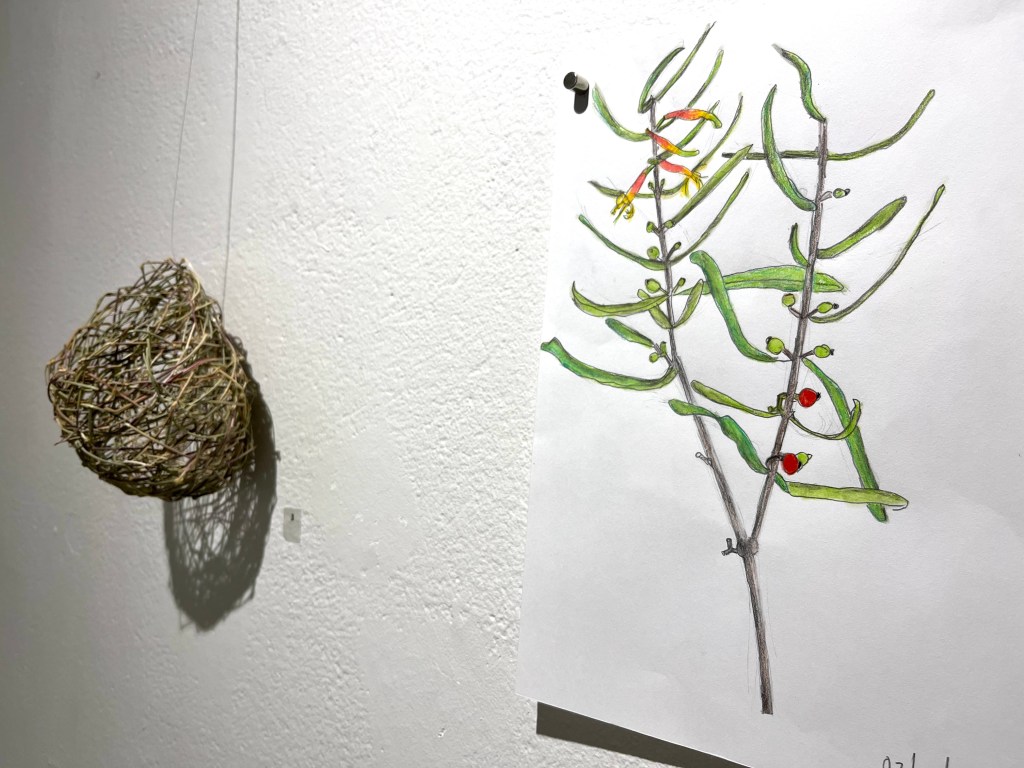 Drawing of Harlequin Mistletoe & Depiction of a dome shaped Mistletoebird nest (couch runners)