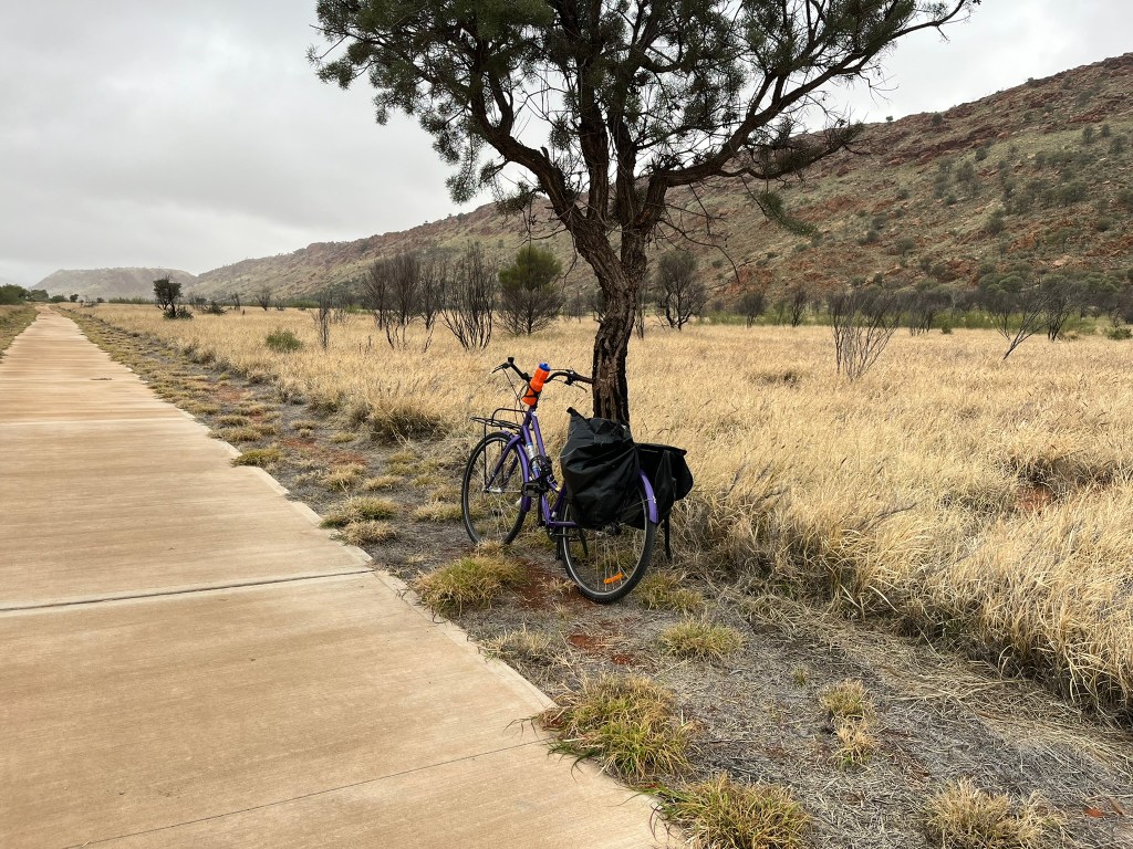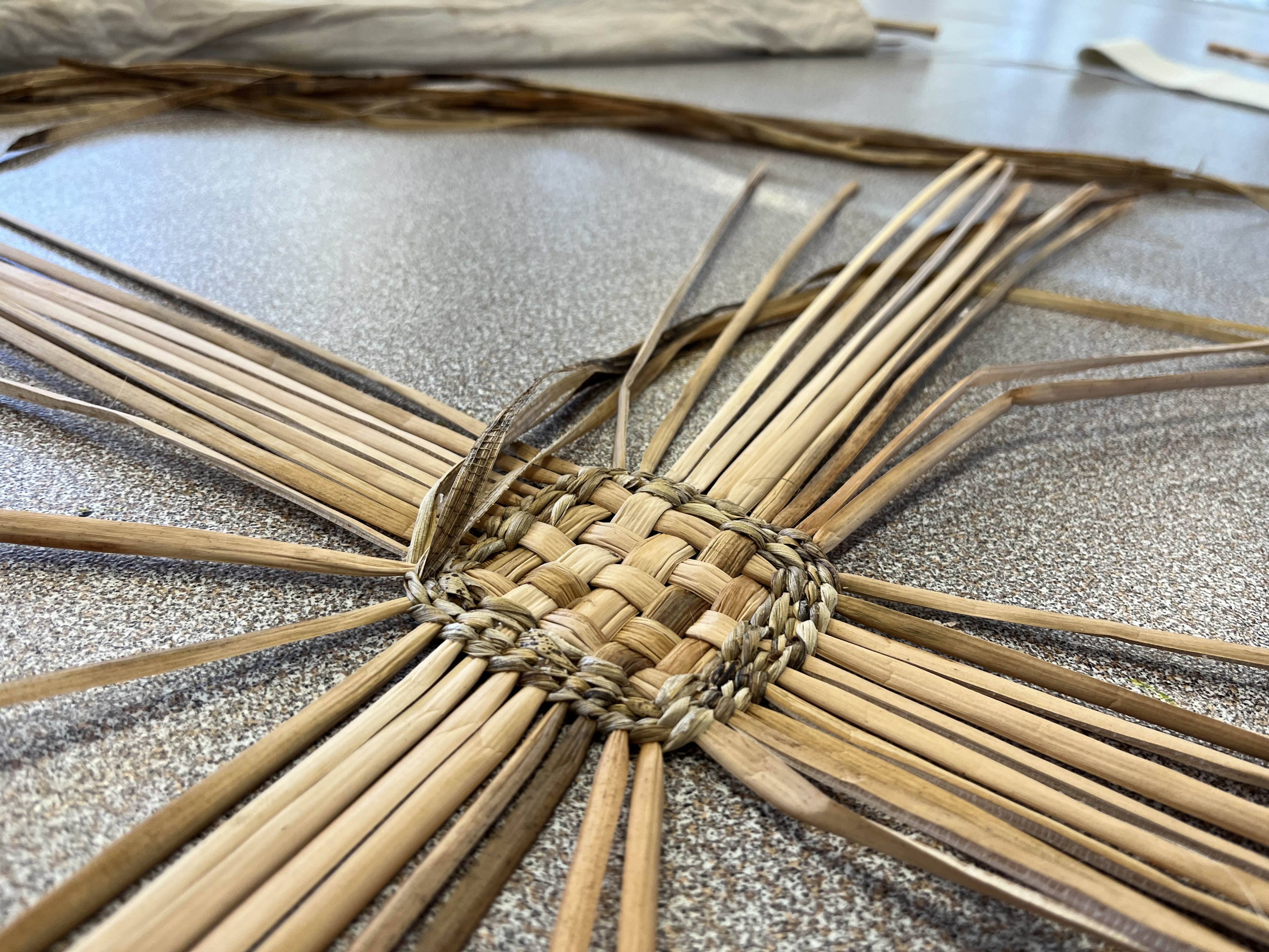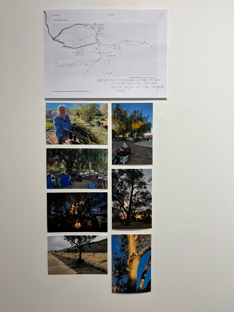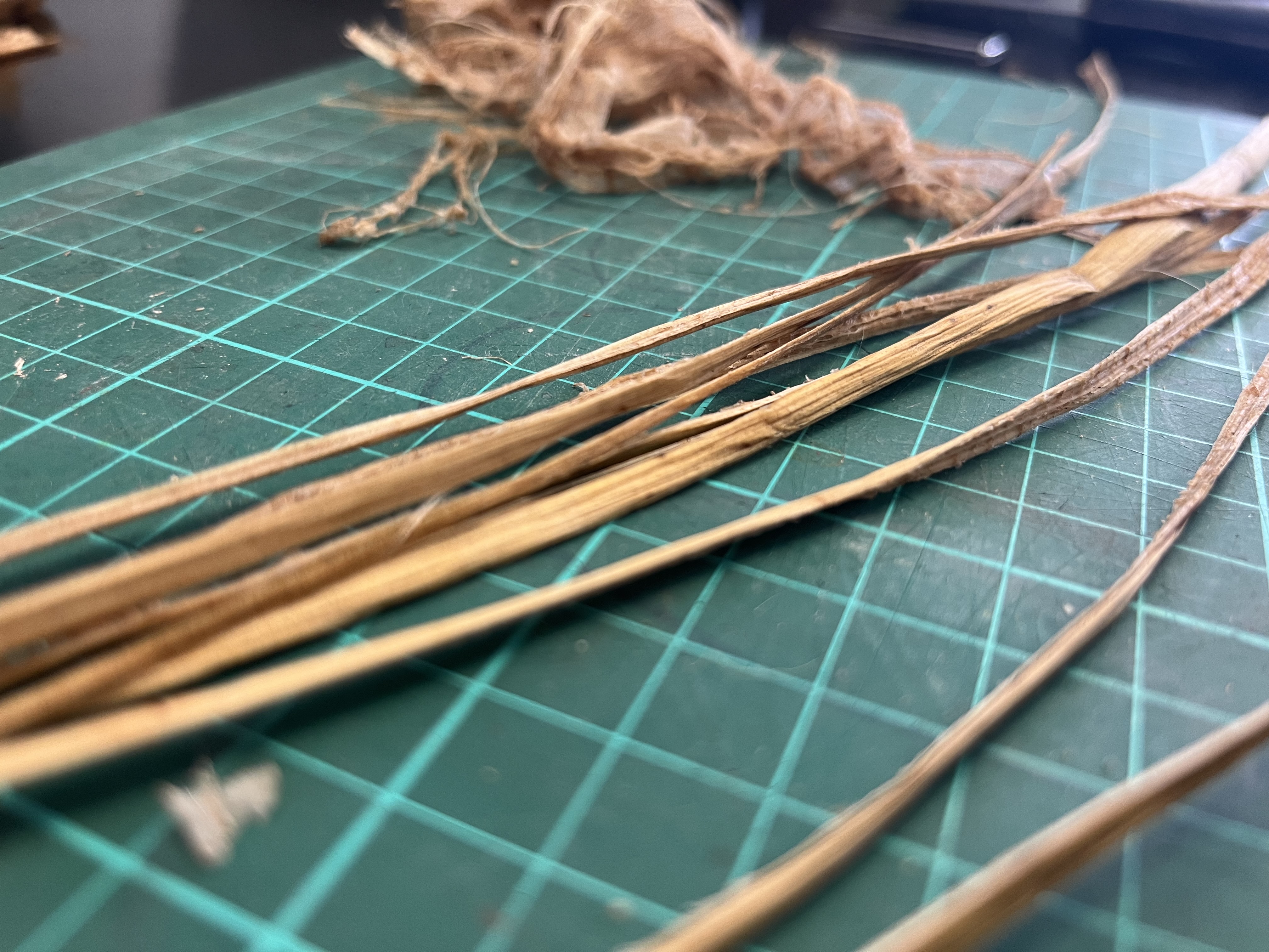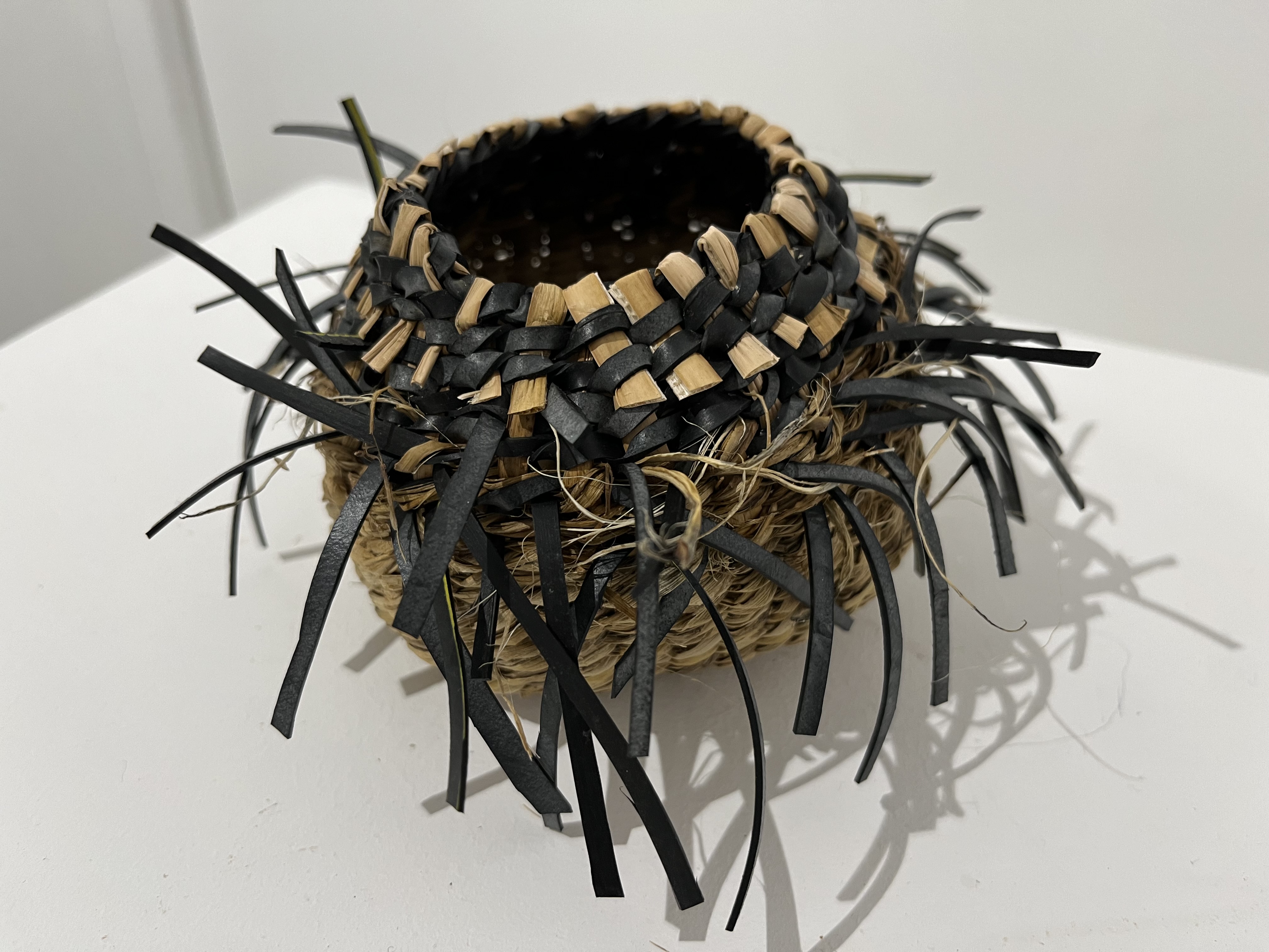 On another day I visited Kaz at her home to speak about her reciprocal relationship with an ancient river red gum. This beautiful tree overlooks her home and is a feature of the borrowed landscape at Ilparpa, where she lives. Please read my conversation with Kaz, that forms part of the research I gathered in Alice Springs as part of my one month art residency at Central Craft. Images support this conversation and both enrich each other. I was pleased with the small ‘hairy’ twined basket made with materials found on my daily bike rides. Combungi, yukka, inner tube of a bike tyre and banana stem from Westside Community Garden are materials used in this basket.