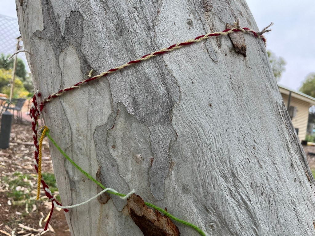 During my residency I went to Working Bees at Eastside Community Garden and met some of the people who have their own plots and who come to help out with the communal growing spaces. When I visited, a new project had been initiated called “Adopt a Tree” where people choose a tree to care for in parkland at the entrance of the garden. This care involves keeping the perimeter of the tree free of buffel and couch grass, through an empowering activity the wider community has embraced called “buffel busting”! String around a tree identifies adoption and the hope is that over time the circles of care at the base of each tree will meet up to create a chain of care protecting these trees from the heat of buffel fire…
