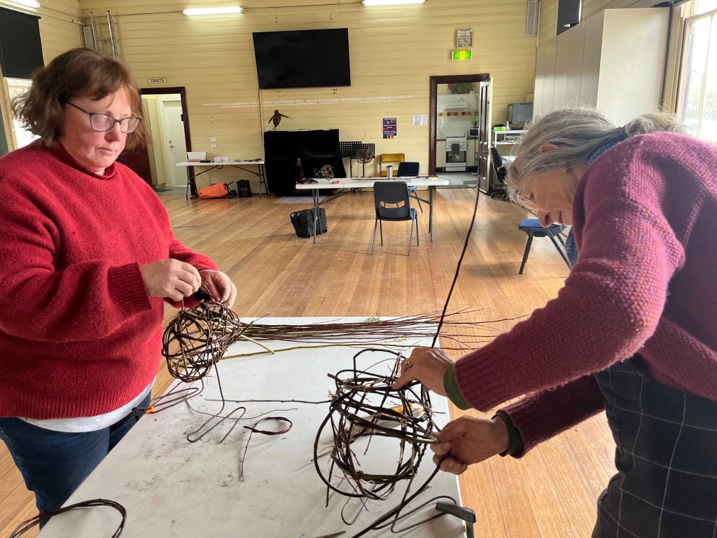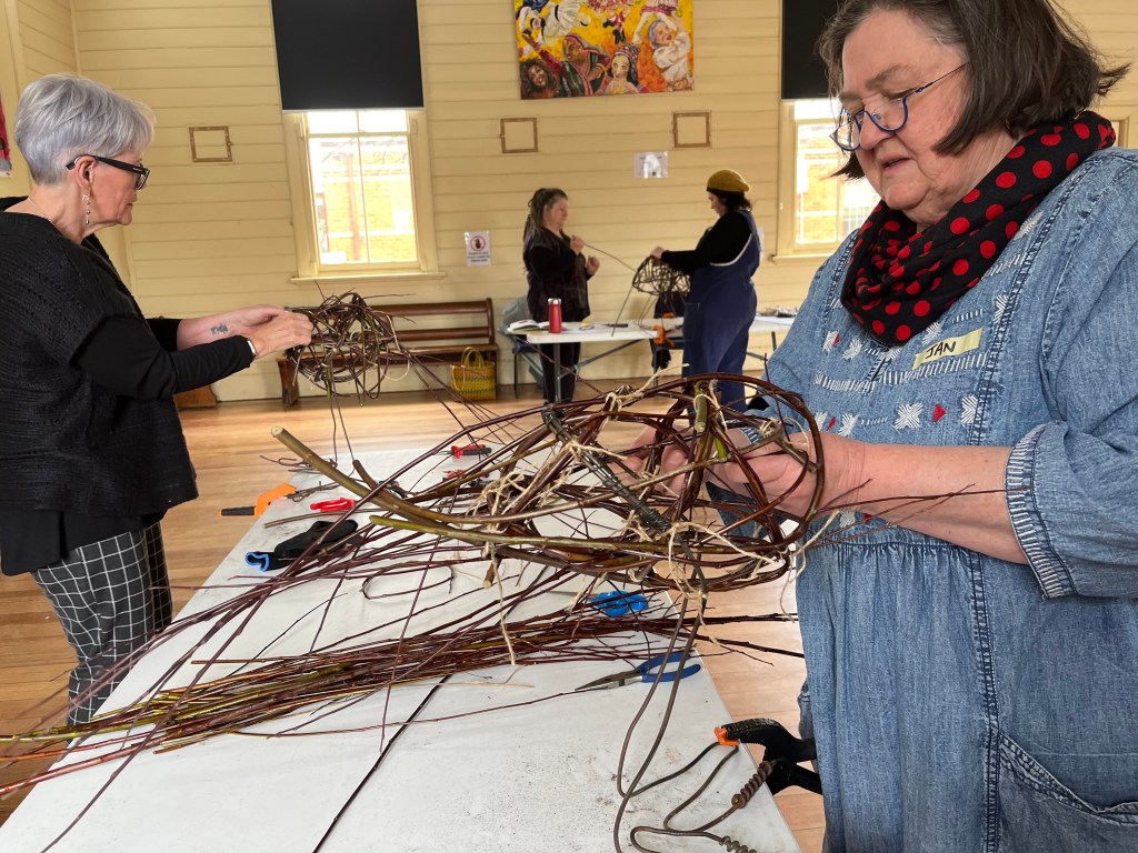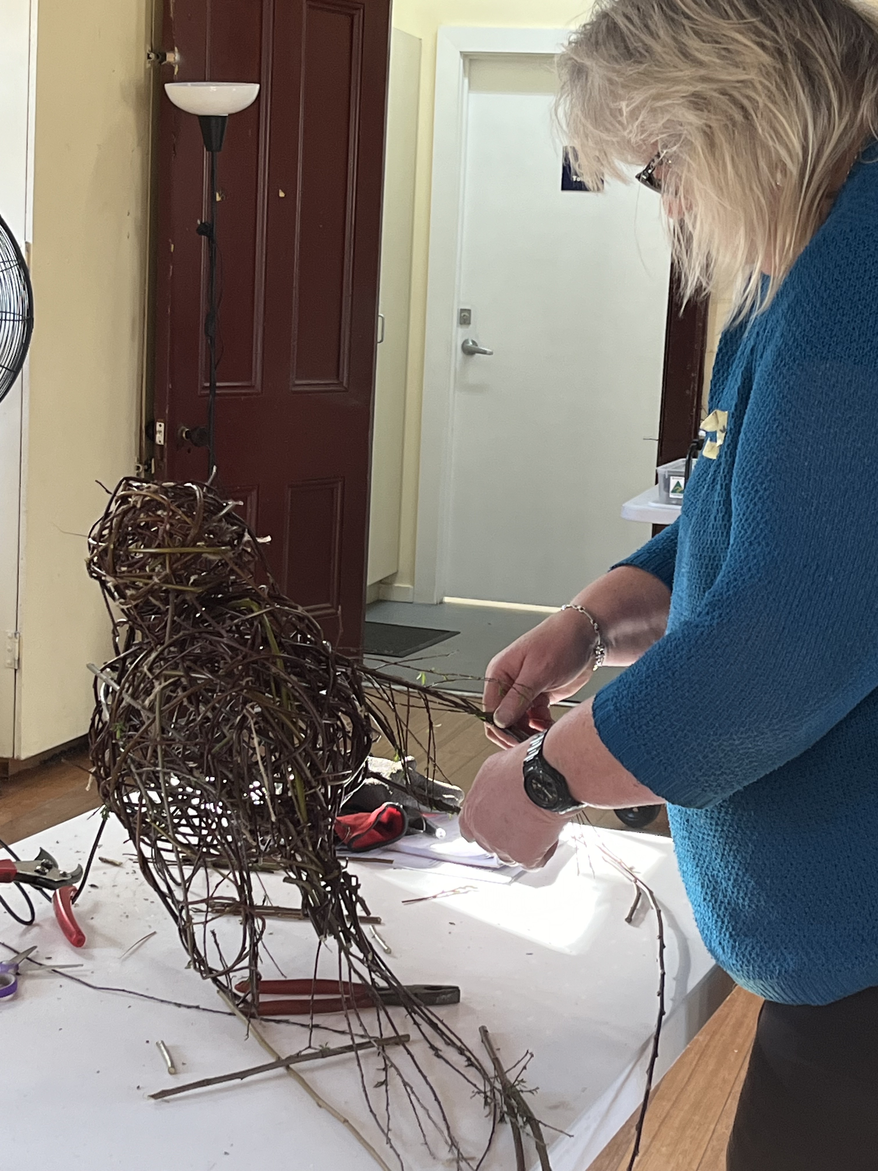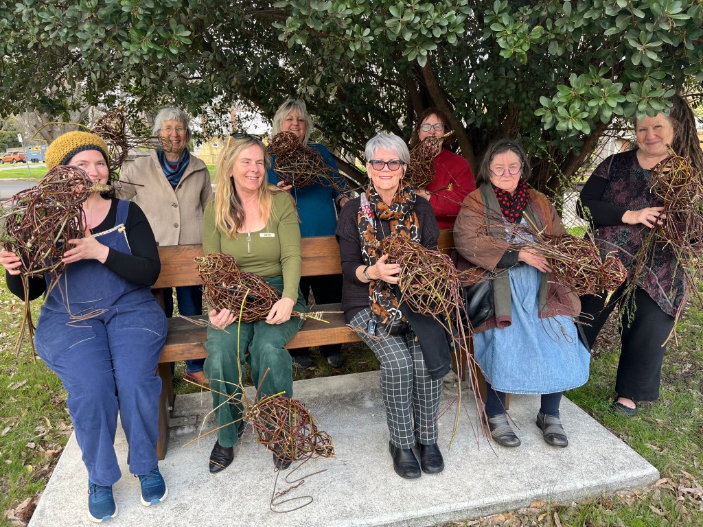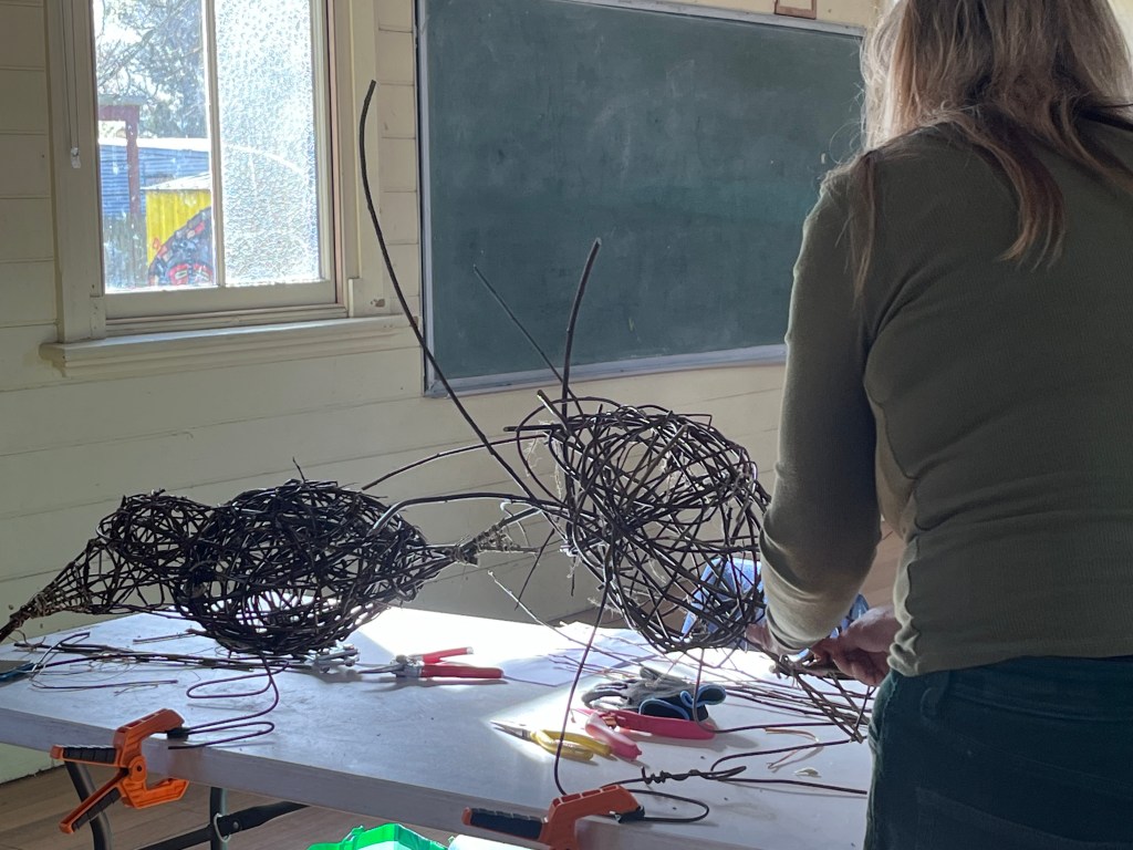 Yesterday was an extremely cold day, a group of us kept our hands busy and warm by weaving birds from wild willow. To start, recycled fencing wire was shaped to create feet, legs and a basic framework for the birds. Participants then learned and applied sculptural skills to make a willow framework before weaving into it using the basketry technique of random weaving. Heads, wings and tails were added after lunch to make the birds come alive!