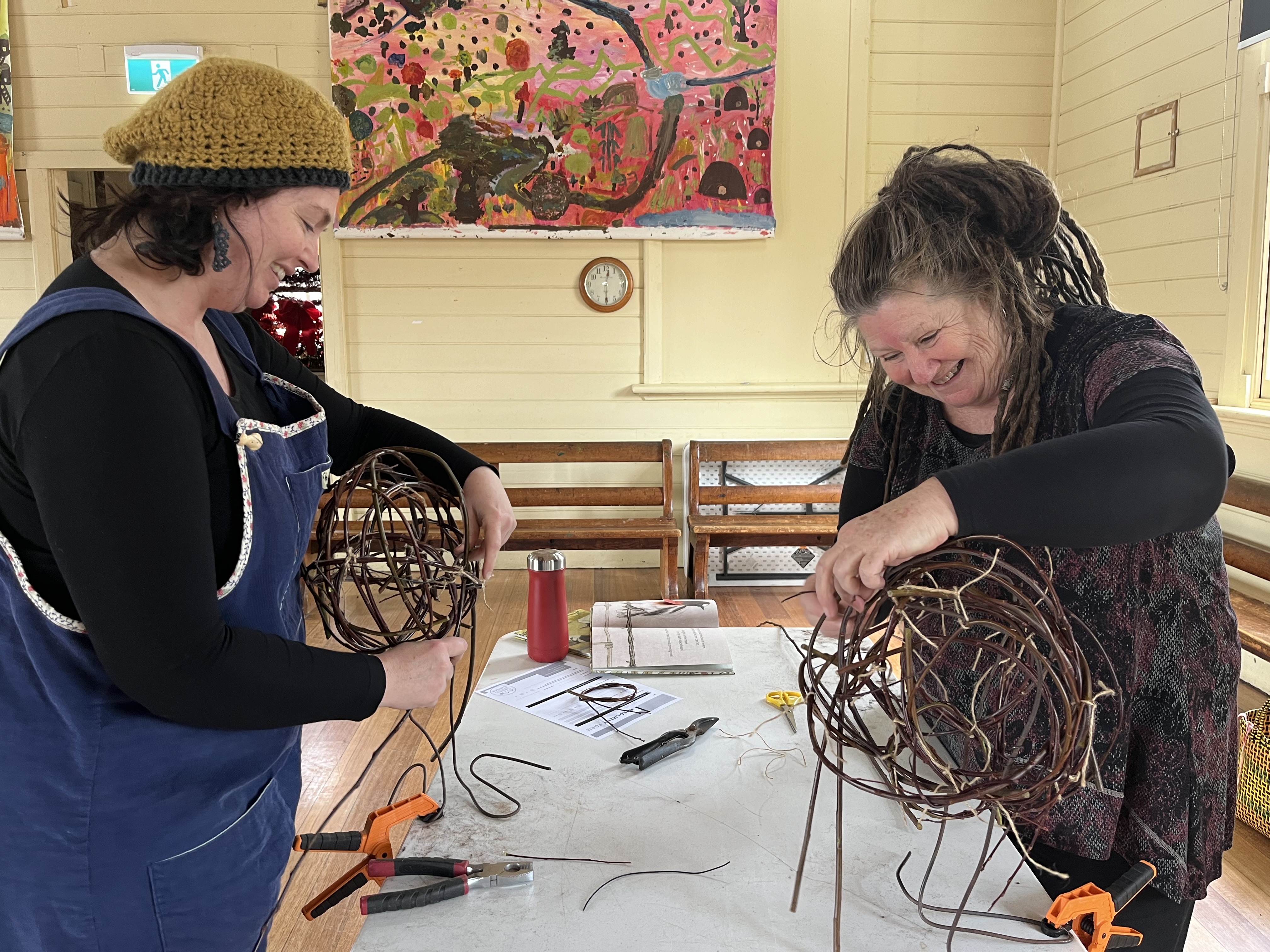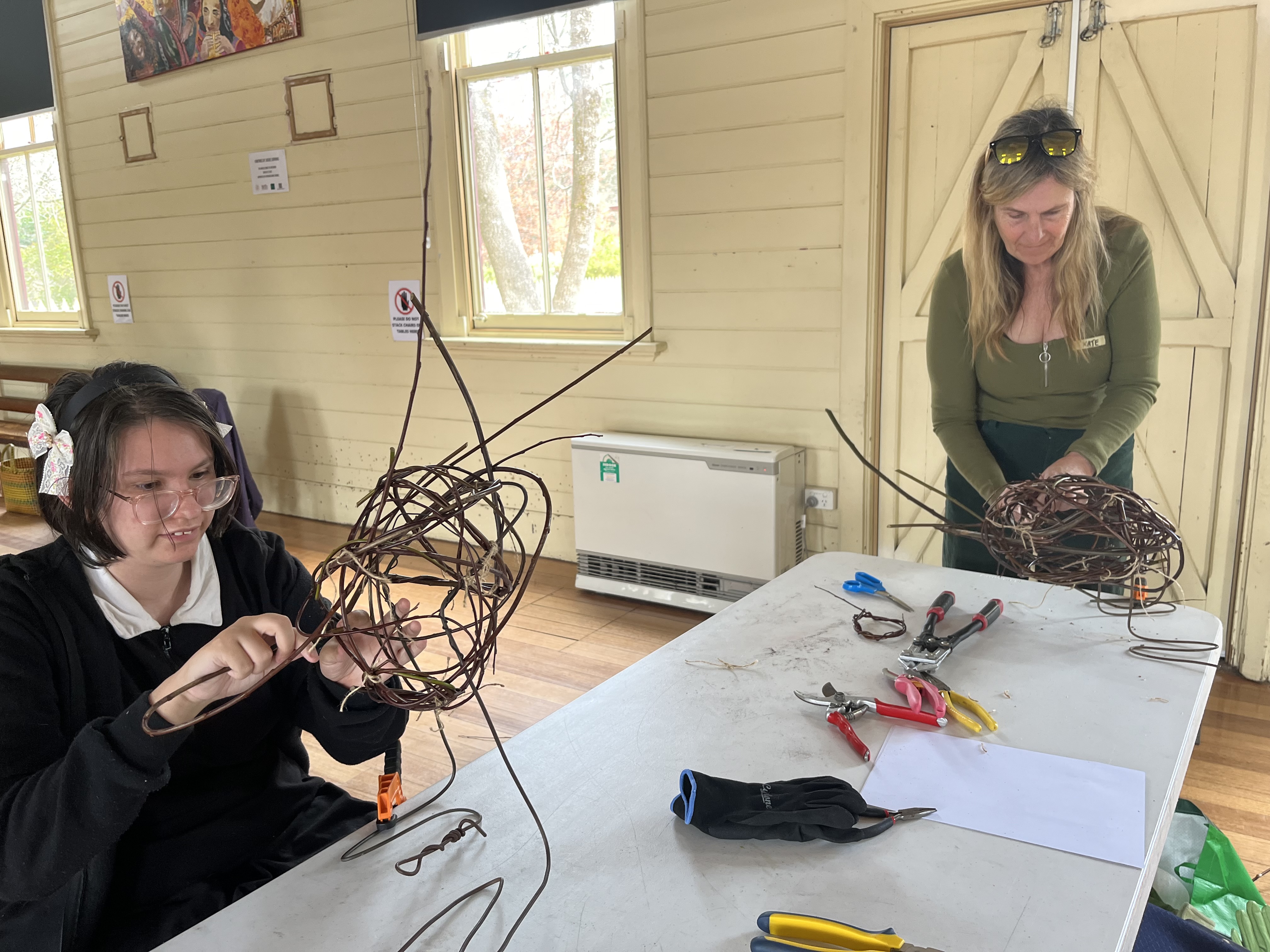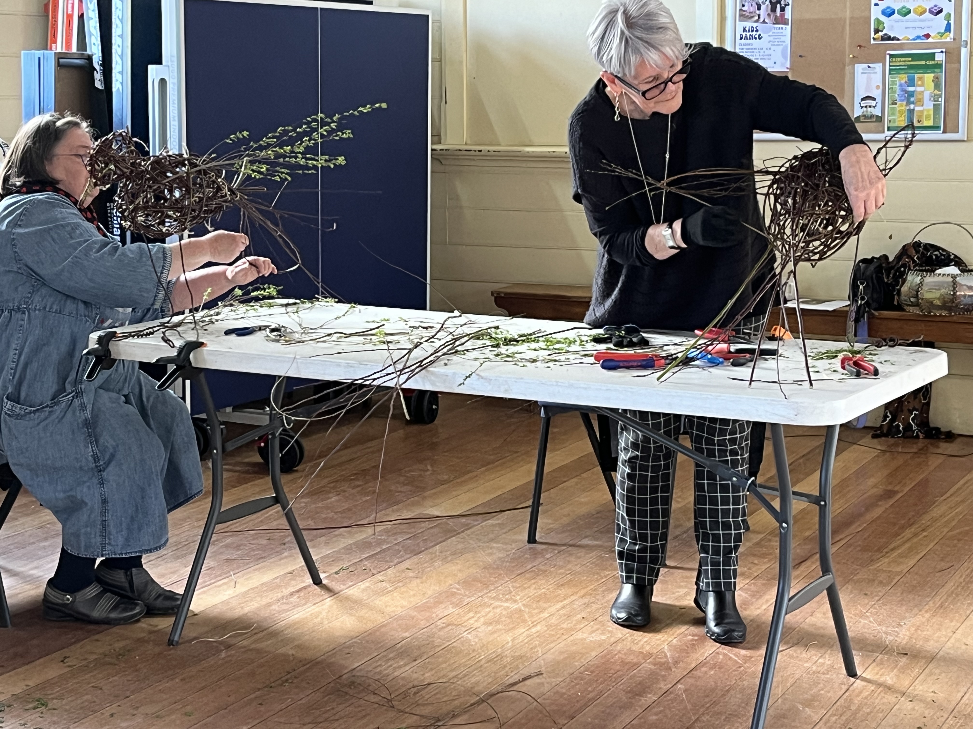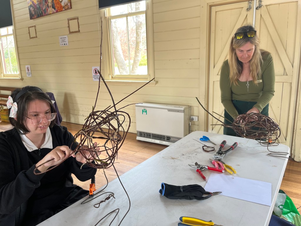 Yesterday was an extremely cold day, a group of us kept our hands busy and warm by weaving birds from wild willow. To start, recycled fencing wire was shaped to create feet, legs and a basic framework for the birds. Participants then learned and applied sculptural skills to make a willow framework before weaving into it using the basketry technique of random weaving. Heads, wings and tails were added after lunch to make the birds come alive!