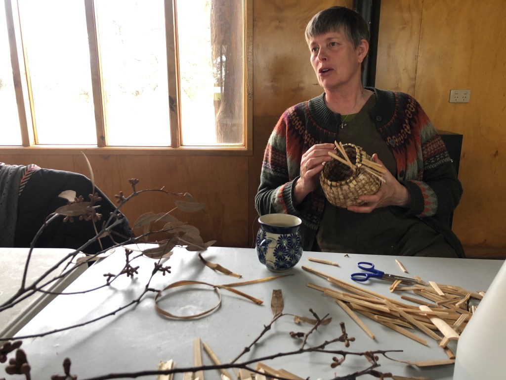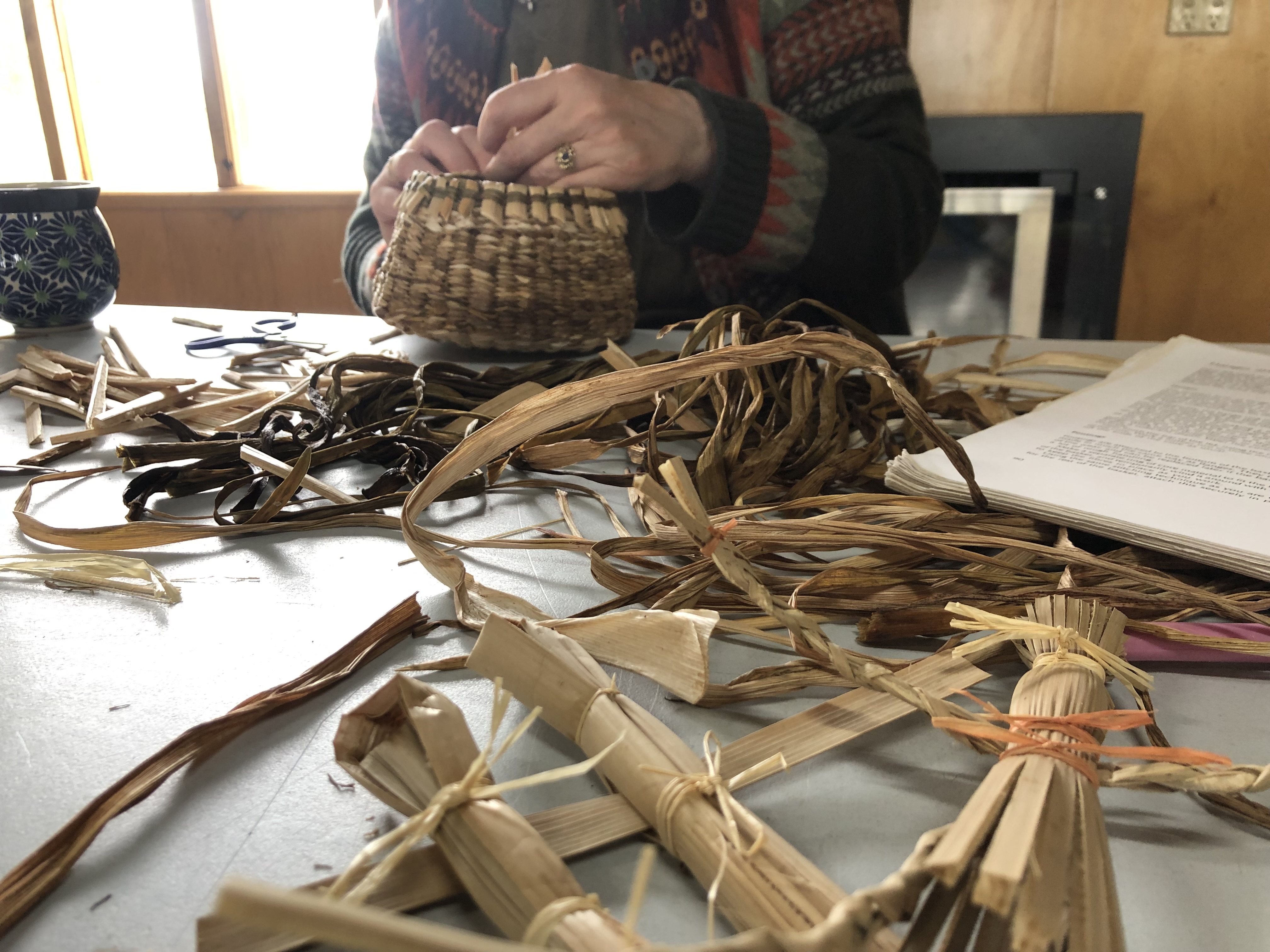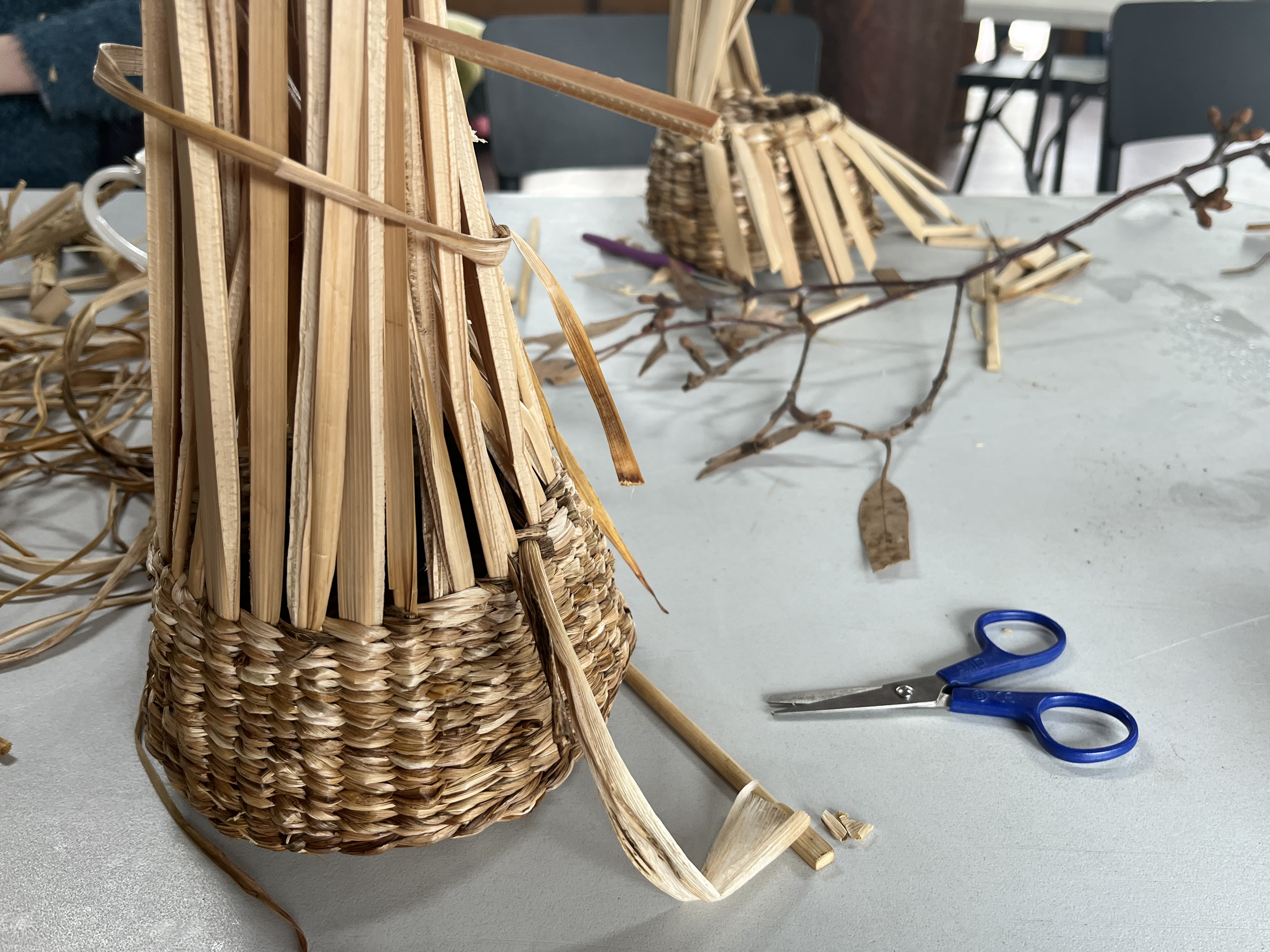 See pictures below from Stitching the Sacred (Weaving Camp) including a portrait of myself with a special gift from the organisers (Shalome and Bianca). A beautiful rosary necklace featuring hand made beads of rose petals, lavender and hawthorn wood. Participants all made made twined baskets from combungi bullrush spokes and daylily and jonquil weavers. Some challenged themselves further by making a second basket from flax spokes and red hot poker weavers.