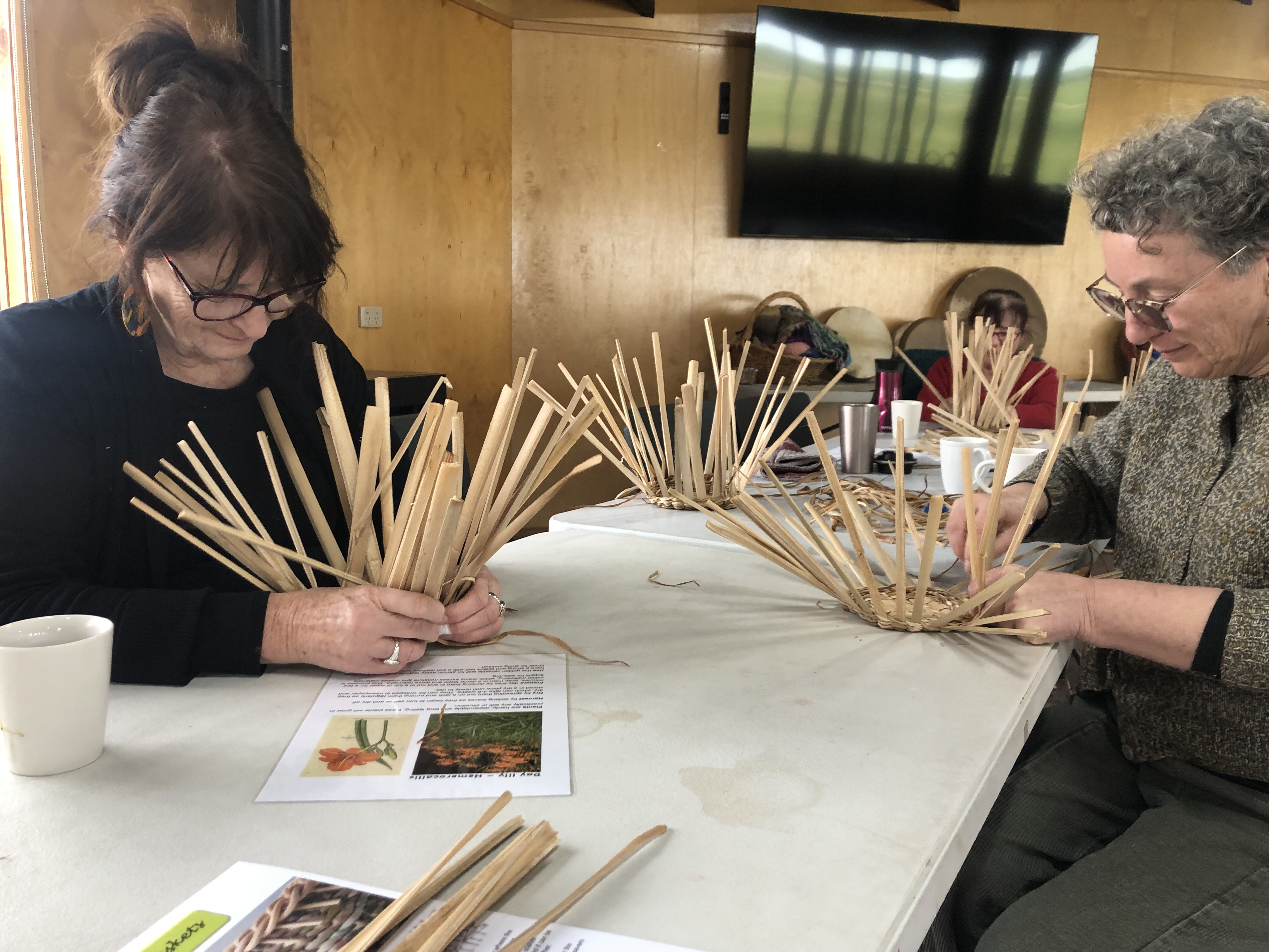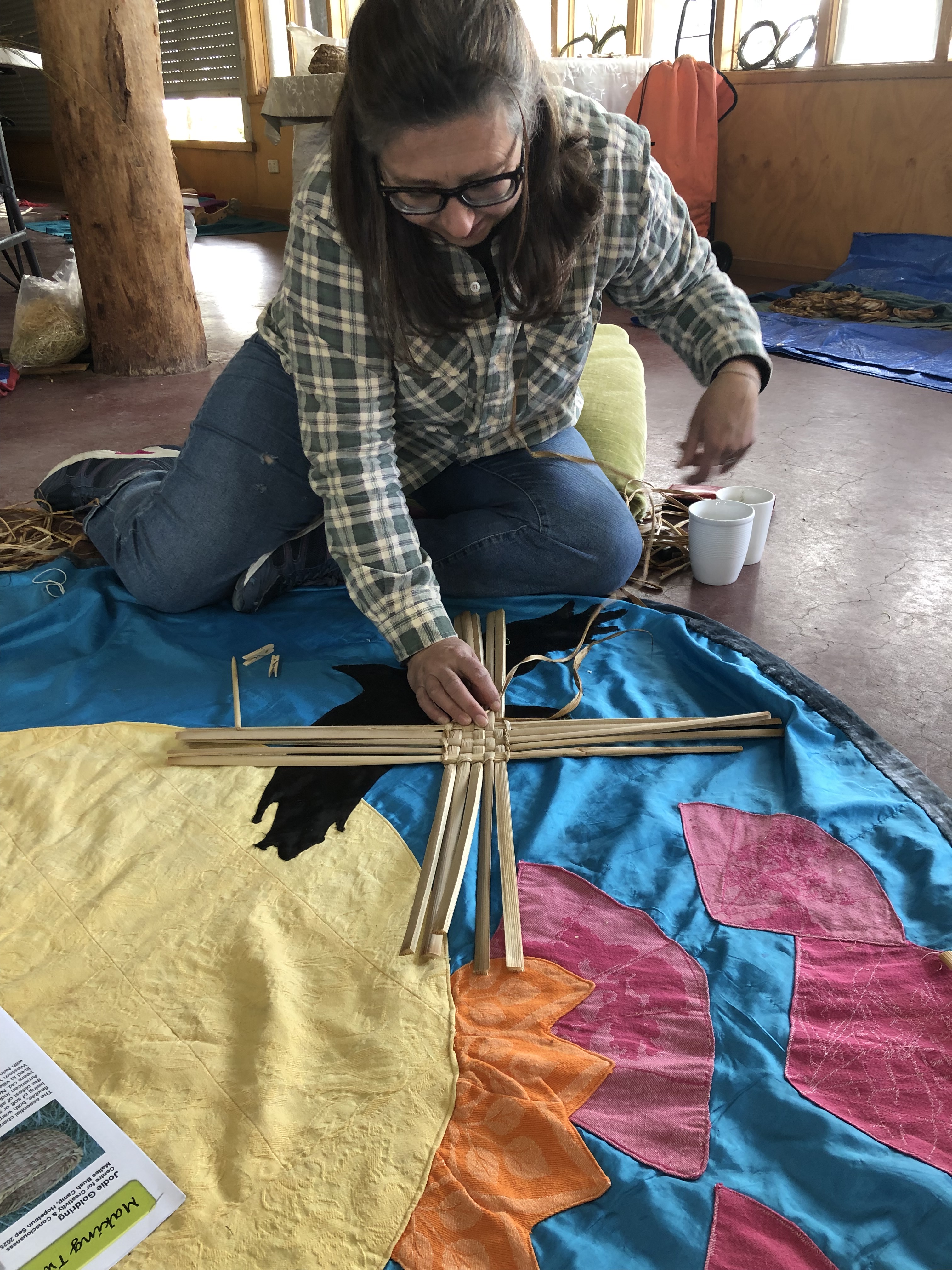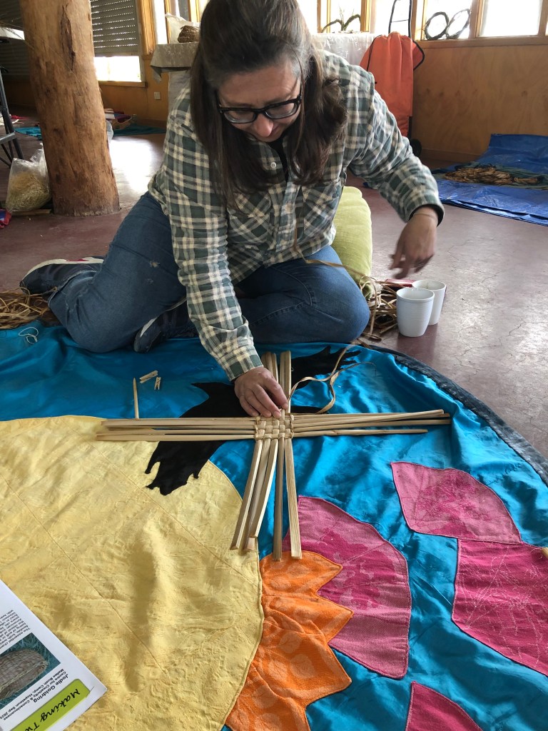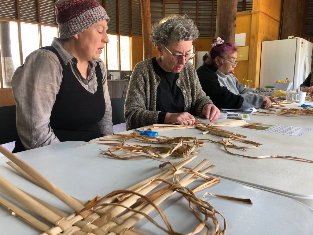 See pictures below from Stitching the Sacred (Weaving Camp) including a portrait of myself with a special gift from the organisers (Shalome and Bianca). A beautiful rosary necklace featuring hand made beads of rose petals, lavender and hawthorn wood. Participants all made made twined baskets from combungi bullrush spokes and daylily and jonquil weavers. Some challenged themselves further by making a second basket from flax spokes and red hot poker weavers.
