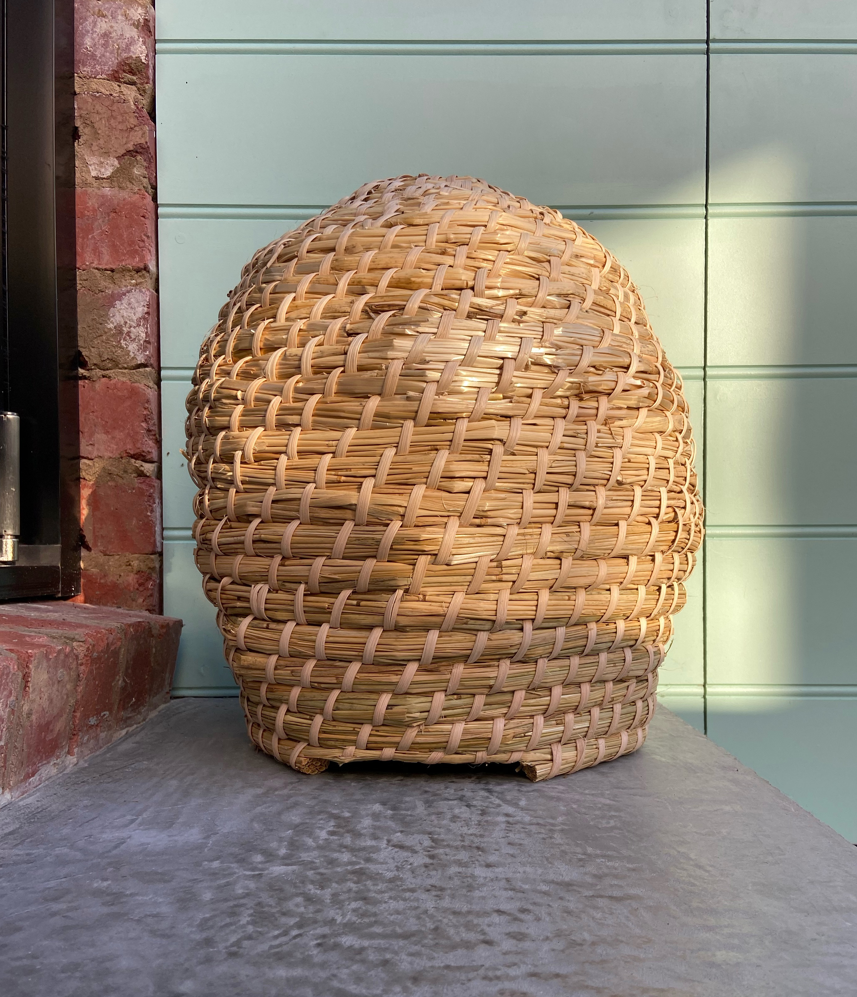 In July 2018 I facilitated my first bee skep workshop for The Beekeepers Club in Melbourne. It was run over a weekend and participants worked very hard to create impressive work. Everyone was new to basketry techniques but managed to create strong skeps by controlling fibres that are quite hard on the hands. I was delighted by the ambition, perseverance and determination of the beekeepers who wanted the skeps for a myriad of reasons. Some of the participants will use their bee skep to catch swarms before transferring the bees into their wood box hives. Others will display their skeps and use them as conversation starters about the history of beekeeping. And of course there is always someone innovative who gets inspired to do something unique…like line their skep with felt, create a custom made entrance and use it as a cat bed…lets hope the cat likes it!!