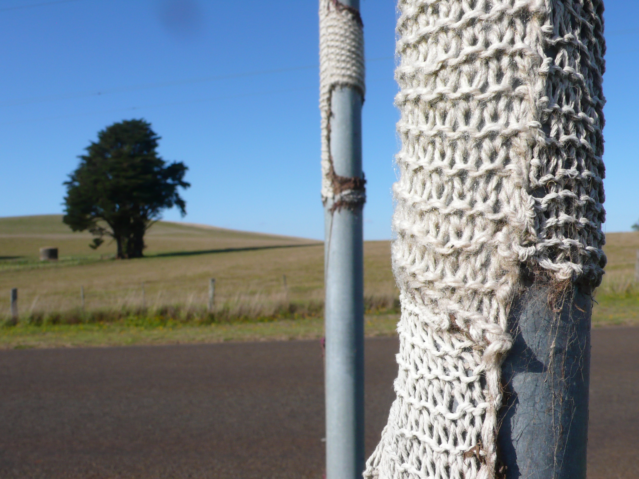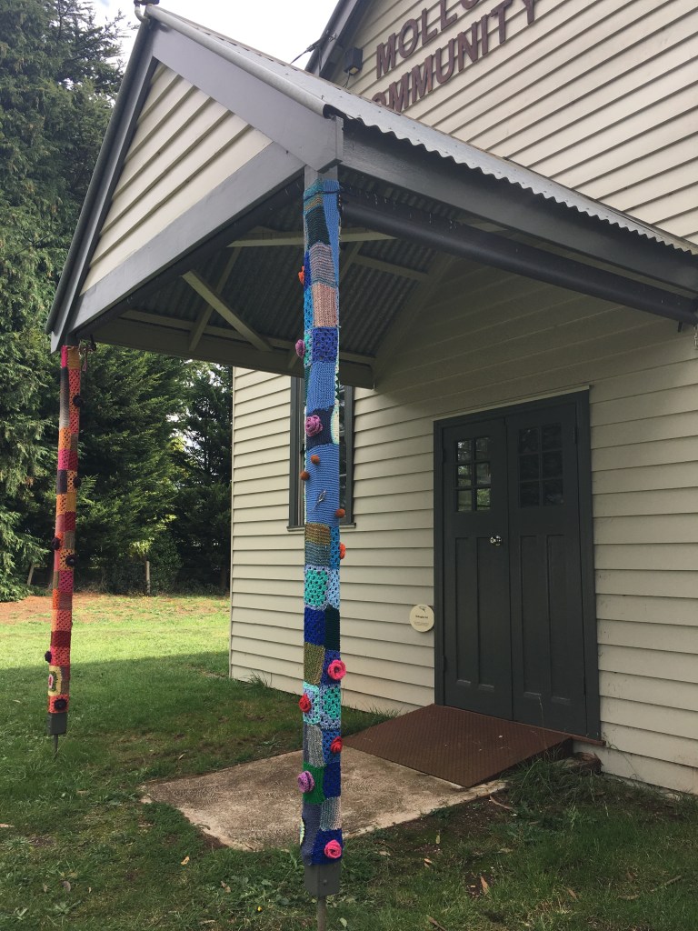 I learned to knit squares in the winter of 2016 and while practicing made quite a few! The extended cold and wet weather encouraged me to stay indoors and knit. I have always enjoyed the colourful fun that is graffiti knitting, so I decided to start a community project which entails yarn bombing the small hamlet of Mollongghip in the Central Highlands of Victoria….