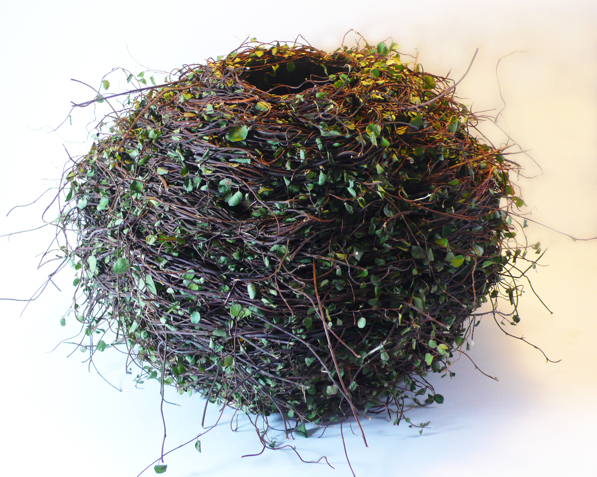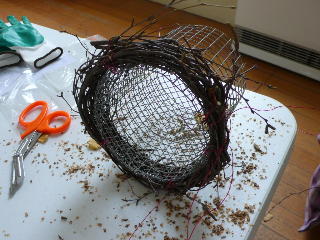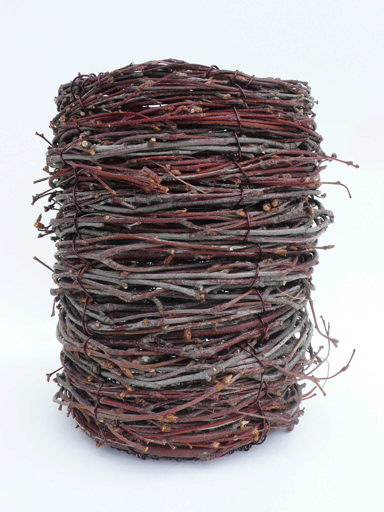 Participants learn how to use metal mesh or chicken wire to construct a basic form such as a cylinder or sphere. Pliable branches or vines are then lashed to the framework to create a sculptural basket. In basketry, lashing is a technique used to hold things in place securely. In this case copper wire is used to lash natural materials in a spiralling motion around the metal framework. These baskets can be used as functional vessels and will add natural charm to a home or garden. Not strictly a basket or a sculpture this form breaks with convention and opens up new possibilities for making forms.
