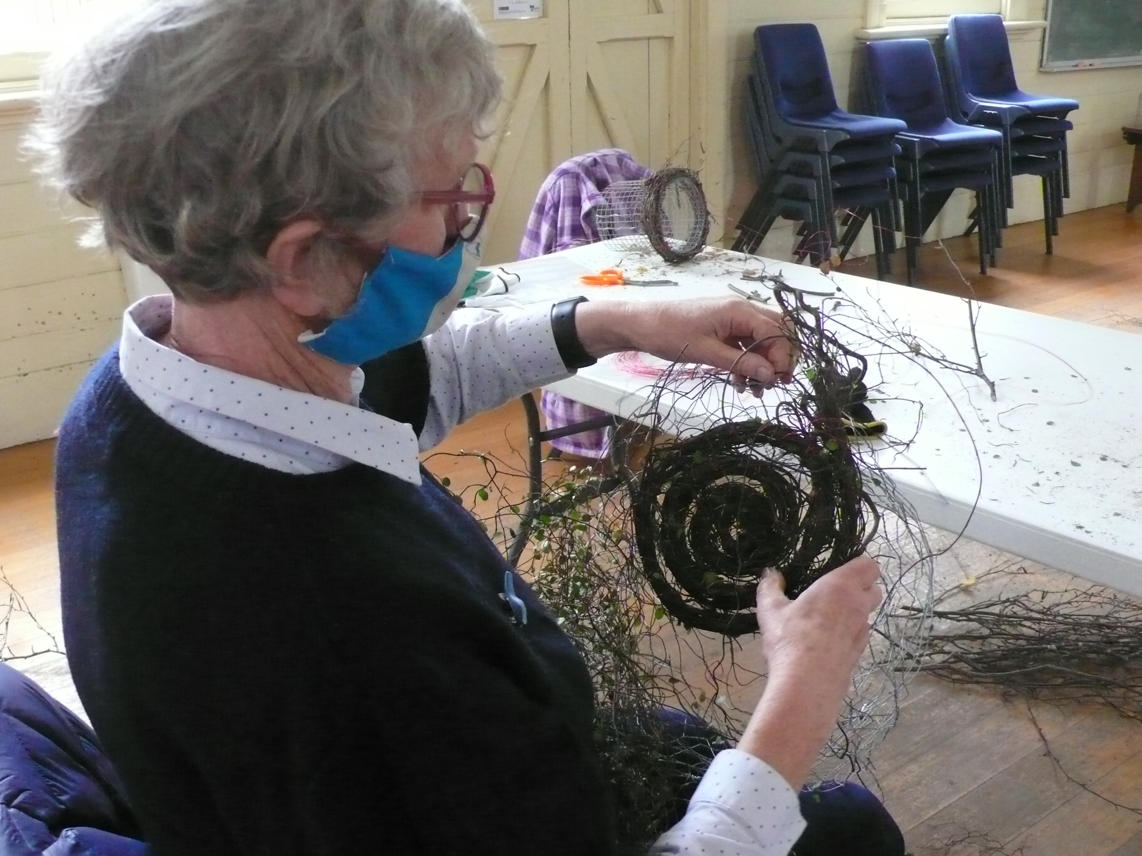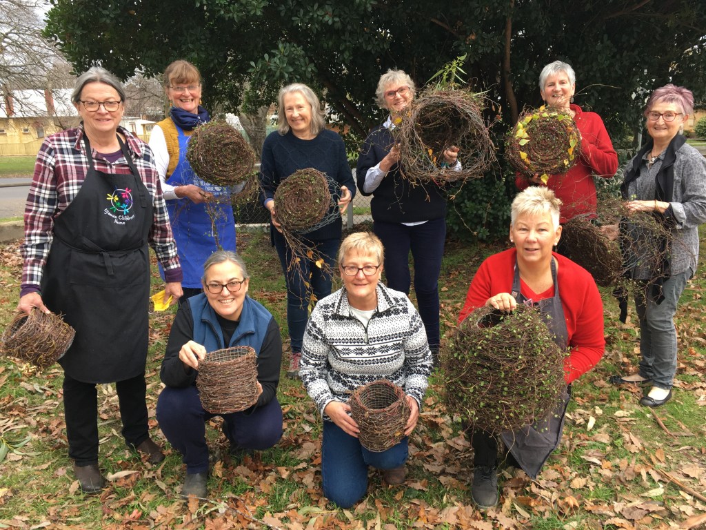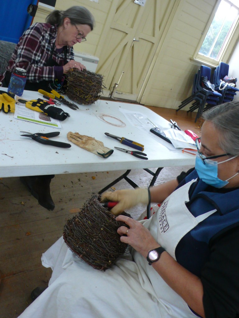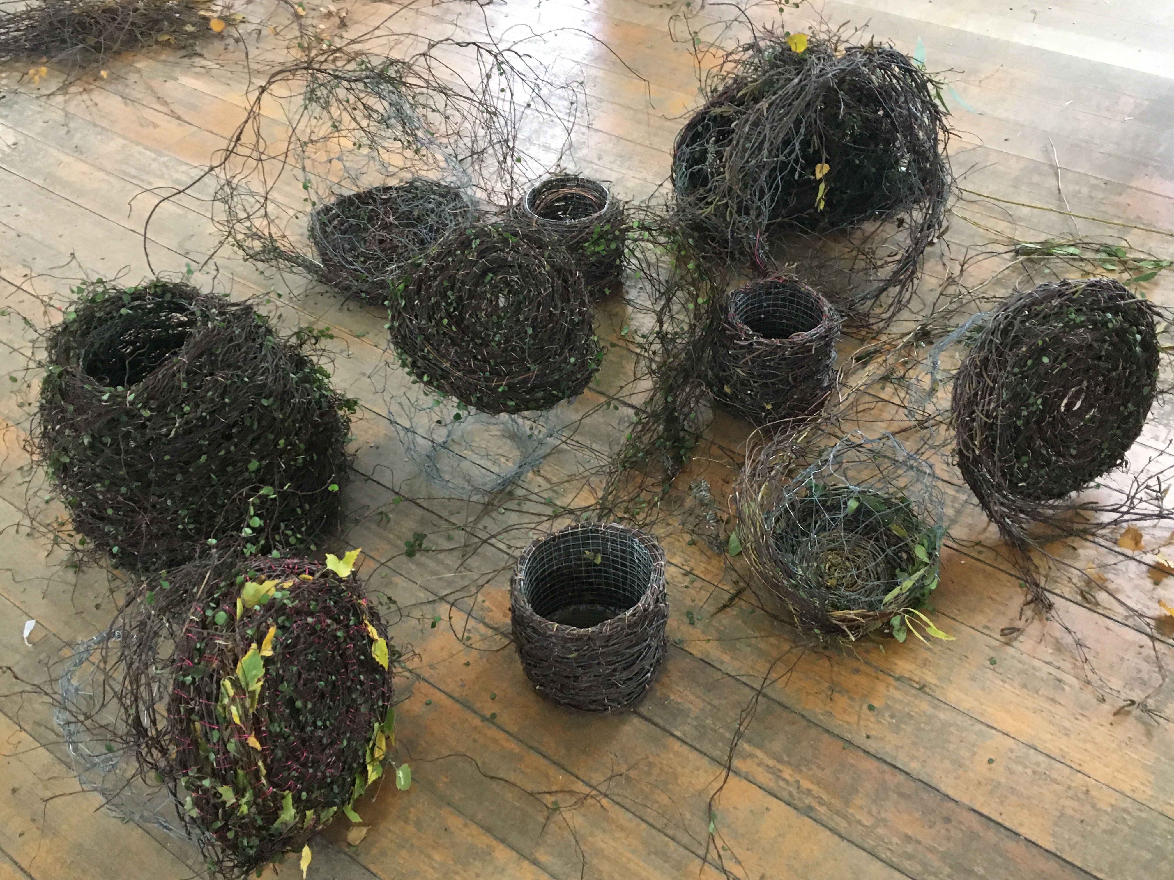 Participants learn how to use metal mesh or chicken wire to construct a basic form such as a cylinder or sphere. Pliable branches or vines are then lashed to the framework to create a sculptural basket. In basketry, lashing is a technique used to hold things in place securely. In this case copper wire is used to lash natural materials in a spiralling motion around the metal framework. These baskets can be used as functional vessels and will add natural charm to a home or garden. Not strictly a basket or a sculpture this form breaks with convention and opens up new possibilities for making forms.